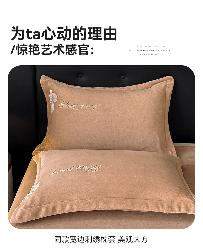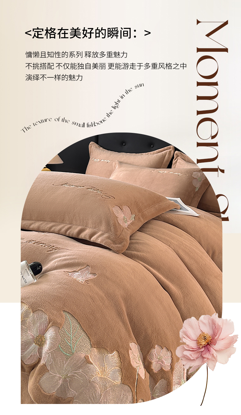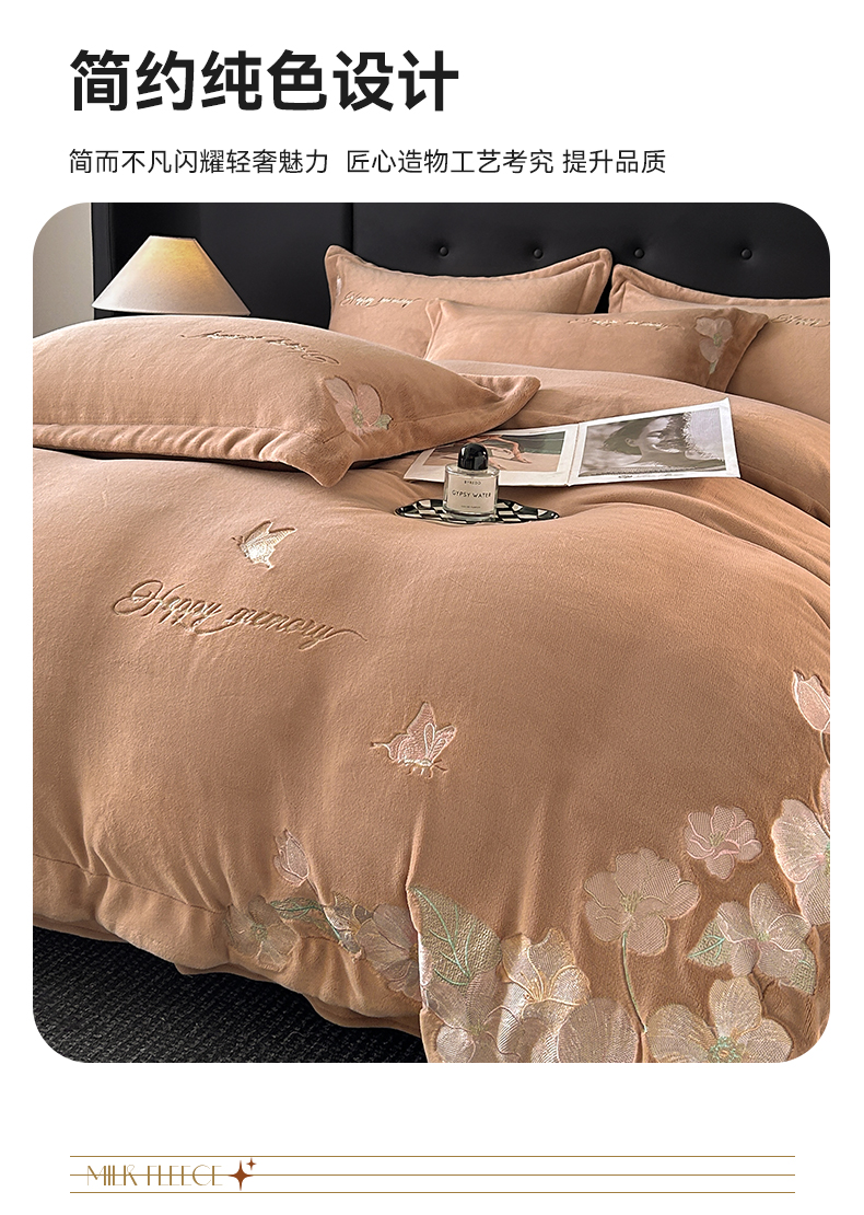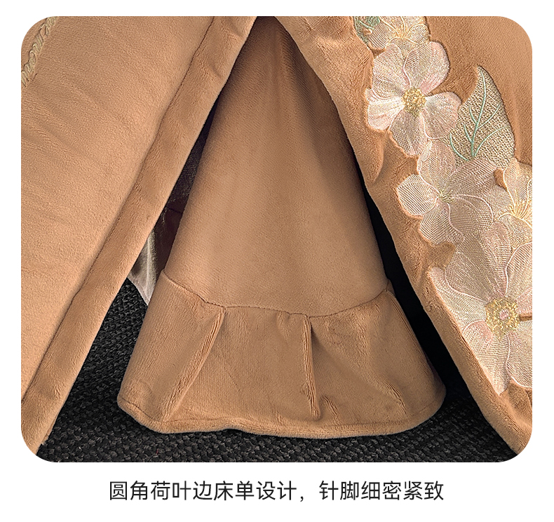 恋绒家纺 2025新款牛奶绒刺绣四件套-花舞 轻奢咖