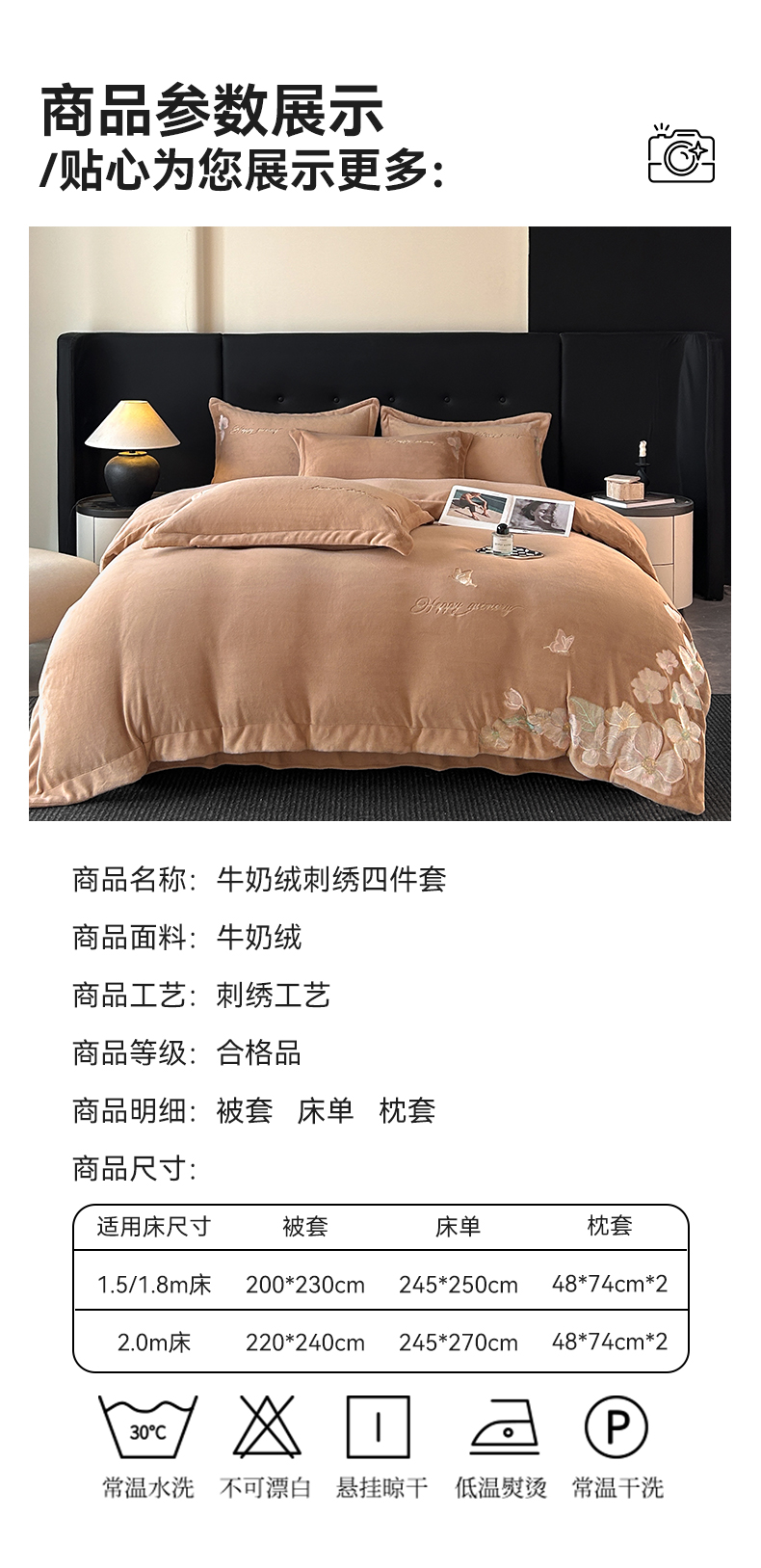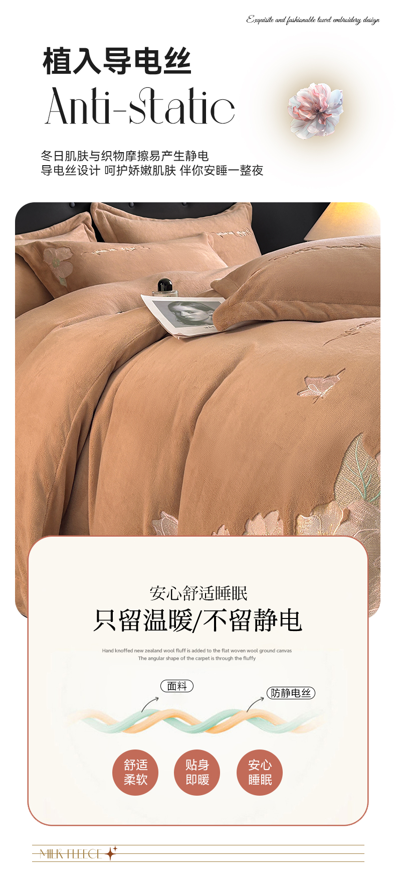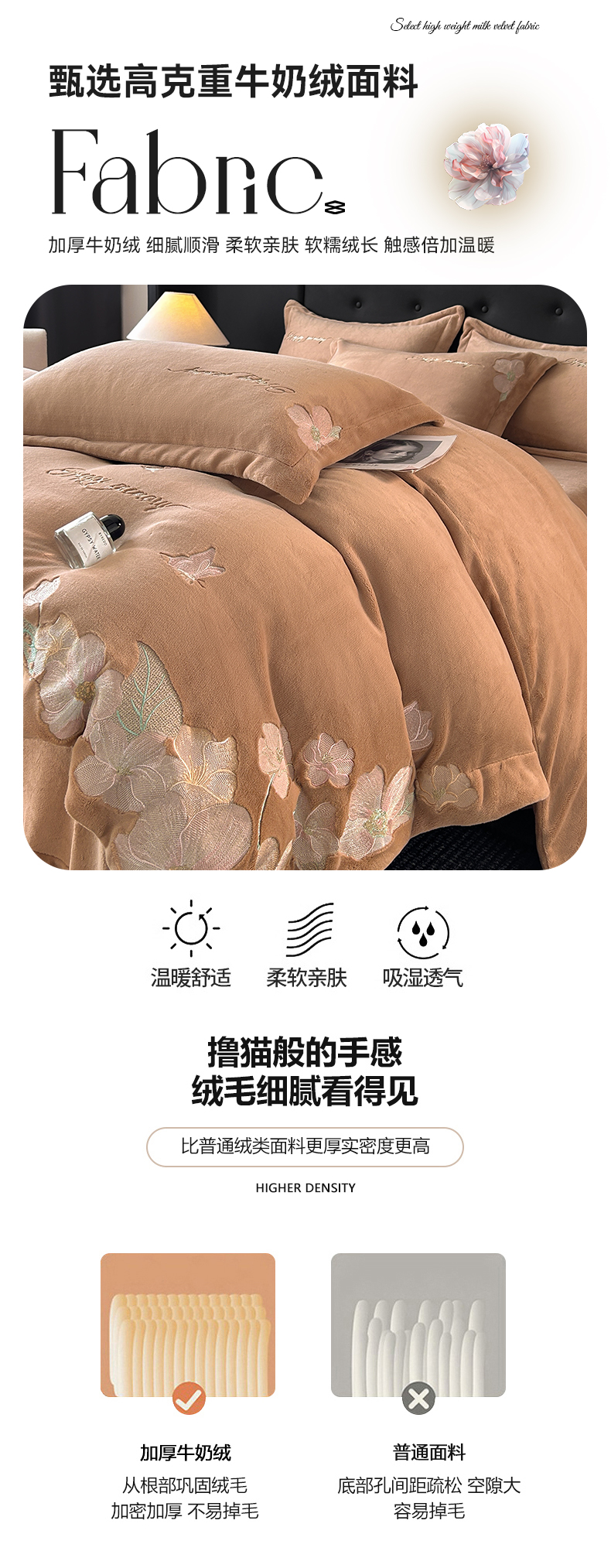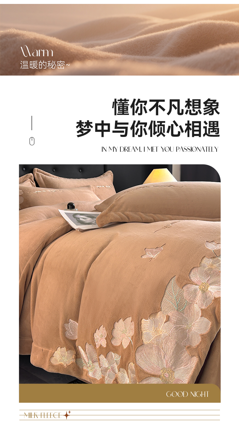 商品名称:恋绒家纺 2025新款牛奶绒刺绣四件套-花舞 轻奢咖
