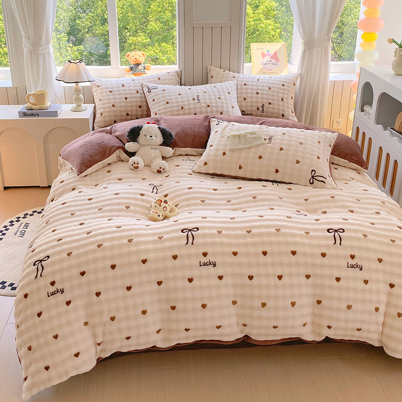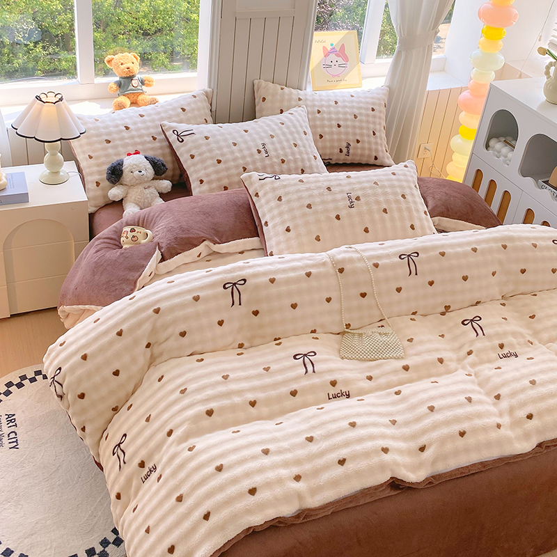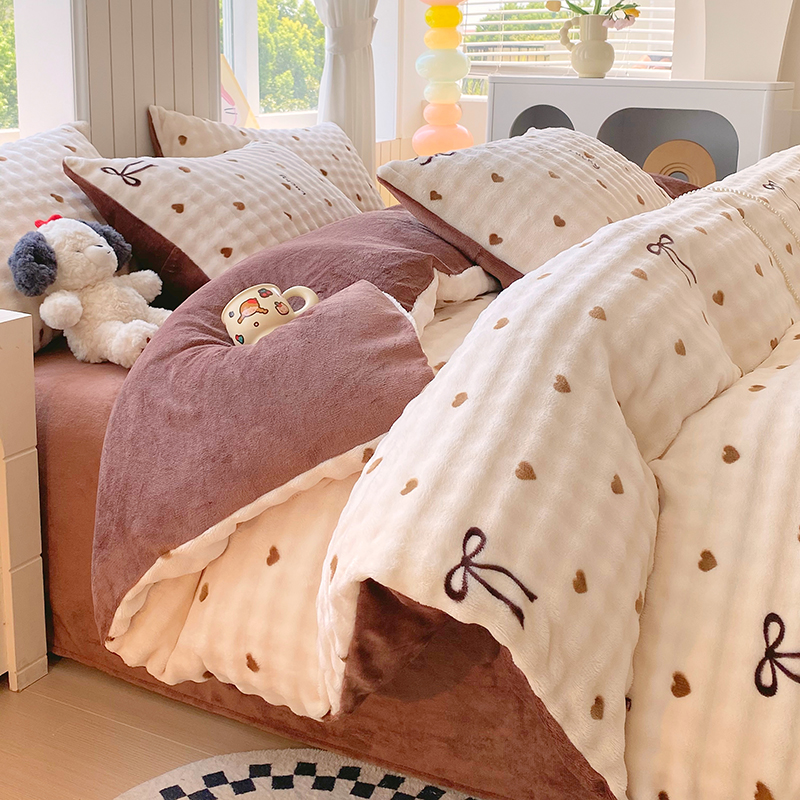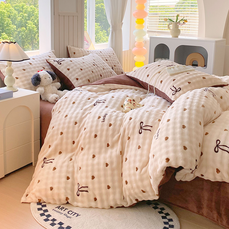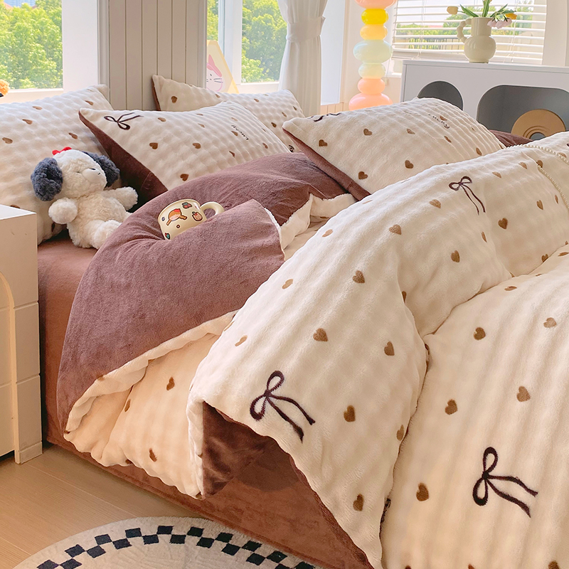 当前位置: 91家纺网 > 商品网购 > 床品套件 > 四件套 > 牛奶绒四件套 > 艾橙 2025新款泡泡牛奶绒加厚保暖印花四件套 爱心蝴蝶结-咖