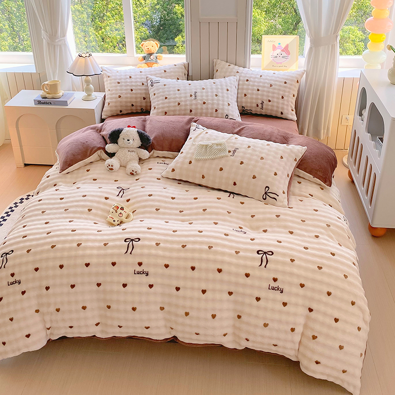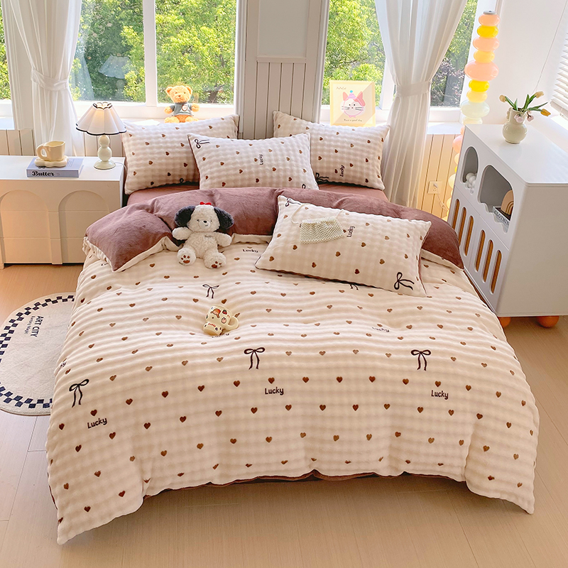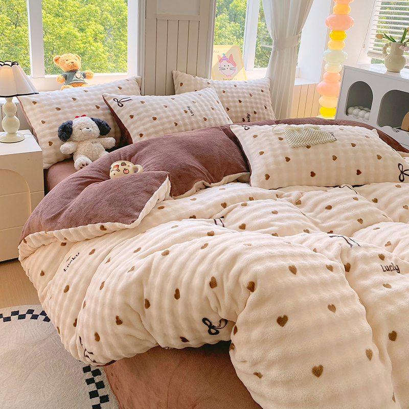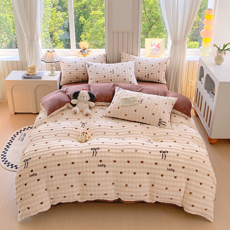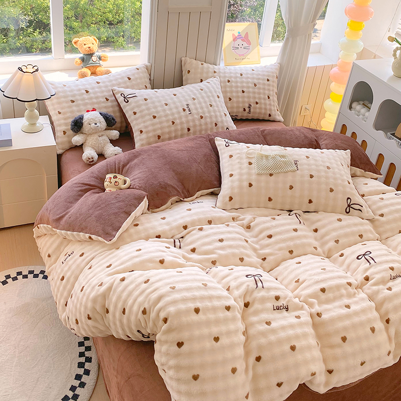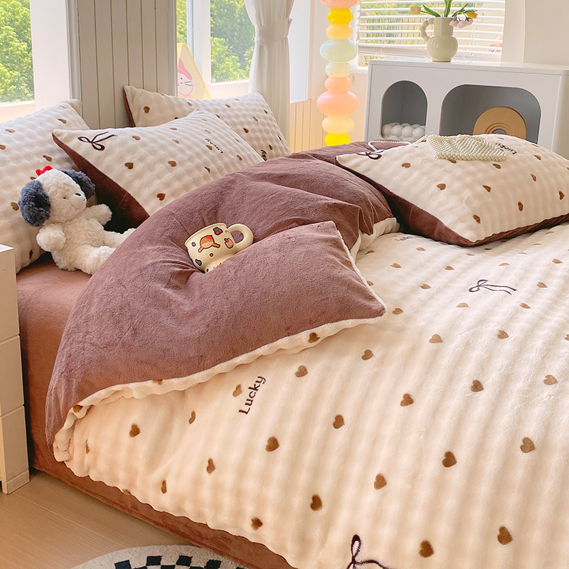 当前位置: 91家纺网 > 商品网购 > 床品套件 > 四件套 > 牛奶绒四件套 > 艾橙 2025新款泡泡牛奶绒加厚保暖印花四件套 爱心蝴蝶结-咖