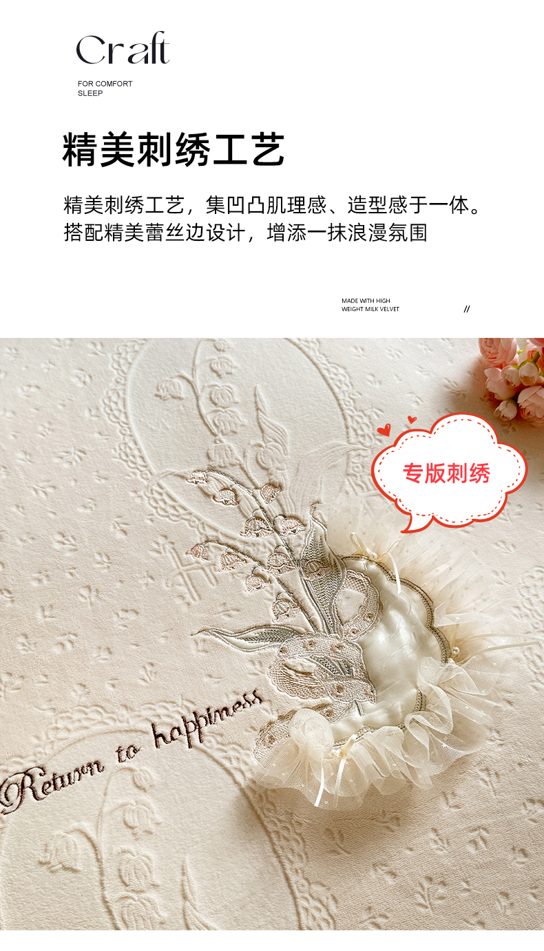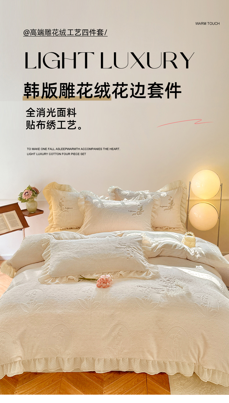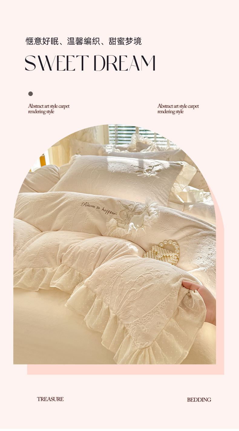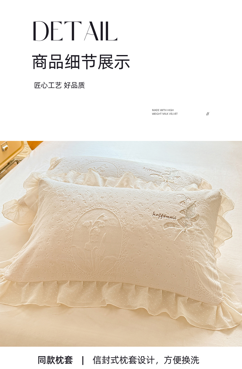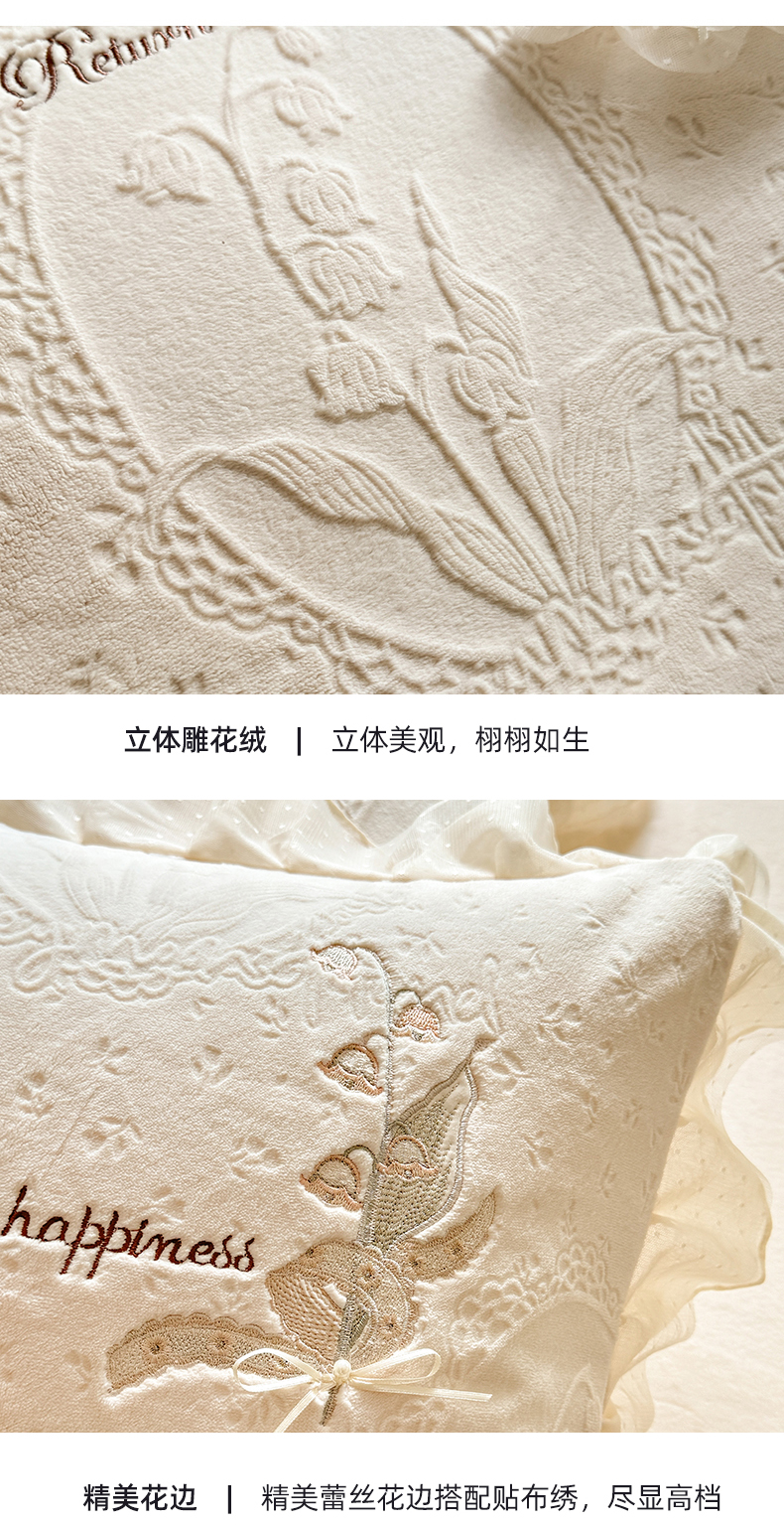商品名称:艾唯希家纺 2025新款韩版全消光雕花绒花边四件套牛奶绒-铃兰花边系列 铃兰-米