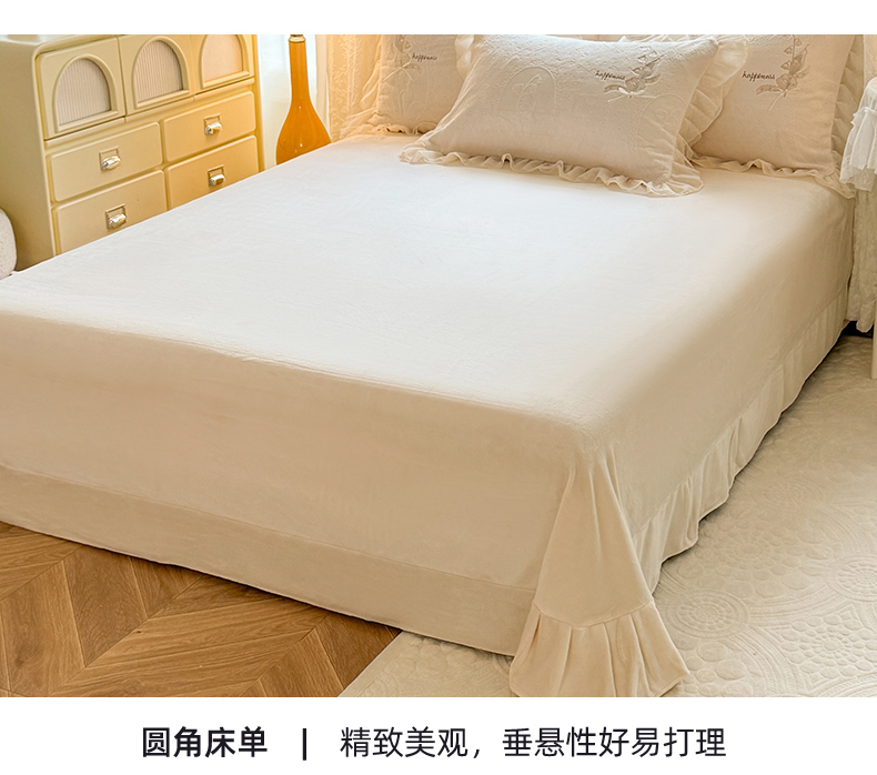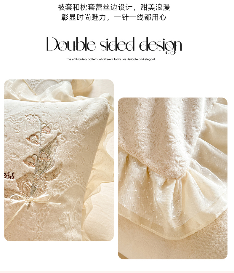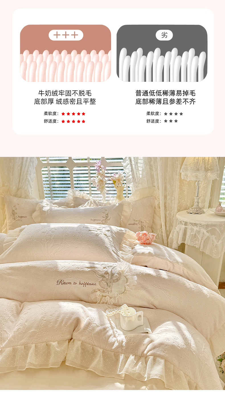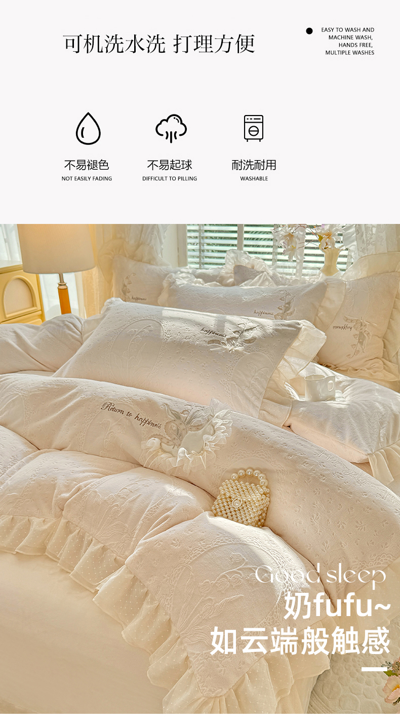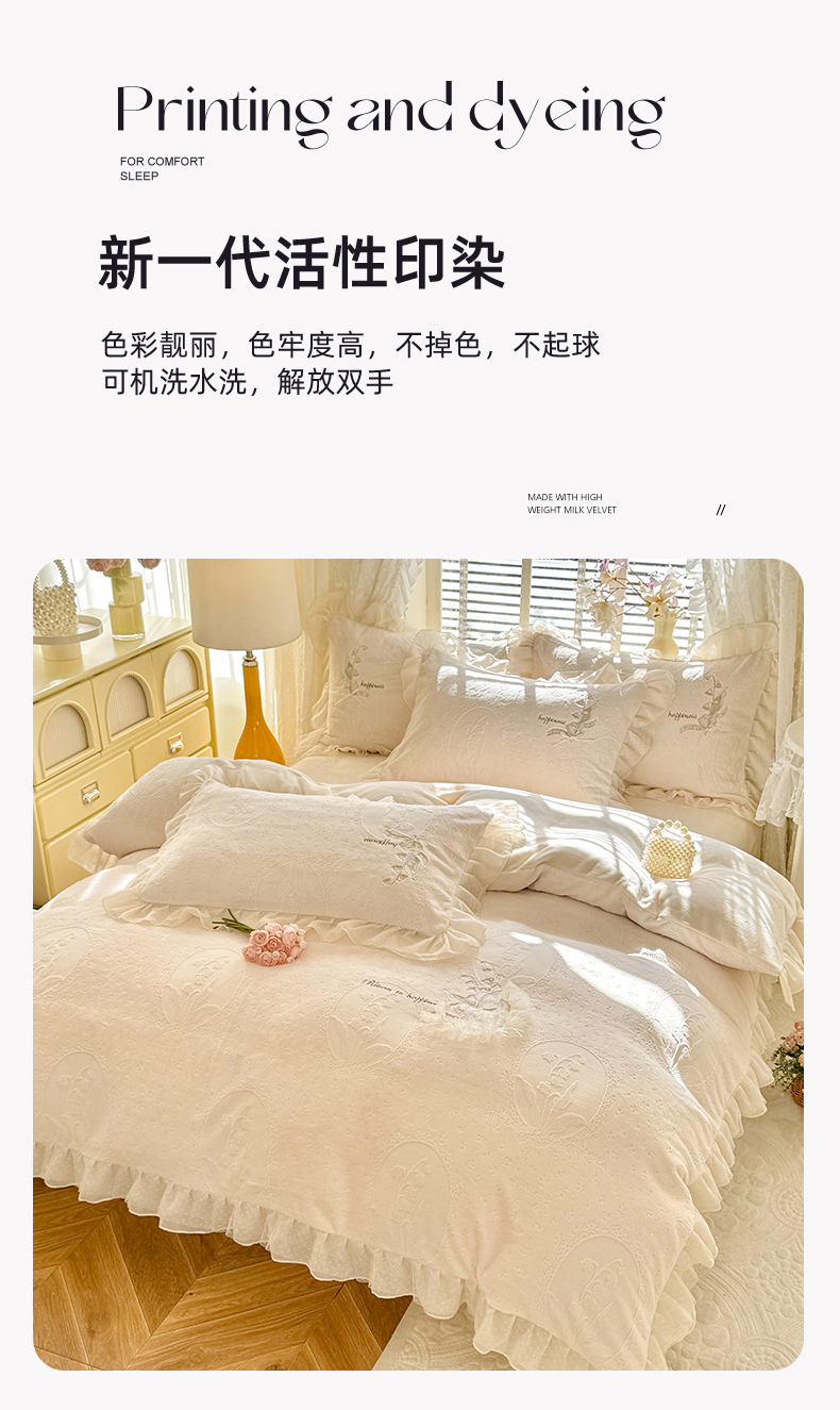 商品名称:艾唯希家纺 2025新款韩版全消光雕花绒花边四件套牛奶绒-铃兰花边系列 铃兰-米