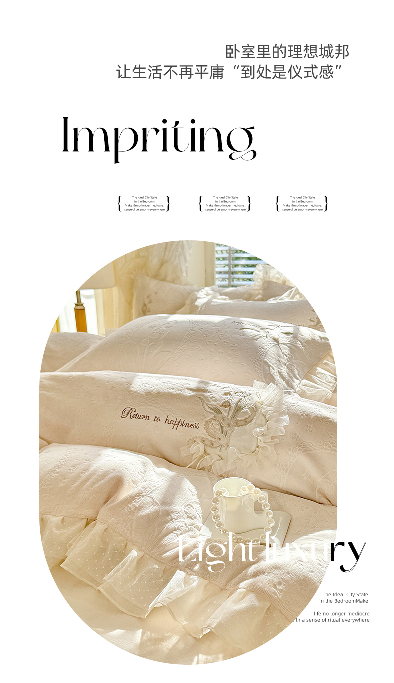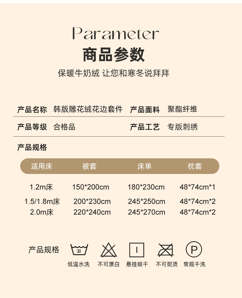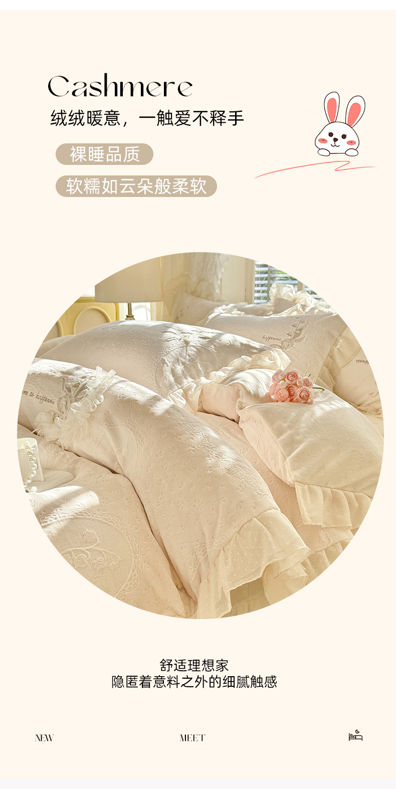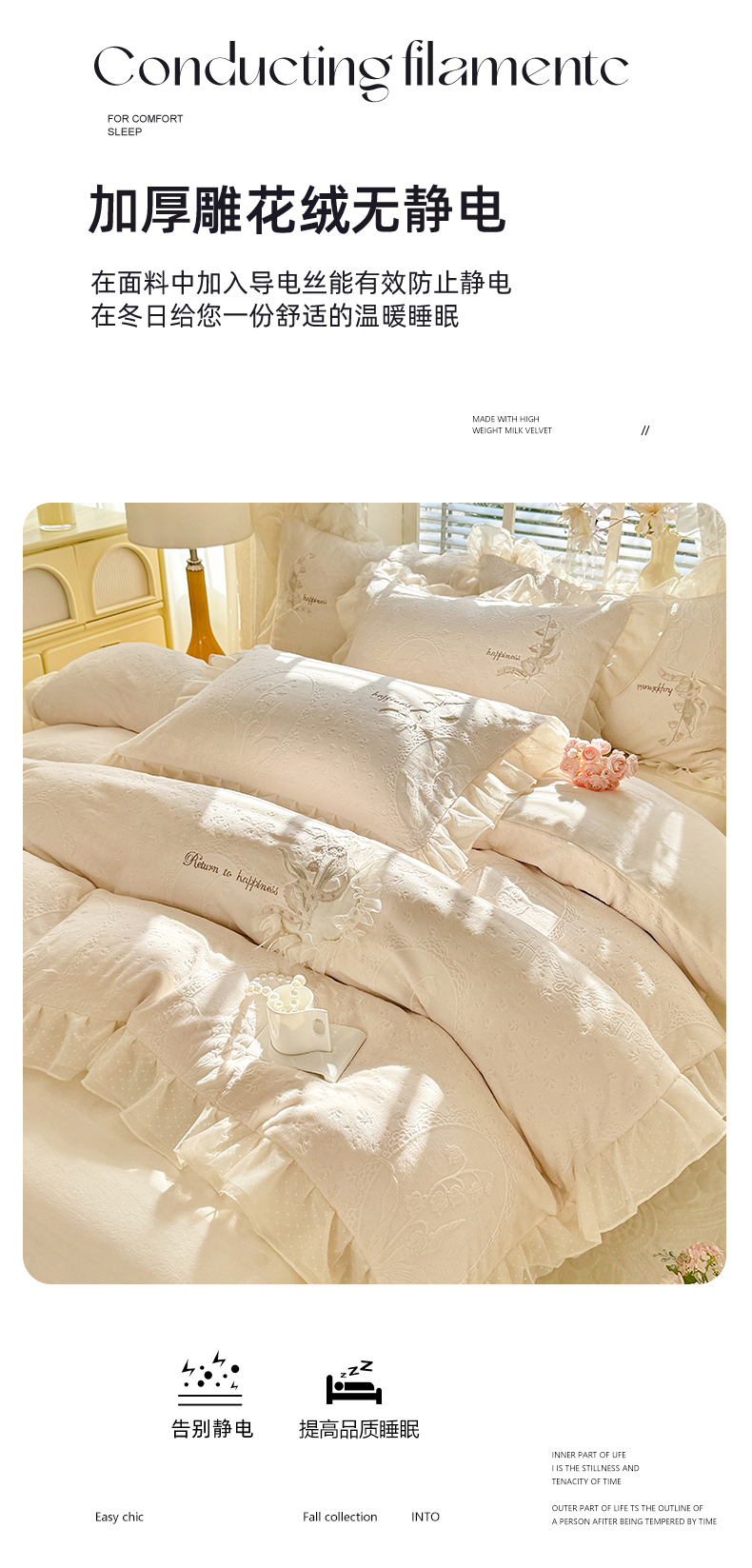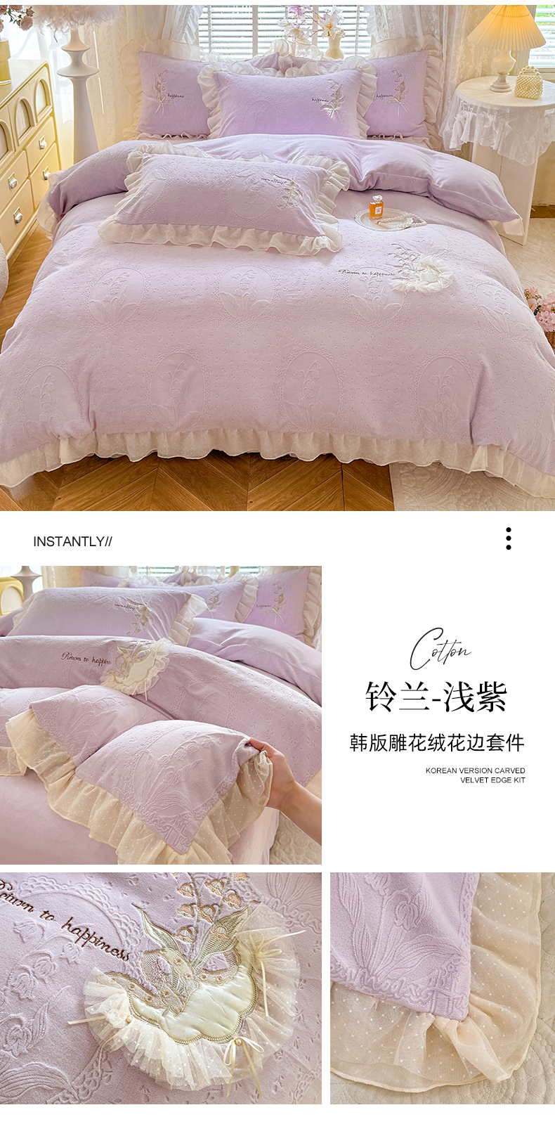 商品名称:艾唯希家纺 2025新款韩版全消光雕花绒花边四件套牛奶绒-铃兰花边系列 铃兰-米