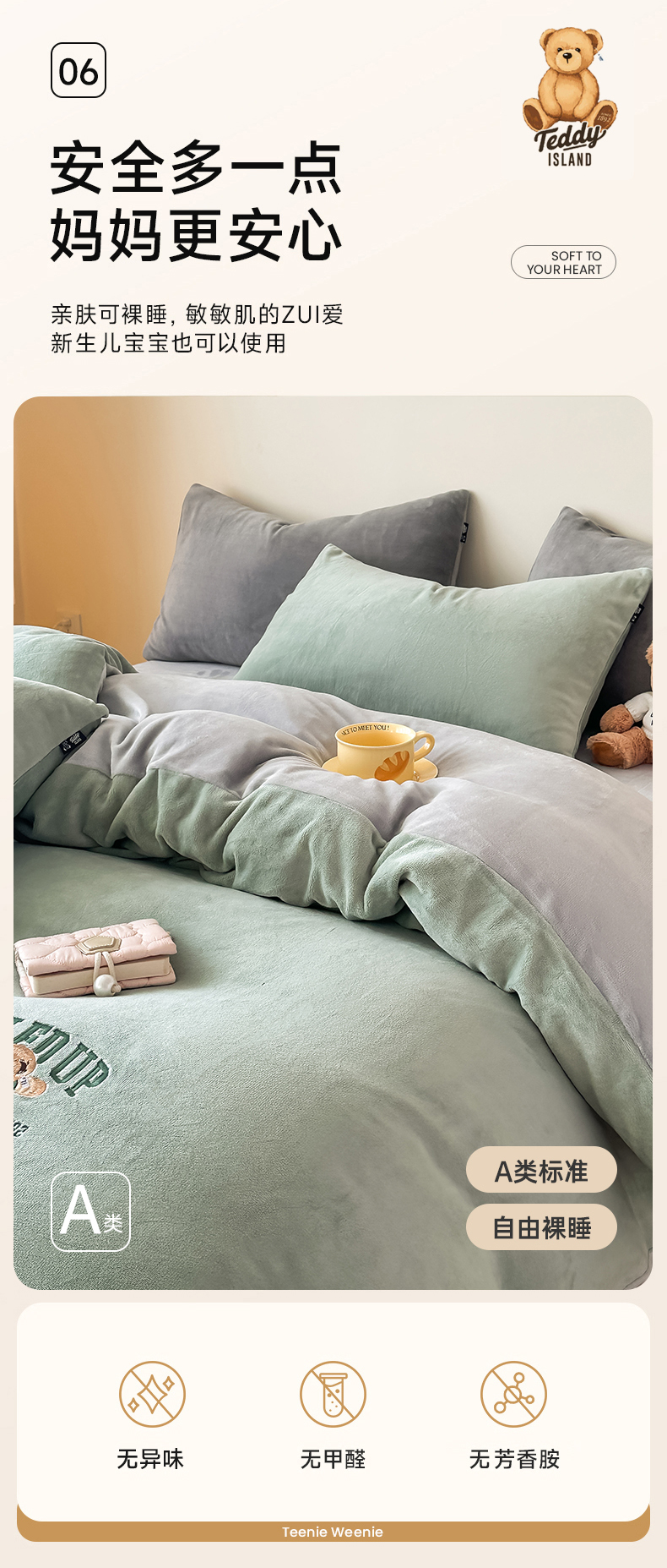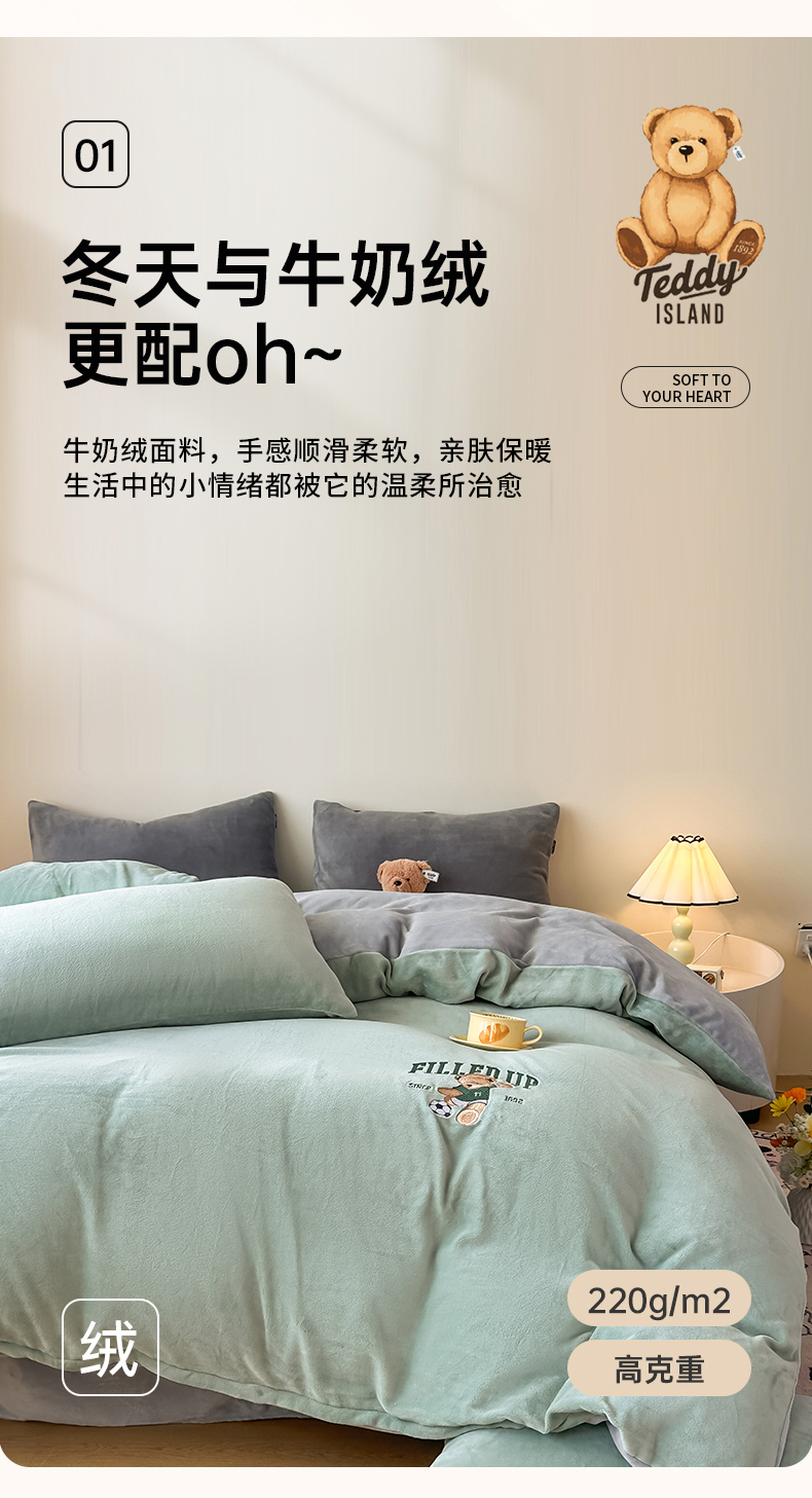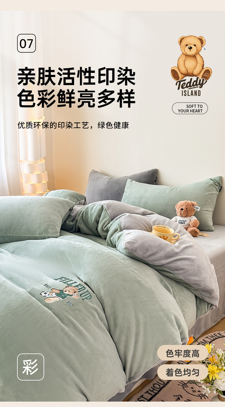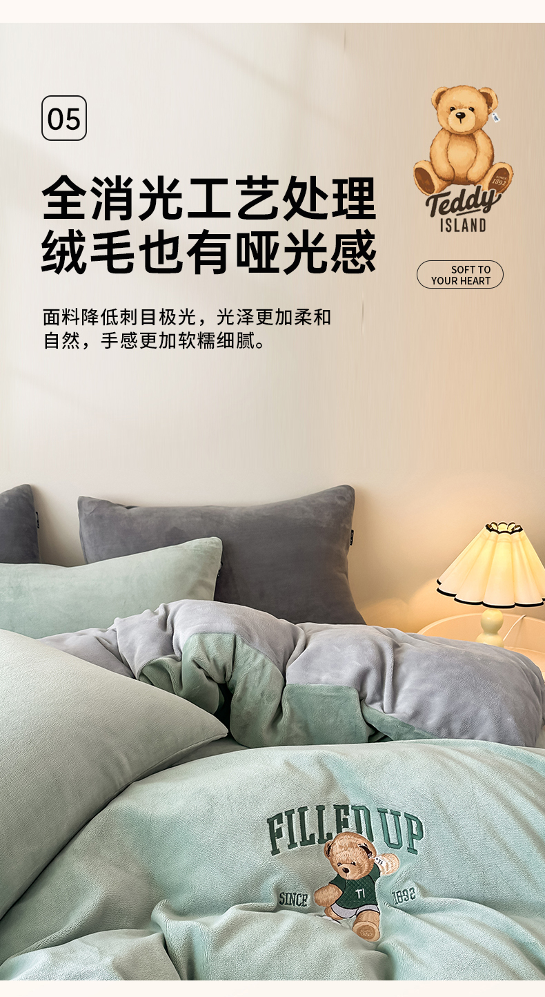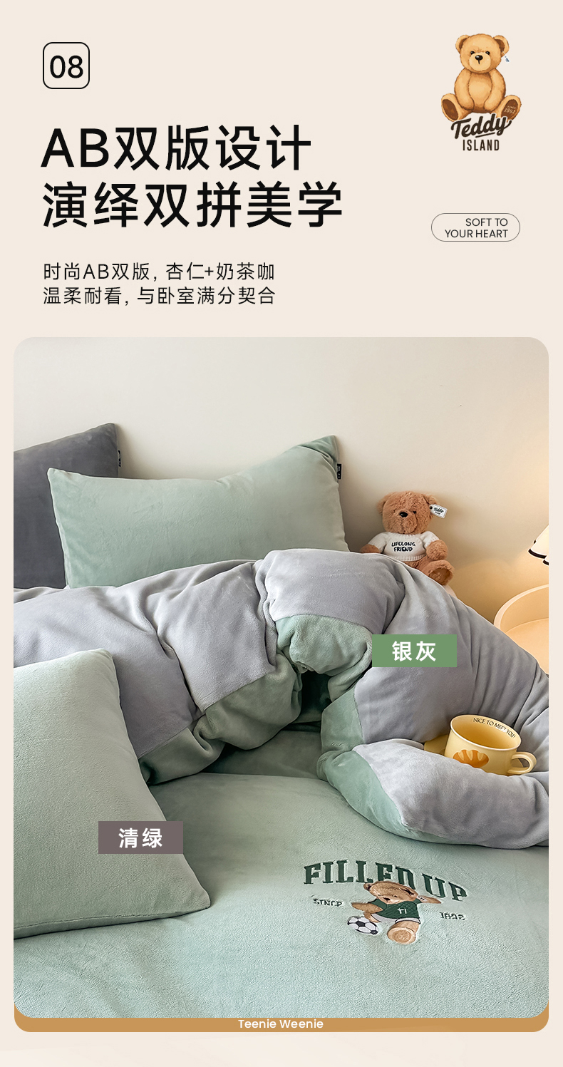 (总)泰迪爱兰Teddy ISLAND 2025新款牛奶绒绣花四件套,粉色+杏仁色,可可色+杏仁色,雾霾灰+神秘灰,香芋紫+神秘灰,杏仁色+可可色,杏仁色+神秘灰