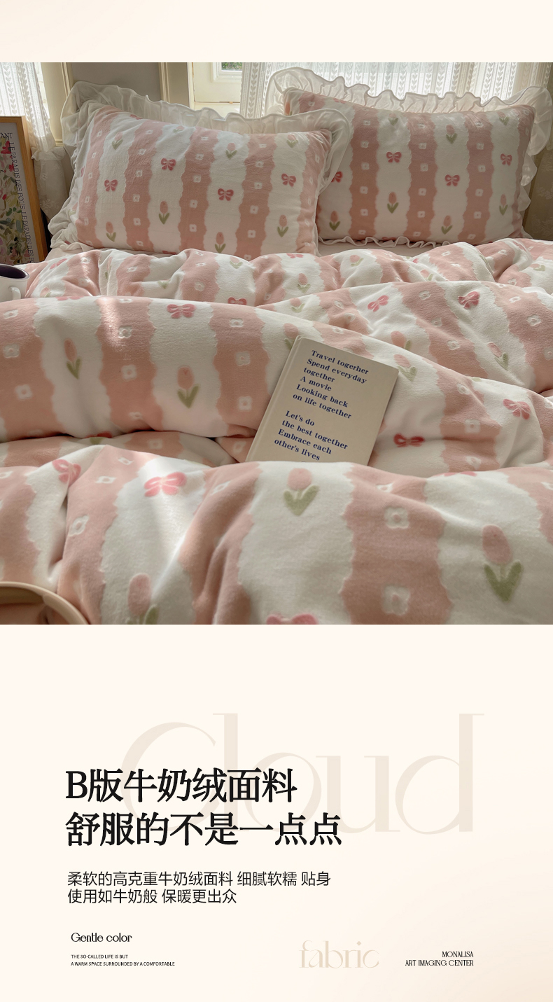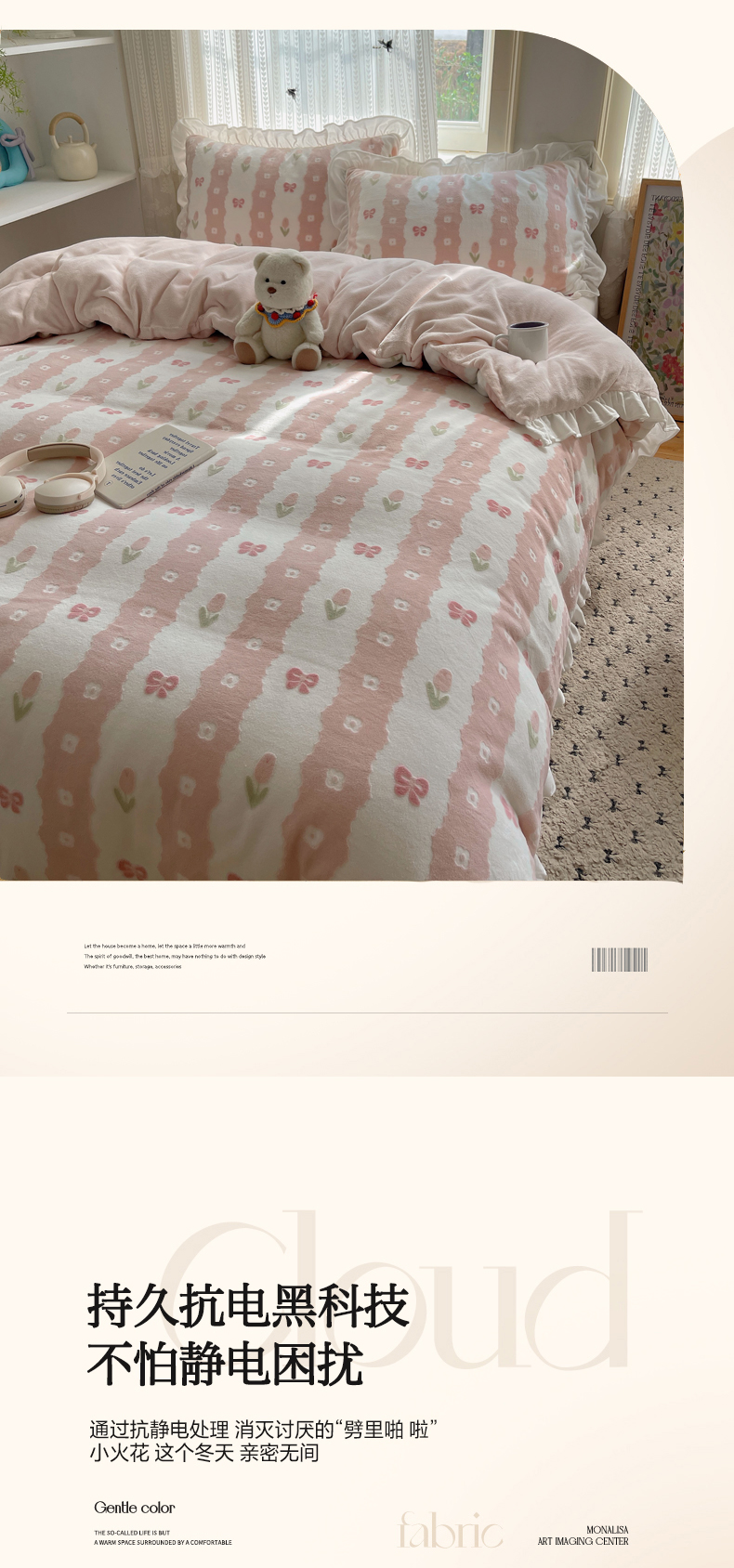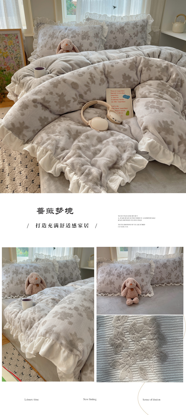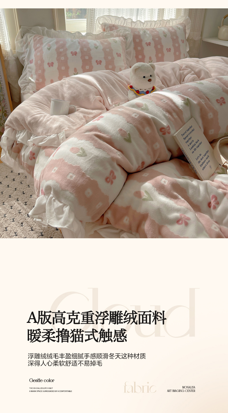 三朵家纺 2025新款韩系花边雕花绒牛奶绒法莱绒四件套 恋花小经粉