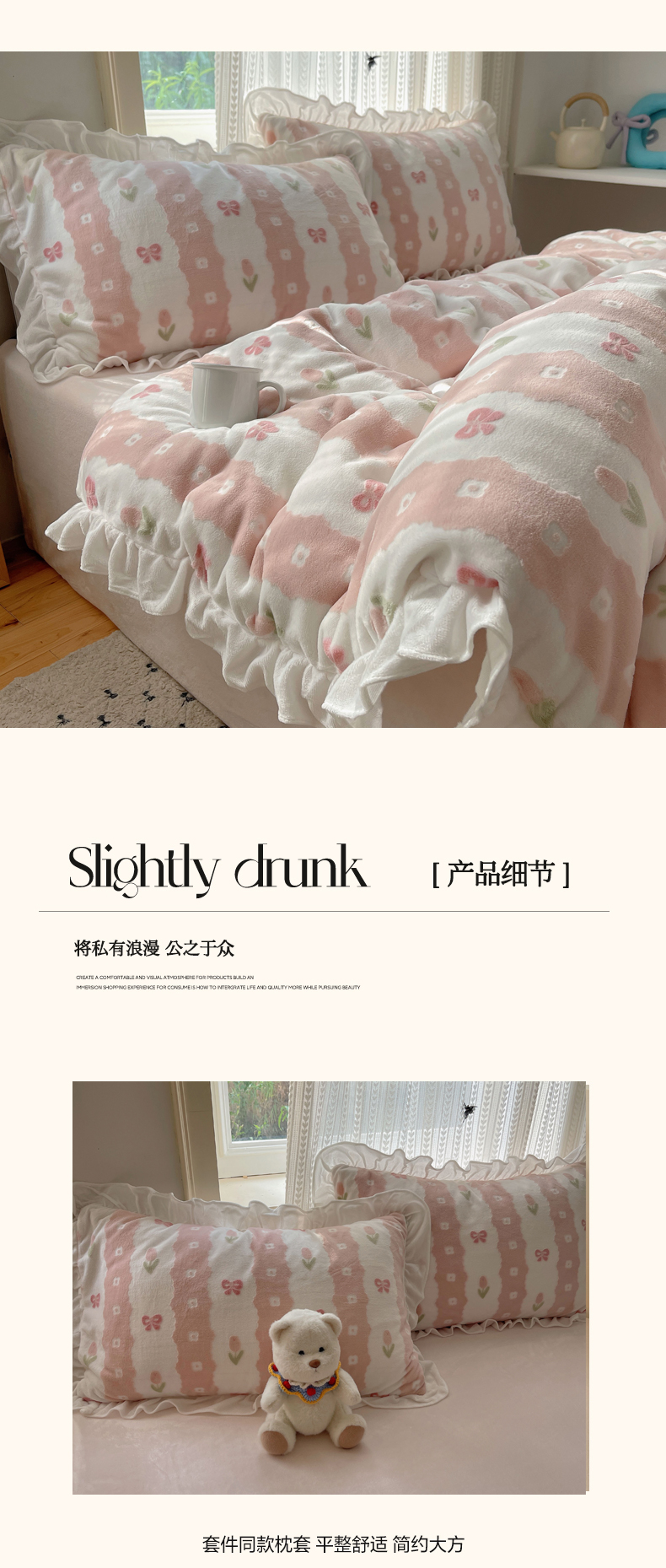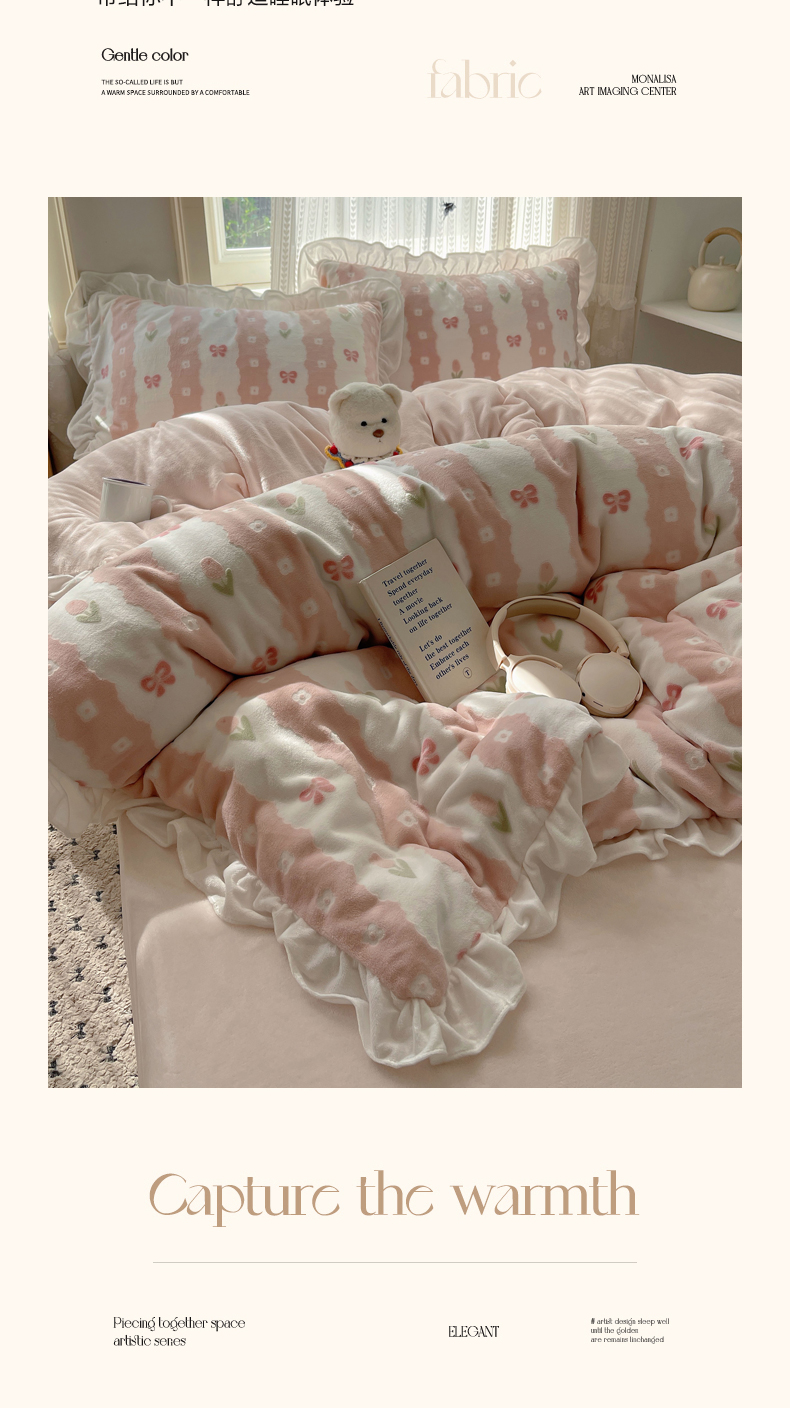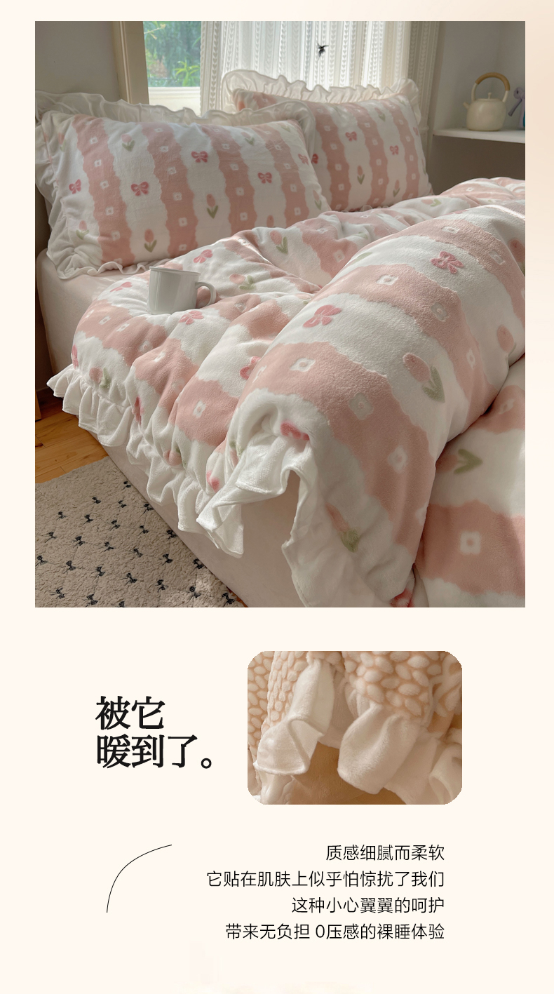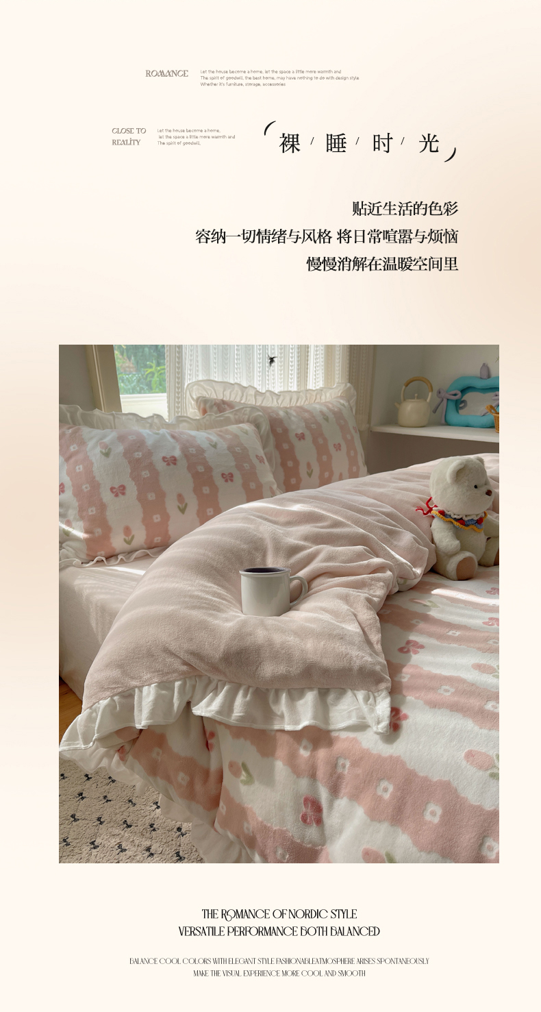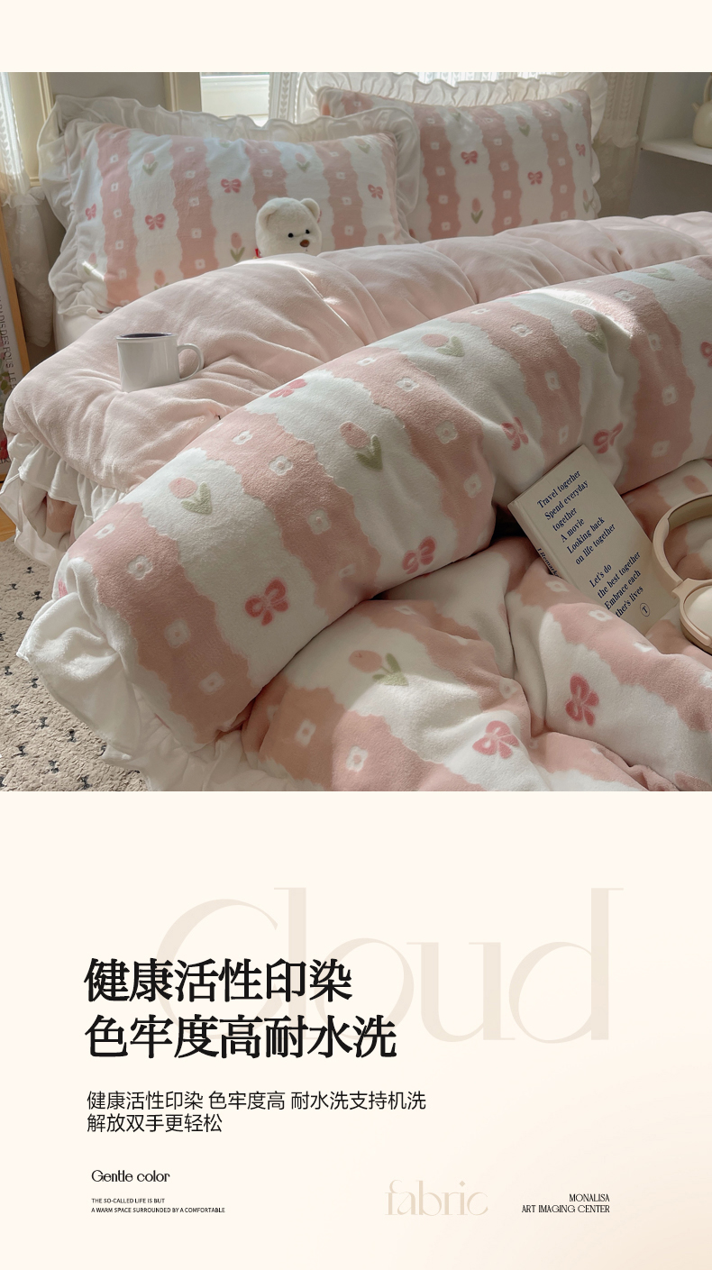 三朵家纺 2025新款韩系花边雕花绒牛奶绒法莱绒四件套 恋花小经粉