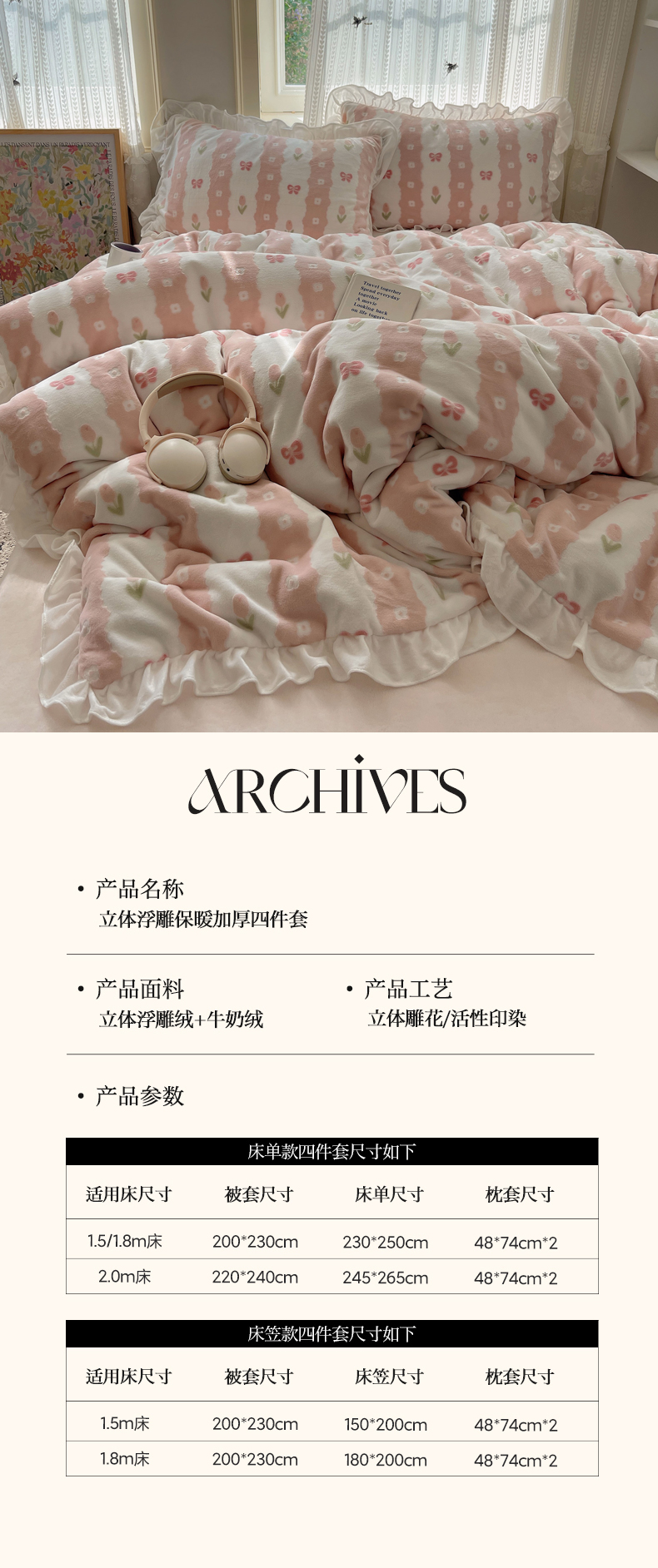 (总)三朵家纺 2024新款3D立体浮雕花边保暖加厚四件套,馥郁芳芬,花园小径粉,花园小径黄,绿野仙踪,暖暖花语