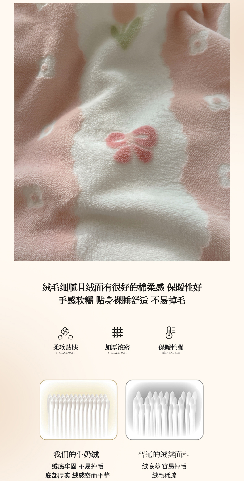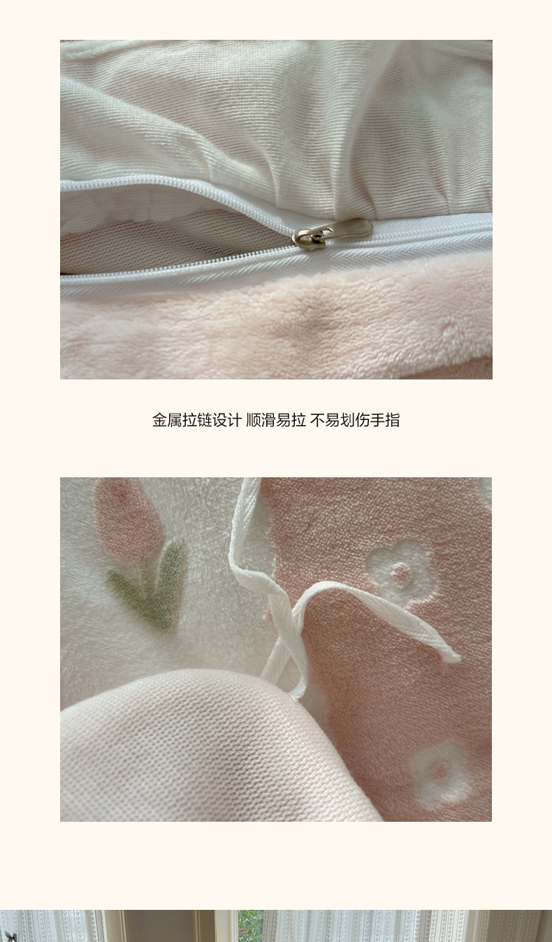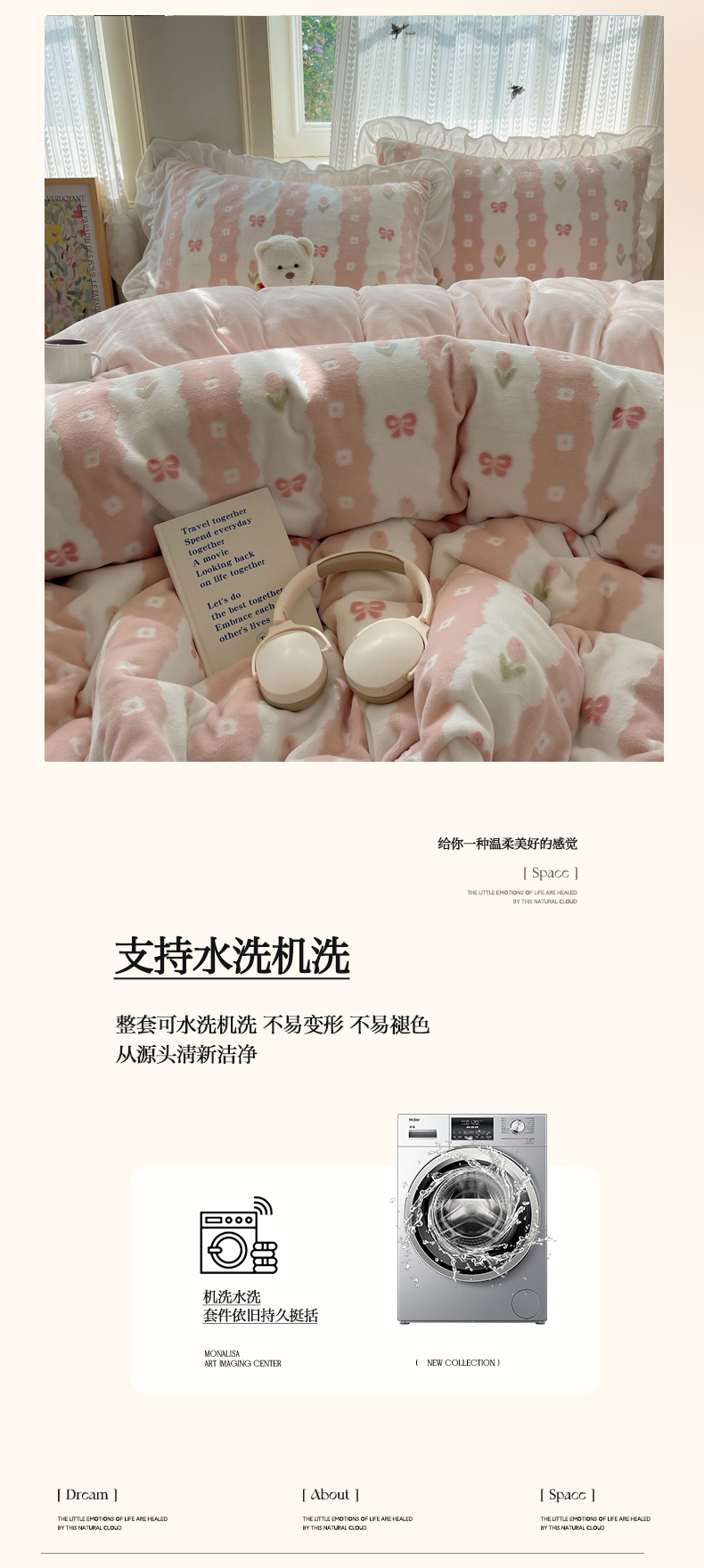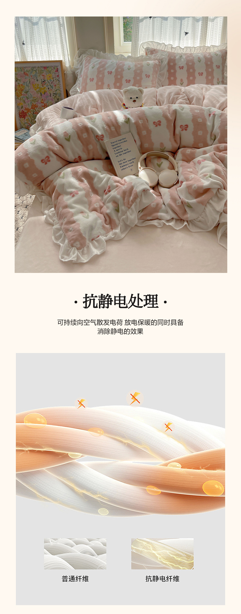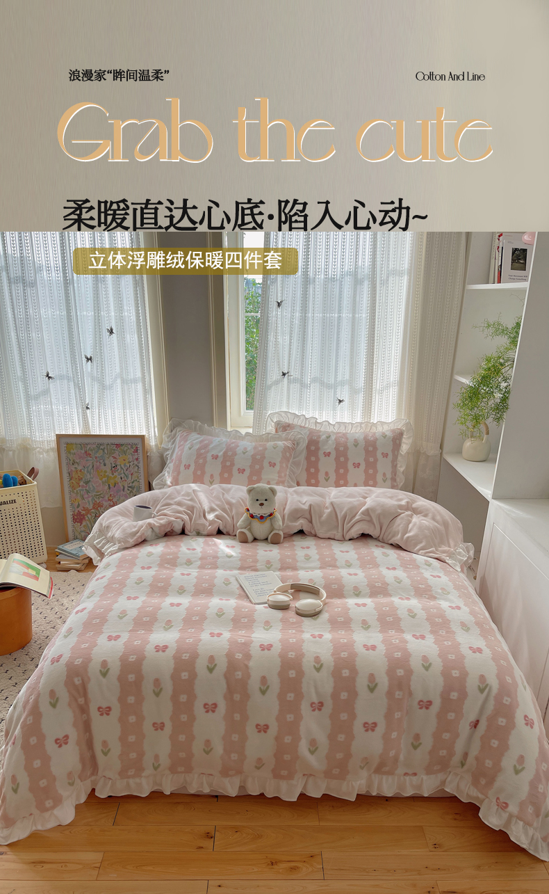 商品名称:三朵家纺 2025新款韩系花边雕花绒牛奶绒法莱绒四件套 恋花小经粉