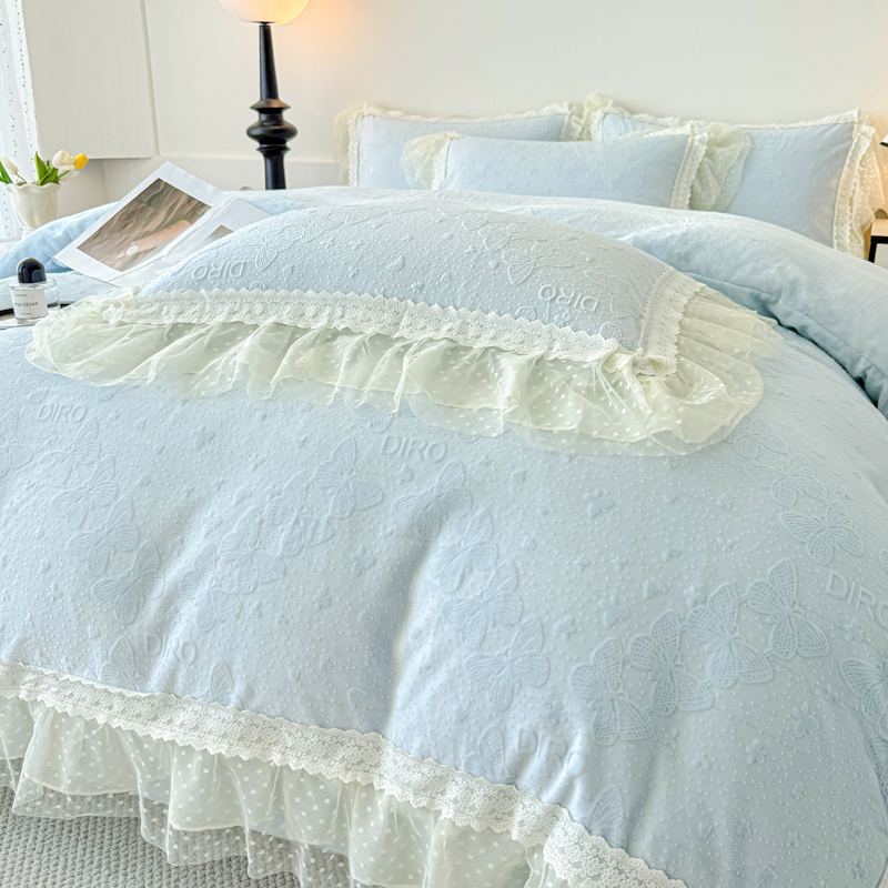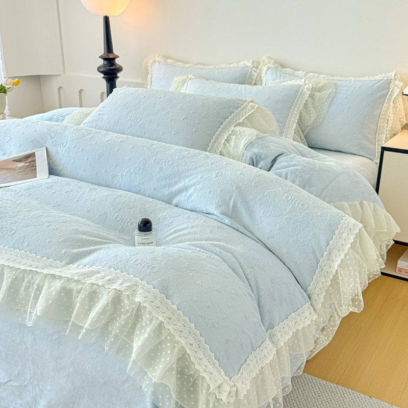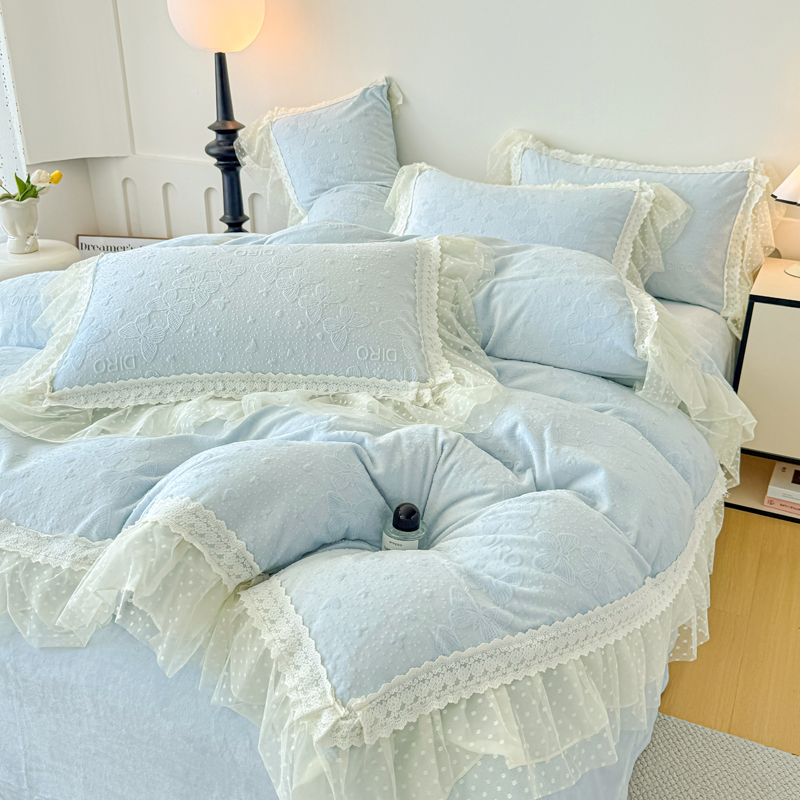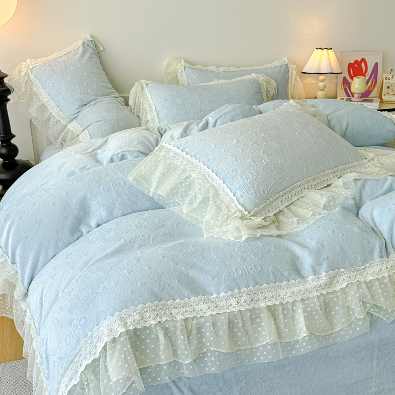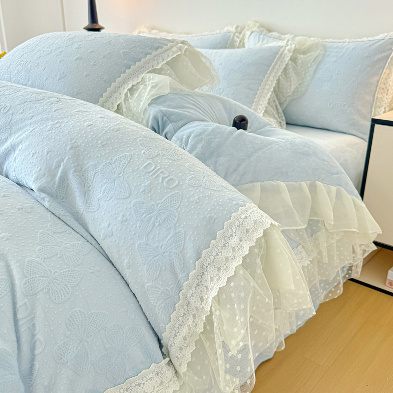 当前位置: 91家纺网 > 商品网购 > 床品套件 > 四件套 > 牛奶绒四件套 > 锦格家纺 2025新款A类高克重雕花牛奶绒花边四件套 蝶漫-天蓝