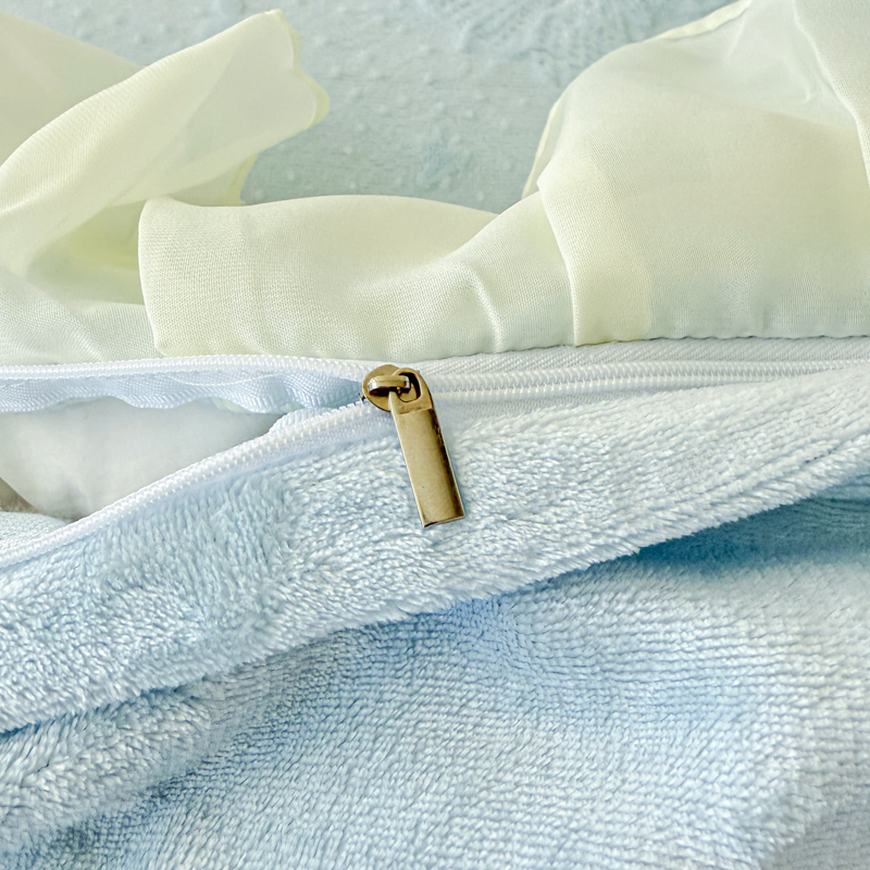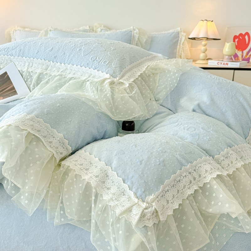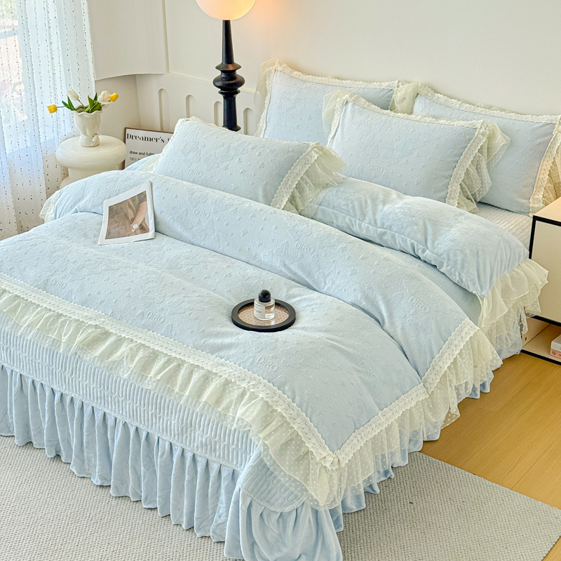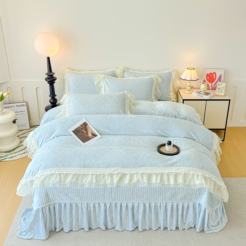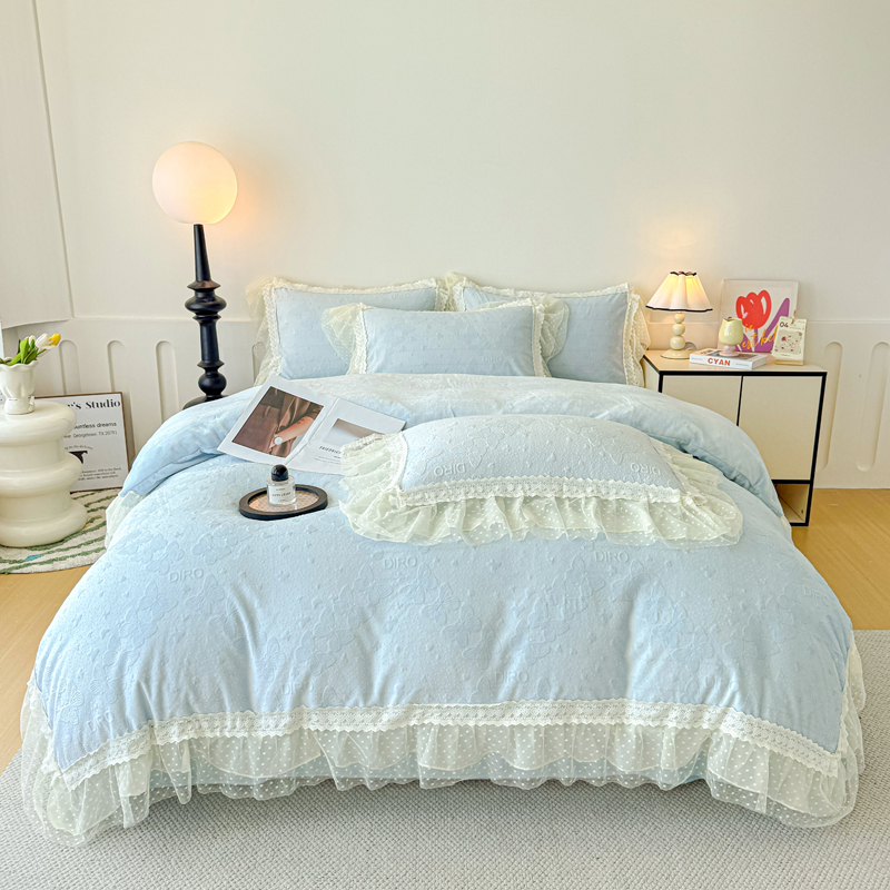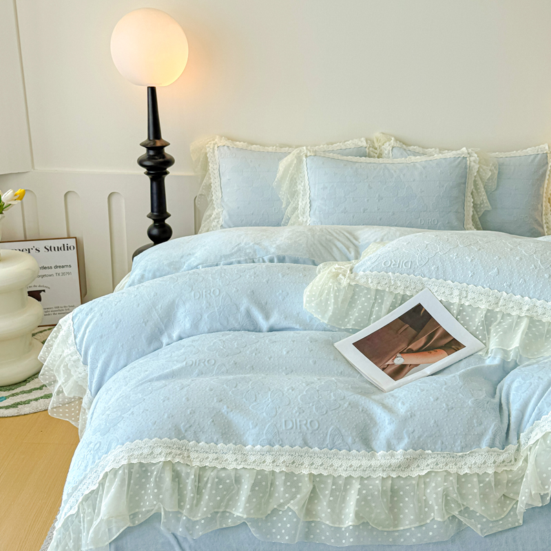 当前位置: 91家纺网 > 商品网购 > 床品套件 > 四件套 > 牛奶绒四件套 > 锦格家纺 2025新款A类高克重雕花牛奶绒花边四件套 蝶漫-天蓝