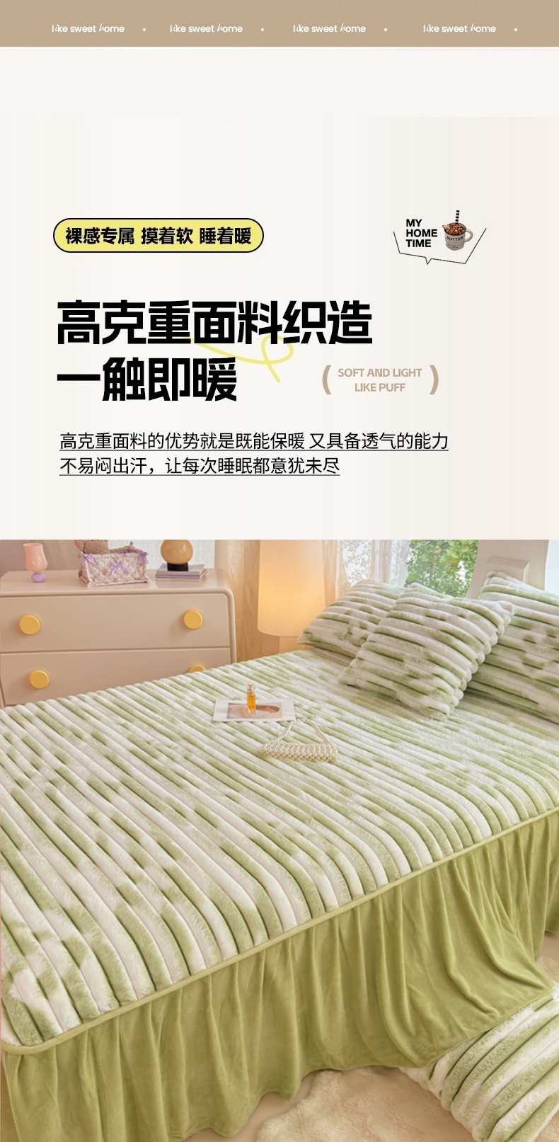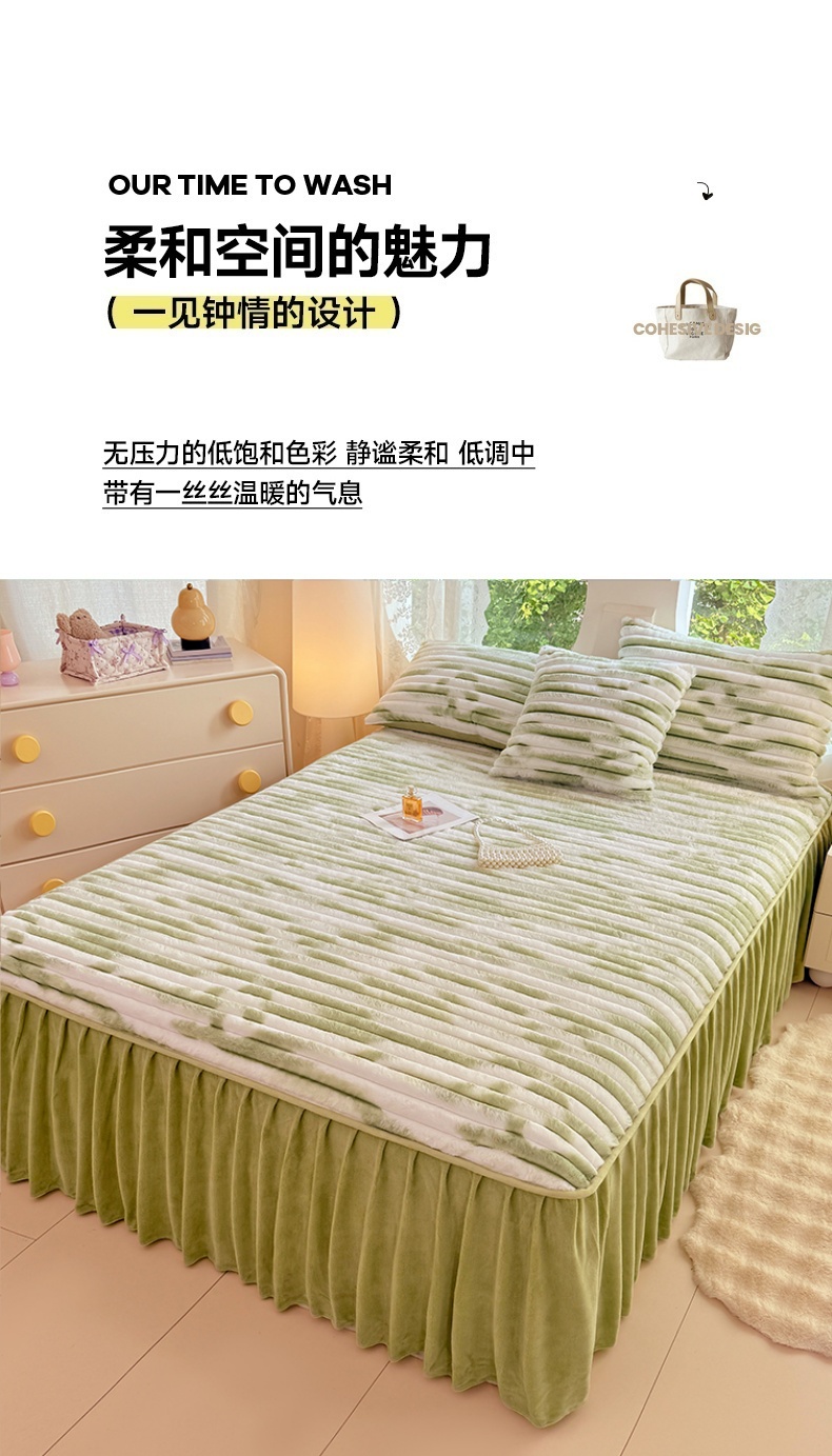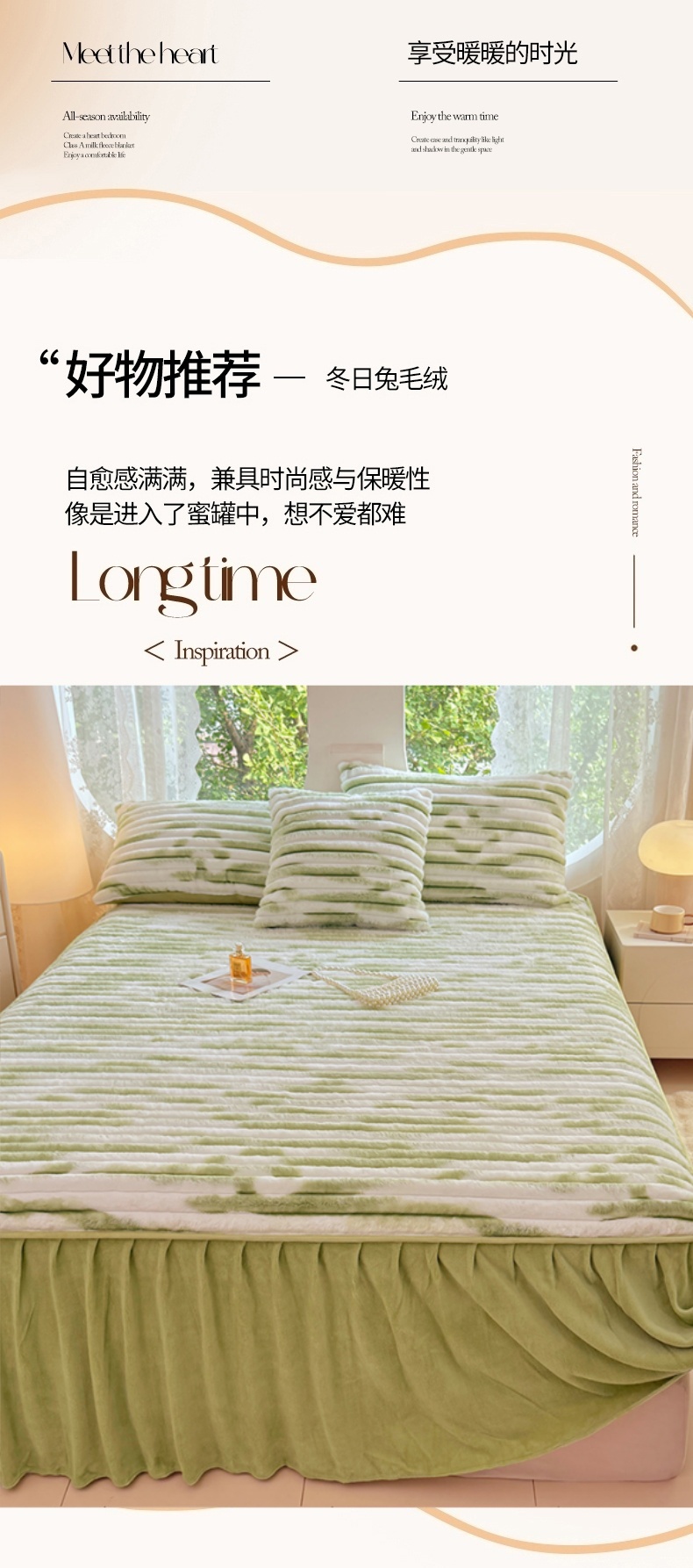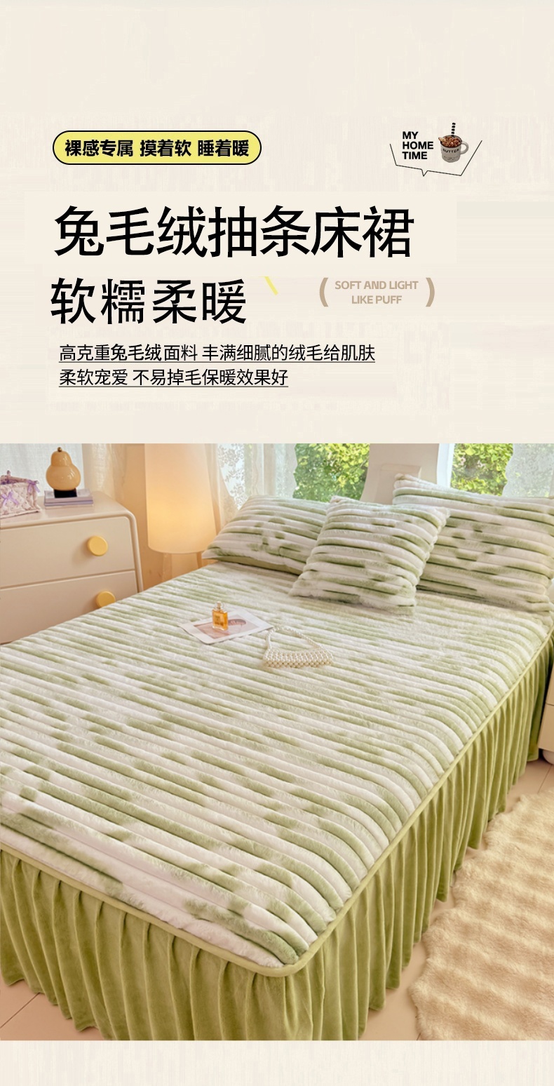 梦舒羽 2025新款兔毛绒床裙法兰绒床垫保护罩牛奶绒床垫法莱绒床单罩-抽条 兔毛绒抽条-梦幻果绿
