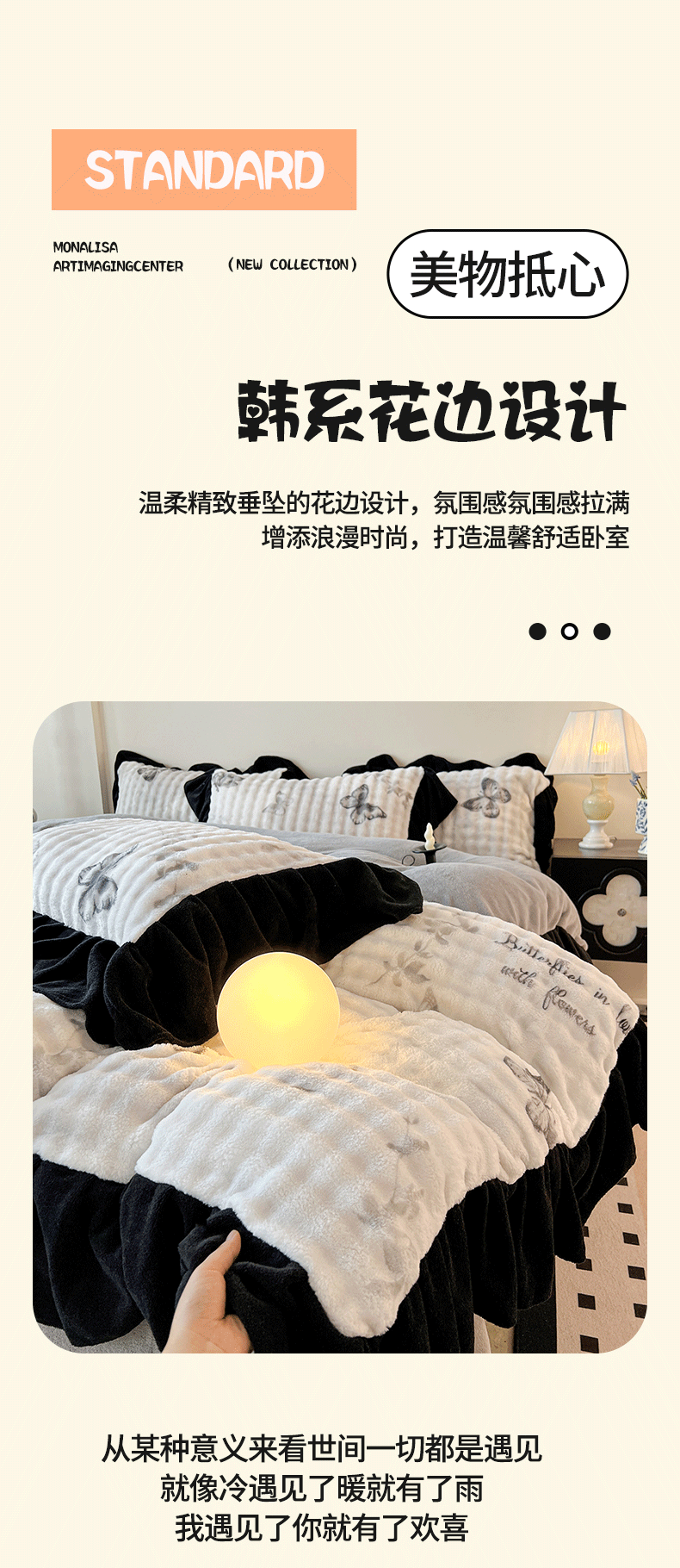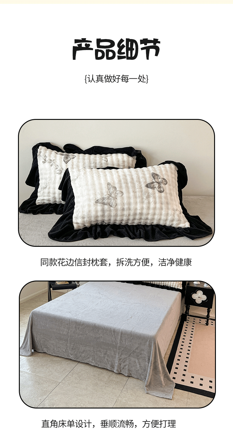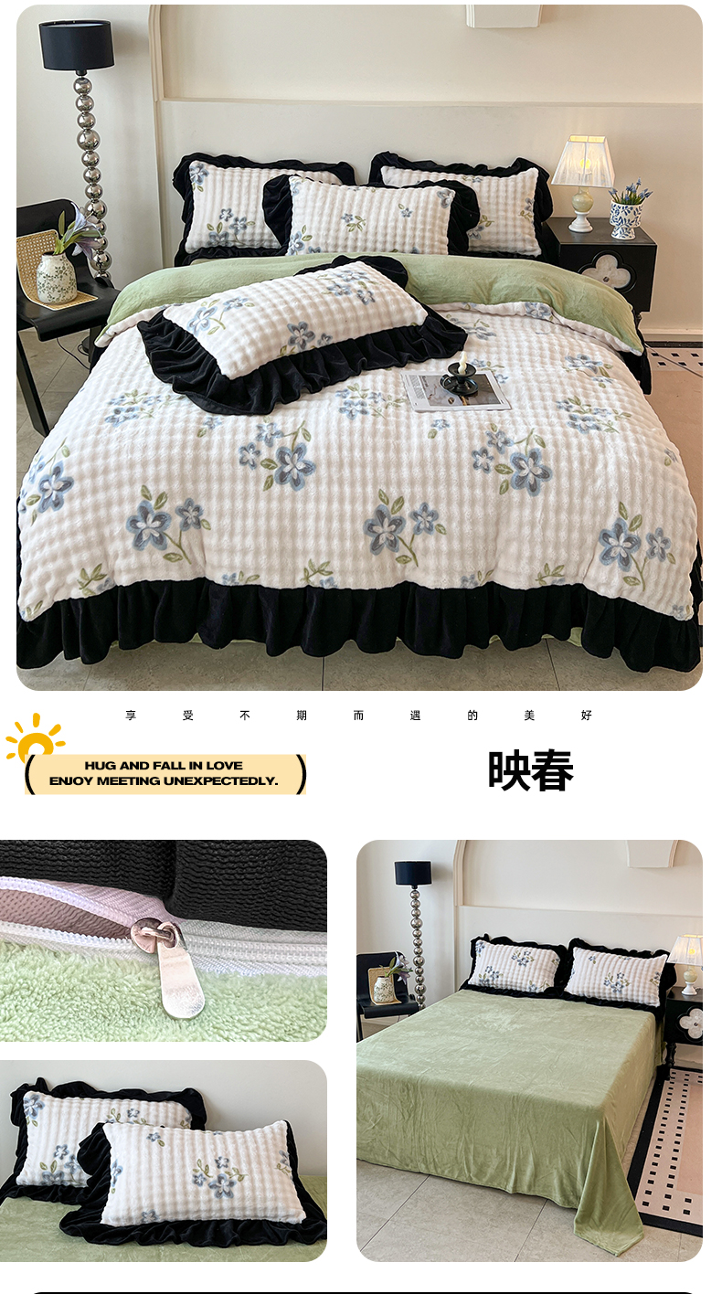 (总)言熙居家纺 2025新款A类兔毛绒韩版卡通花边四件套,蝴蝶结,幻蝶,墨枝,休闲一刻,映春,花眠