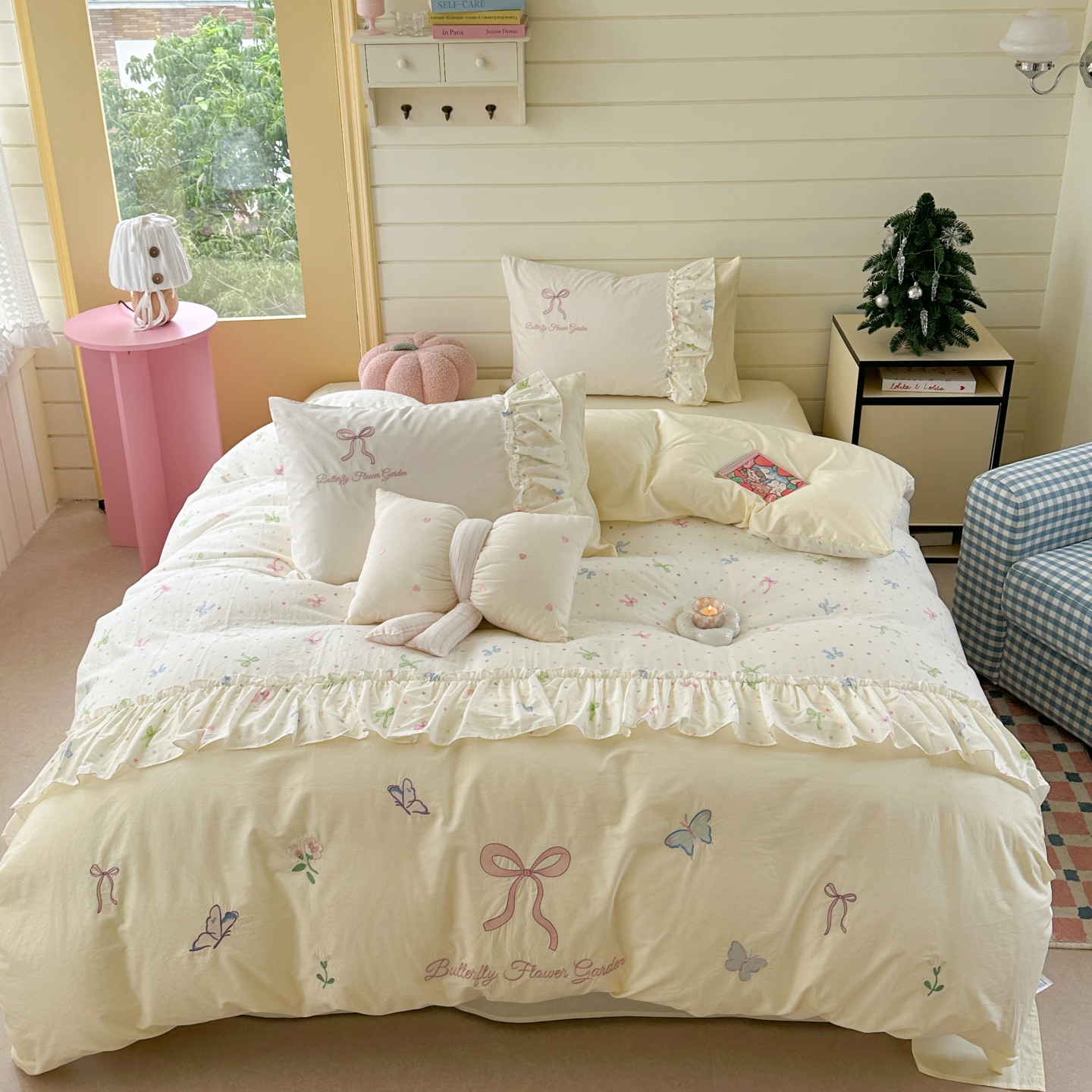 觅糖家纺 2025新款双层纱刺绣花边四件套系列 雾中蝶舞
