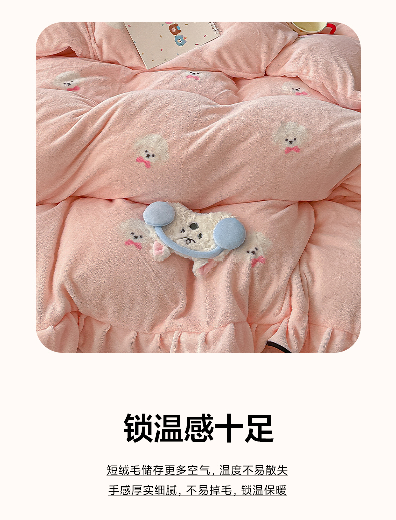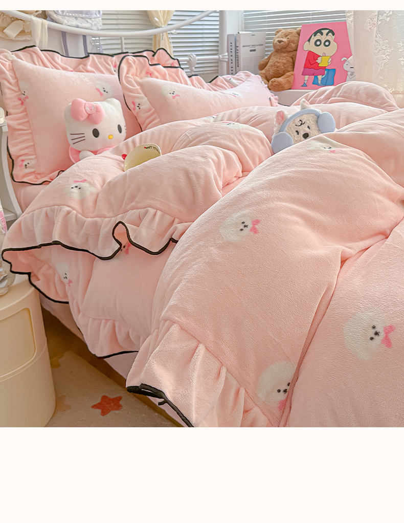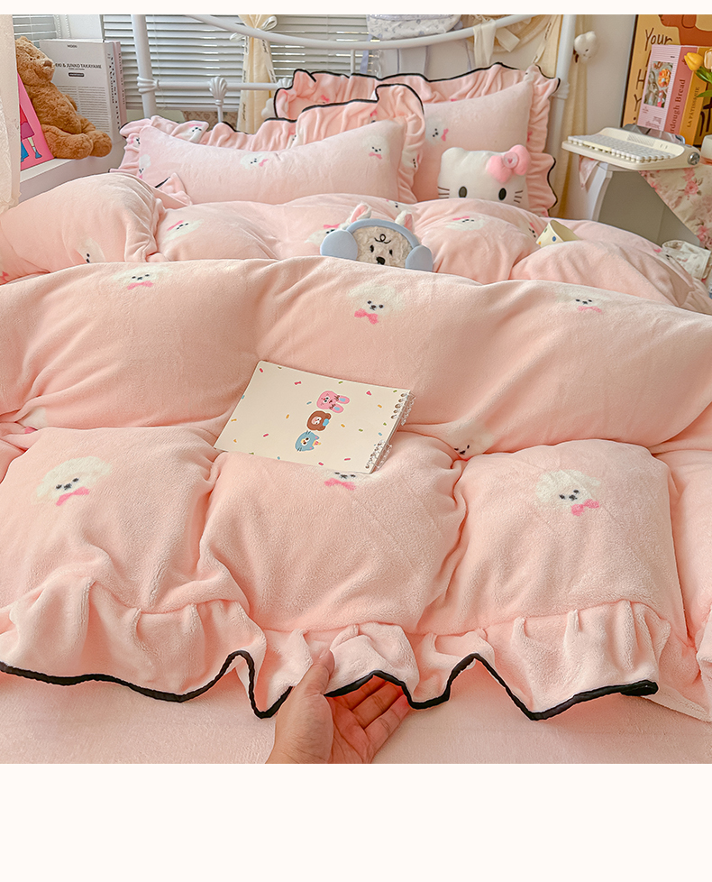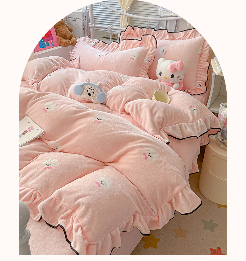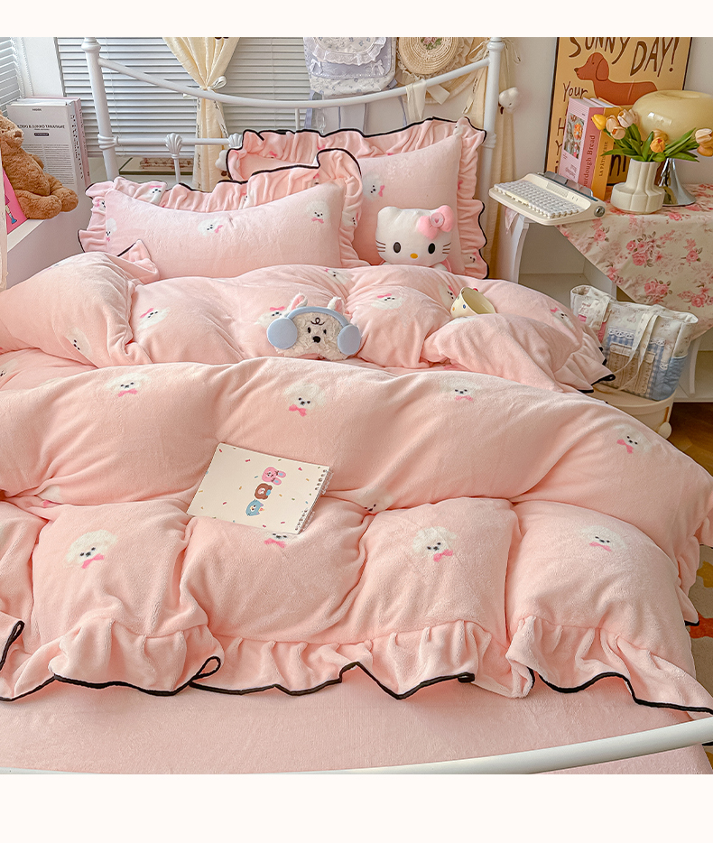 当前位置: 91家纺网 > 商品网购 > 床品套件 > 四件套 > 牛奶绒四件套 > 韩都家居 2025新款亲肤舒适韩版温暖牛奶绒四件套-花边款 蝴蝶结小狗-玉