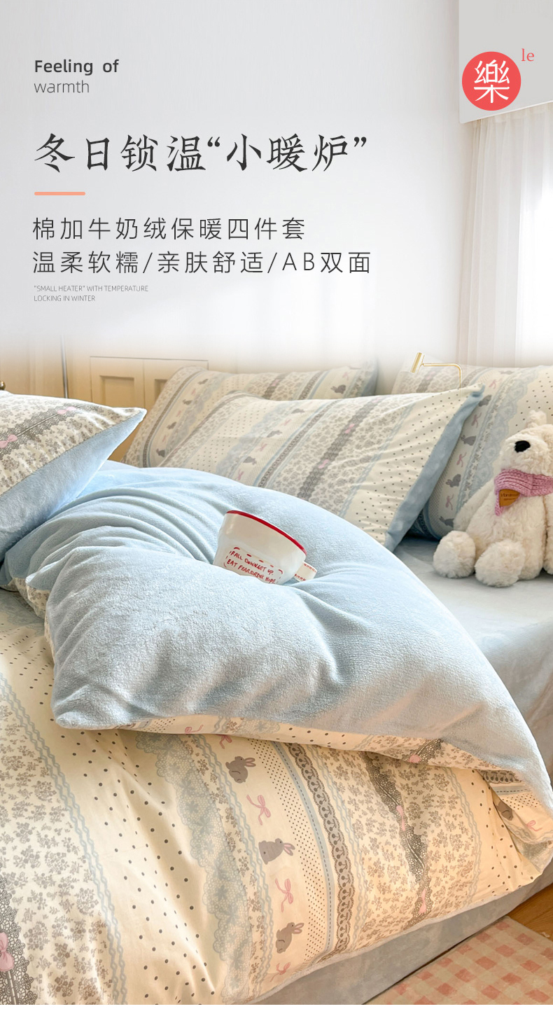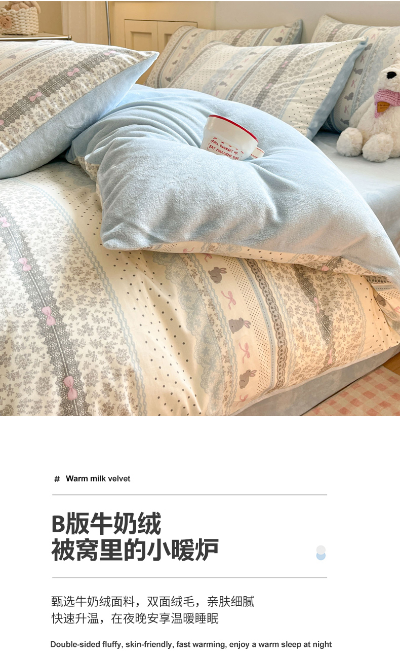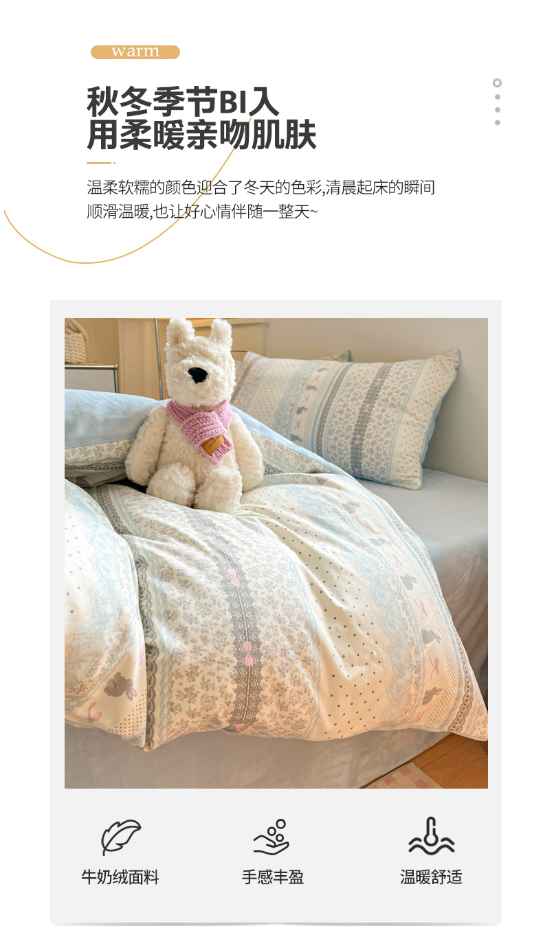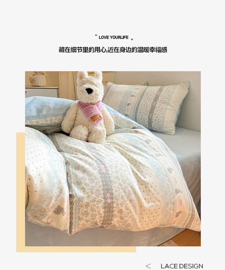 当前位置: 91家纺网 > 商品网购 > 床品套件 > 四件套 > 牛奶绒四件套 > 麦伦家居 2025秋冬新款多功能床品全棉+牛奶绒印花四件套 花边兔