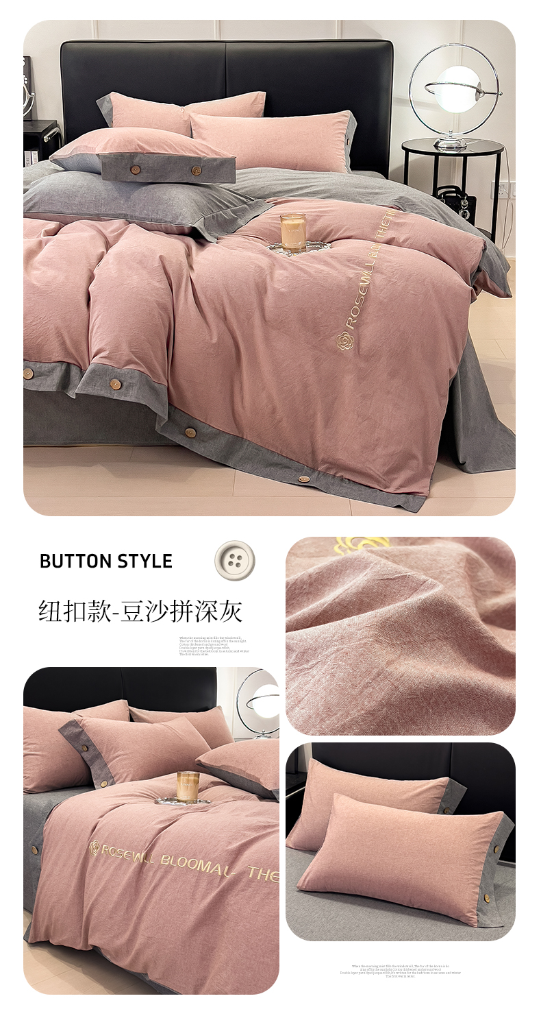 (总)芃成家纺 2025新款A类全棉色织水洗棉纽扣绣花四件套,纽扣款-白色拼浅绿,纽扣款-豆沙拼深灰,纽扣款-卡其拼浅绿,纽扣款-蓝灰拼浅灰,纽扣款-浅粉拼浅灰,纽扣款-浅灰拼卡其,纽扣款-浅蓝拼卡其,纽扣款-浅绿拼浅灰,纽扣款-浅紫拼浅粉,纽扣款-深灰拼浅灰