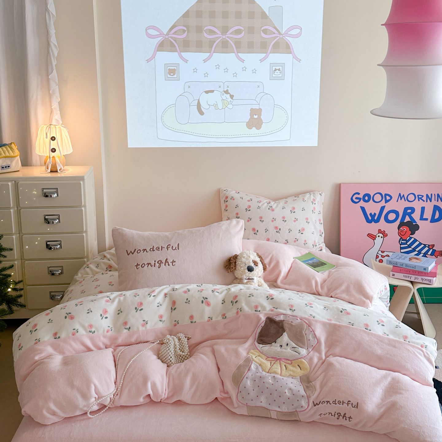觅糖家纺 2025新款牛奶绒卡通贴布绣系列四件套 三花猫咪