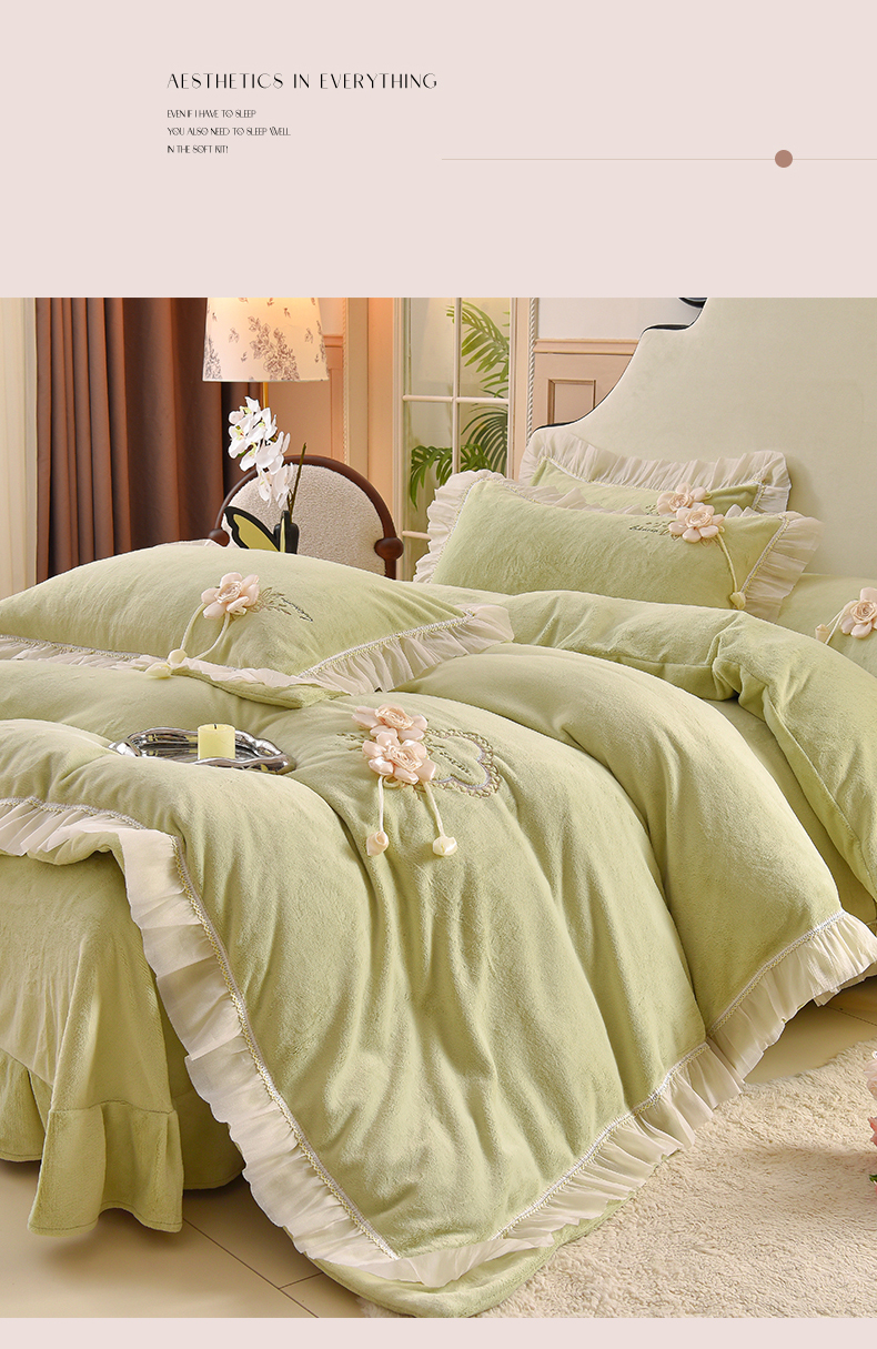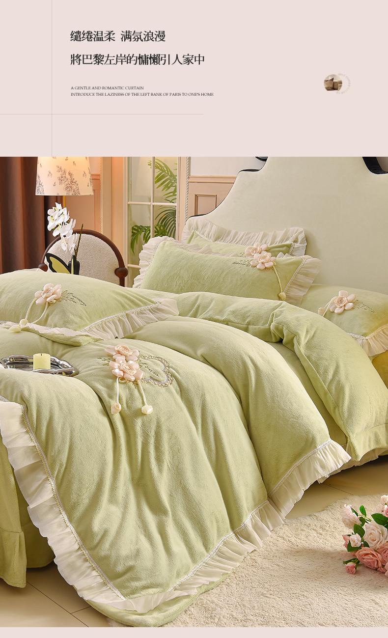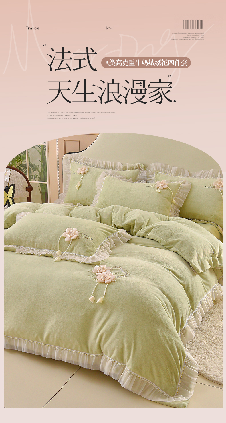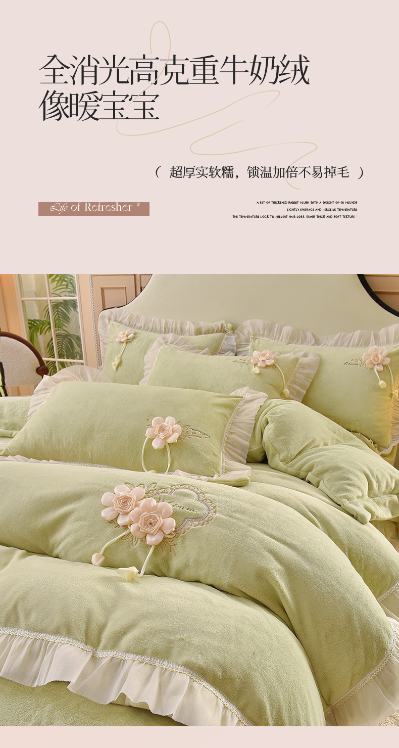 鼎飞家纺 2025新款A类高克重牛奶绒绣花四件套--舒蕾系列 舒蕾-芬绿