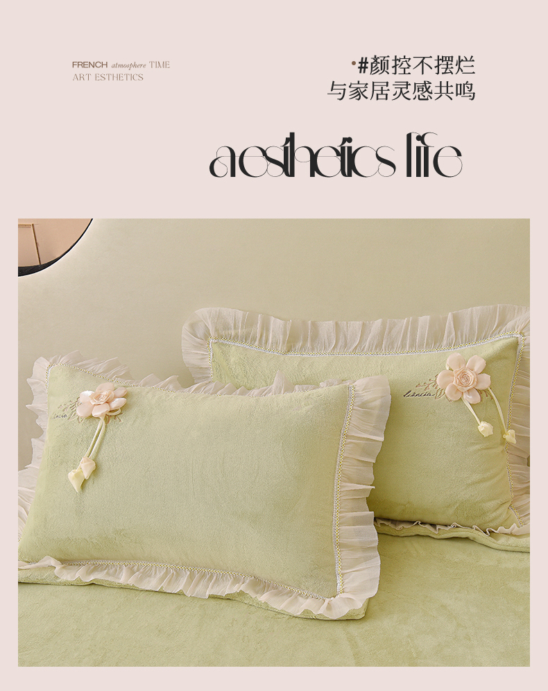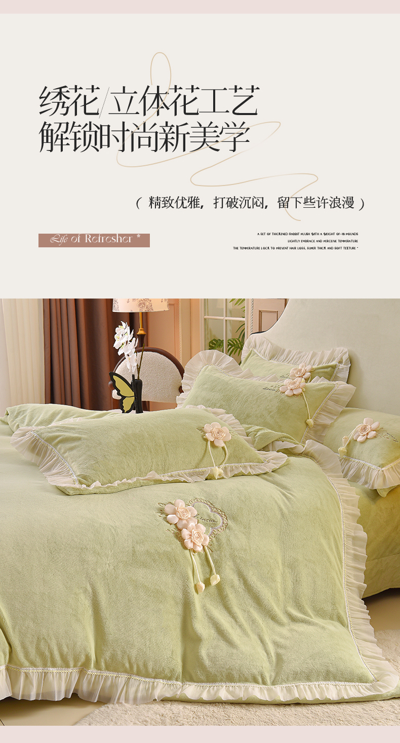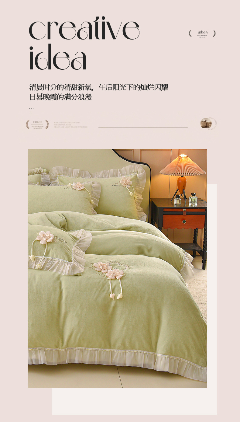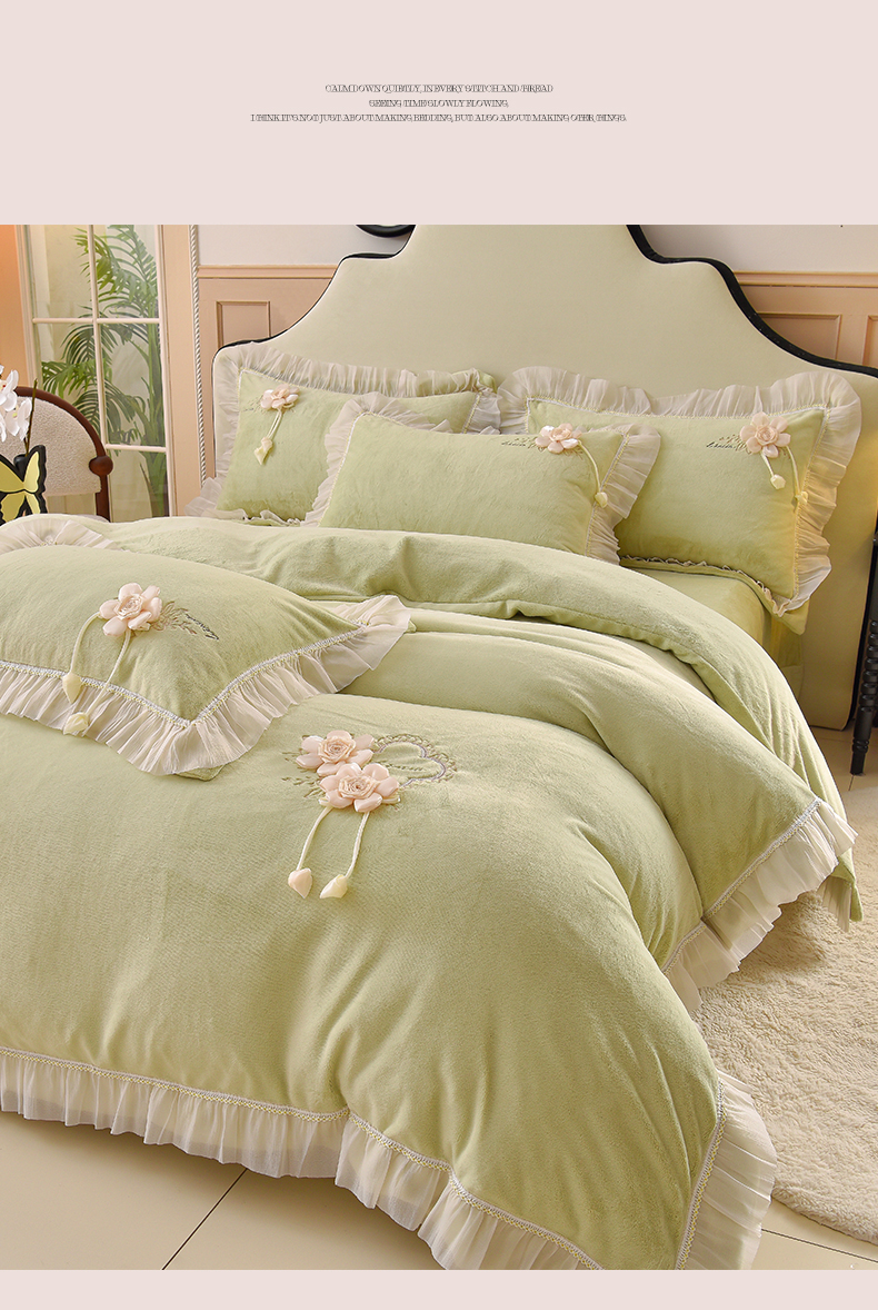 鼎飞家纺 2025新款A类高克重牛奶绒绣花四件套--舒蕾系列 舒蕾-芬绿