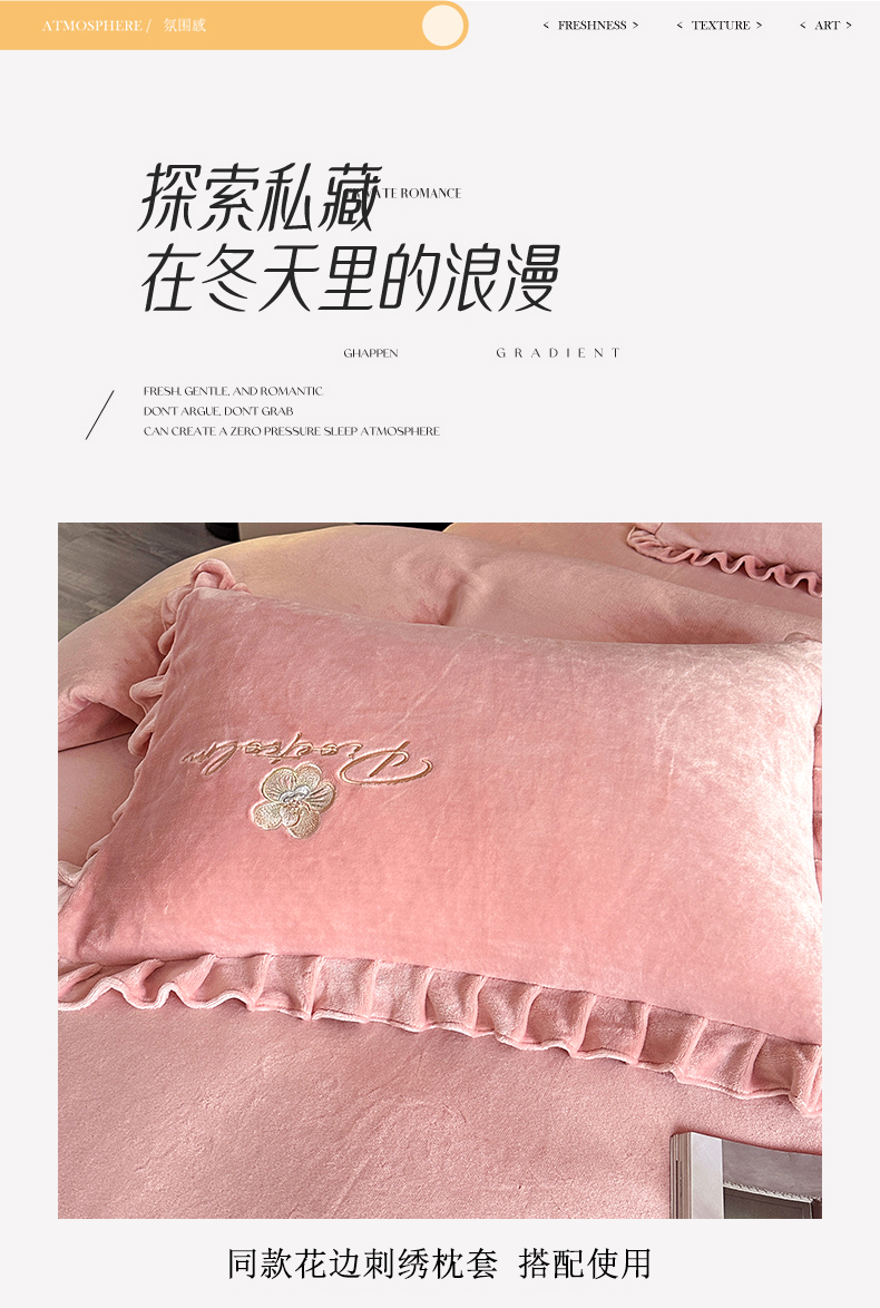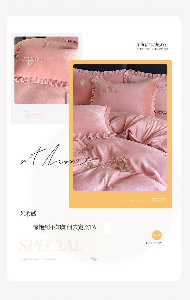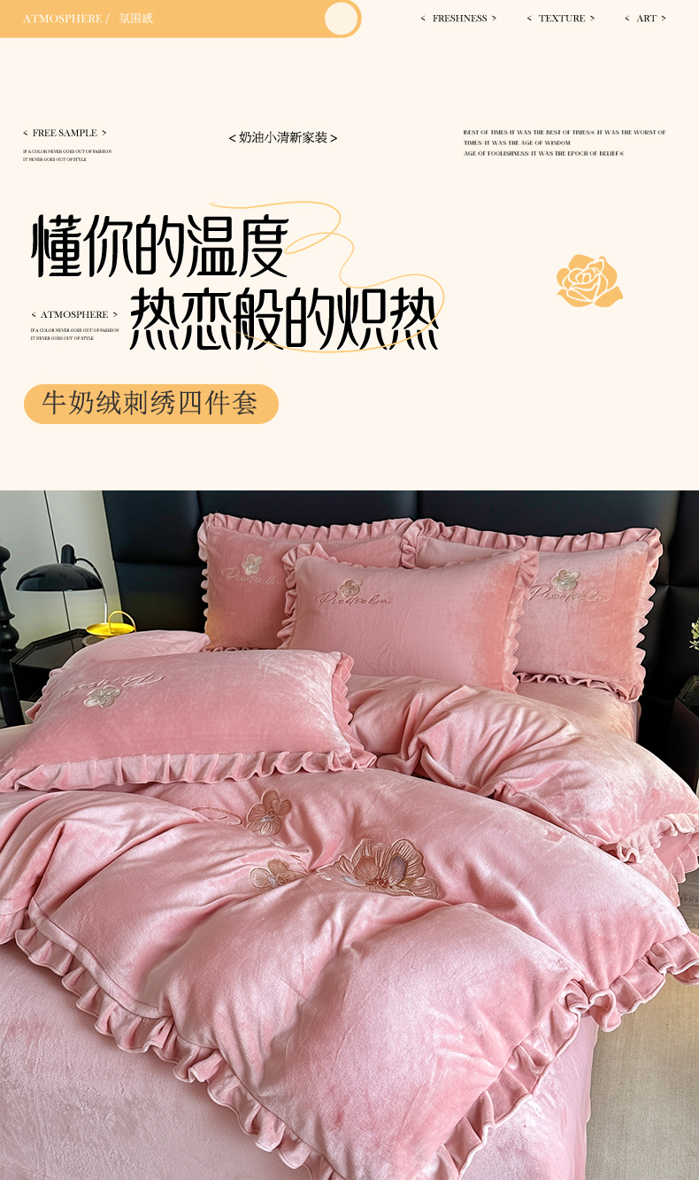 商品名称:董韵家纺 2025新款高克重 250克9-10斤牛奶绒 刺绣床单四件套系列 柔眠-浅豆沙