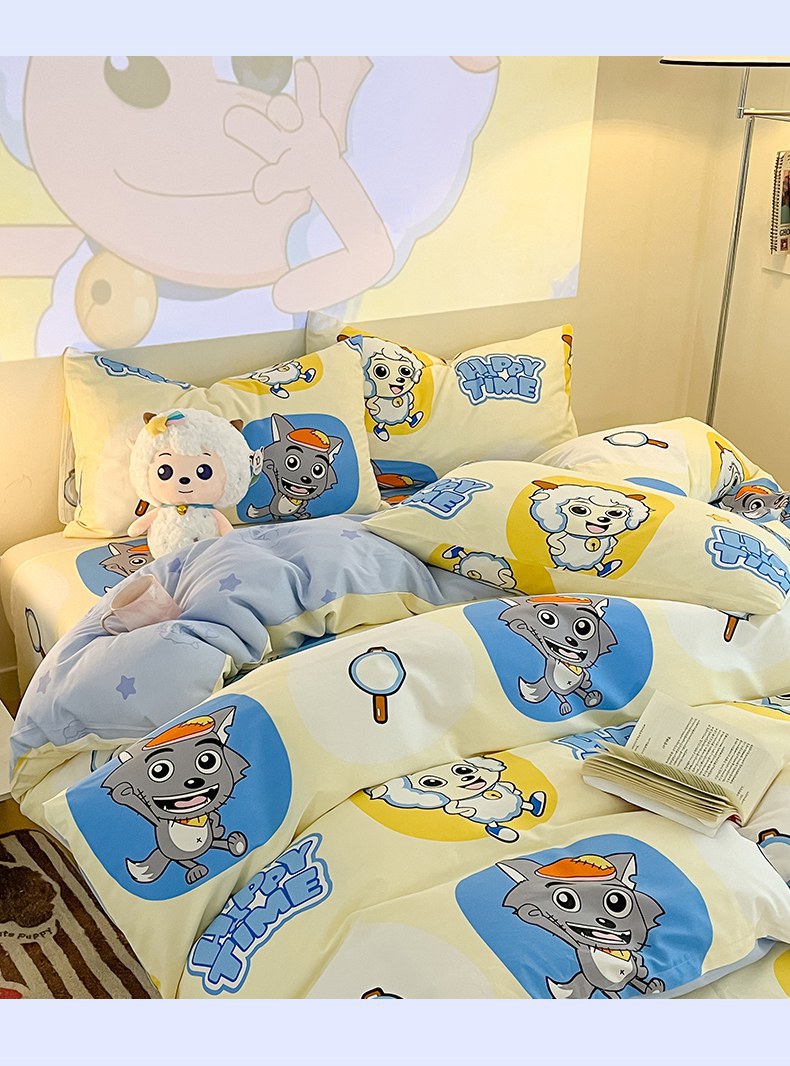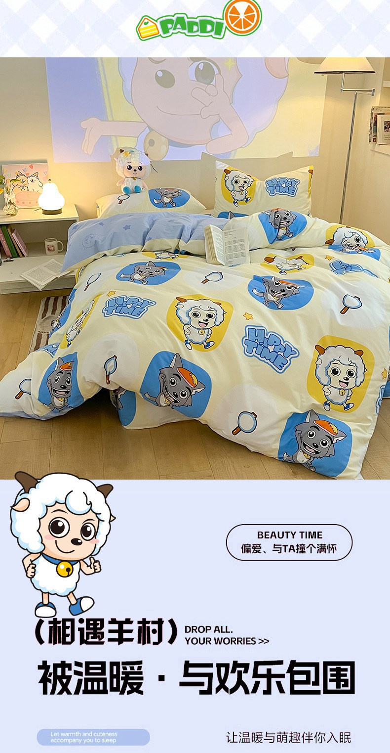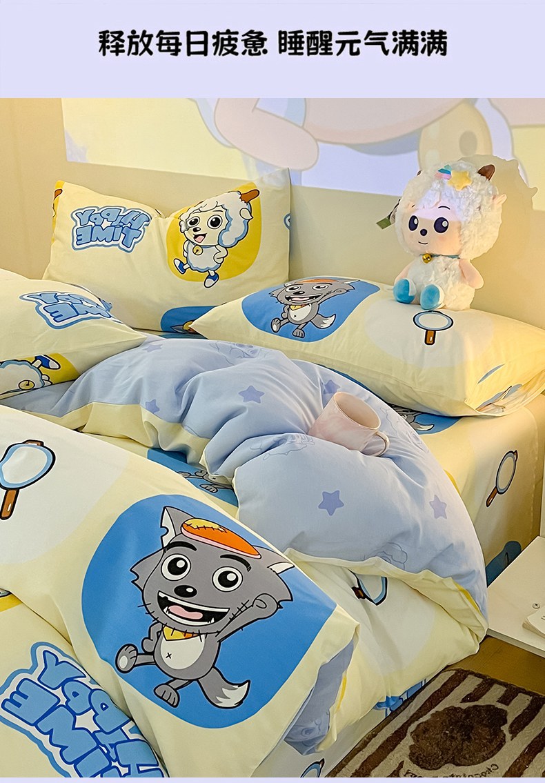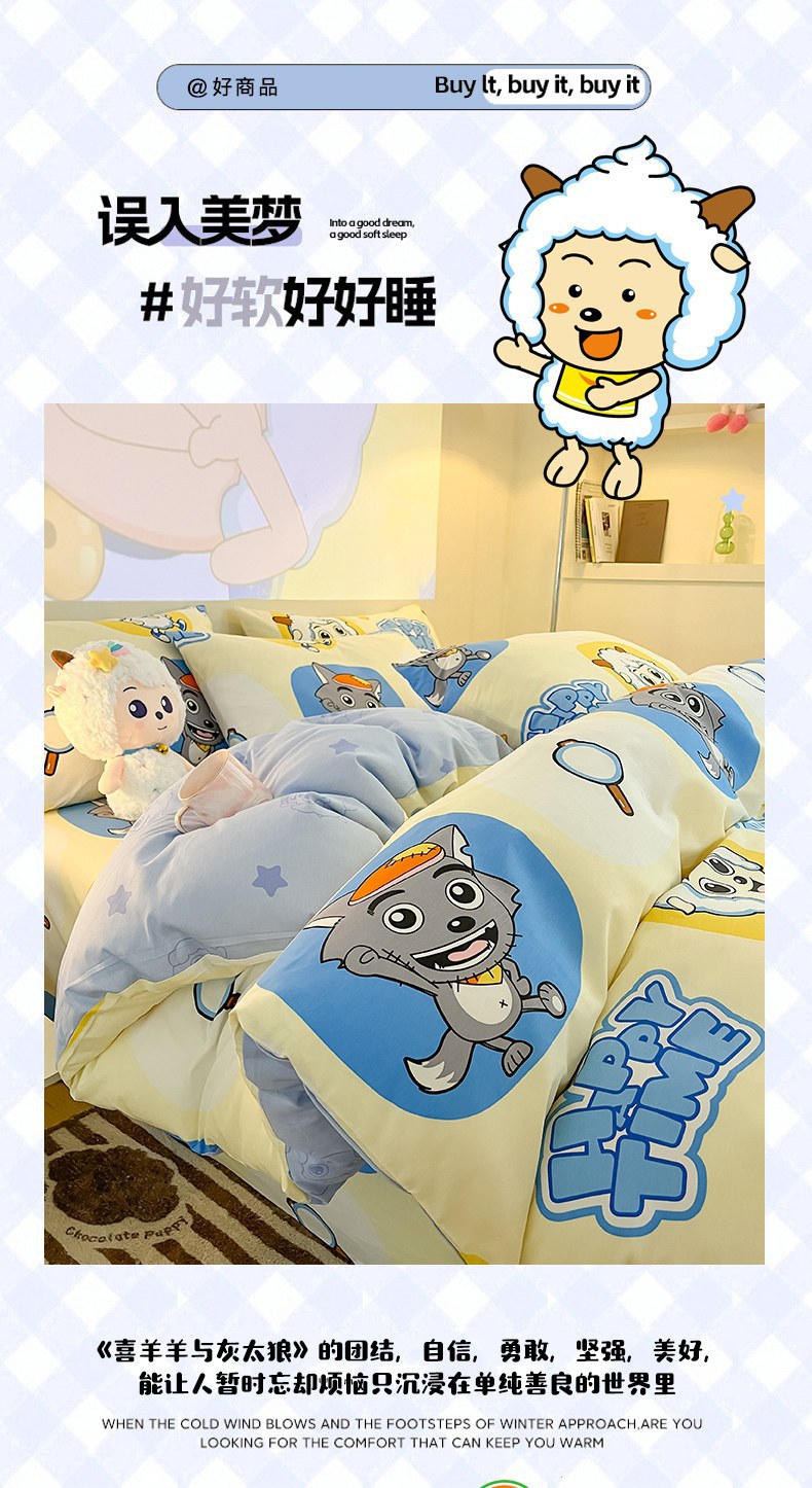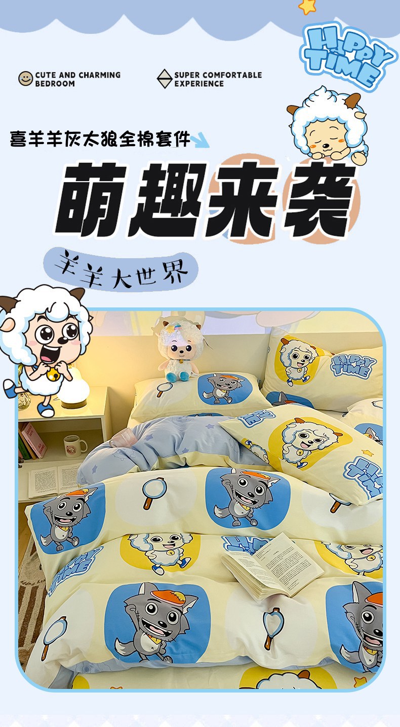 当前位置: 91家纺网 > 商品网购 > 床品套件 > 四件套 > 全棉普通四件套 > 金鑫汇家纺 2025新款喜羊羊与灰太狼全棉四件套 狼羊童话梦