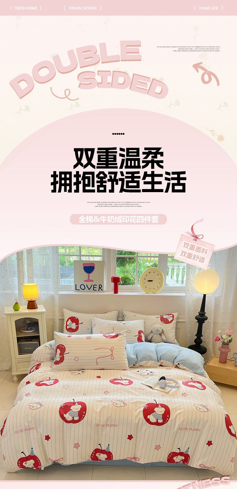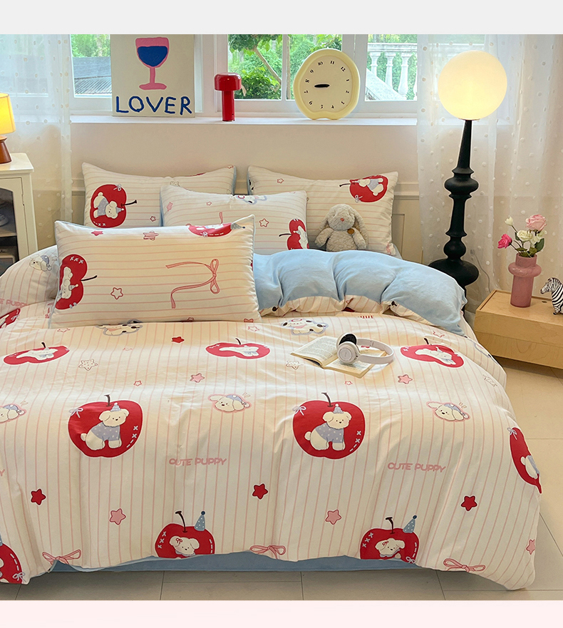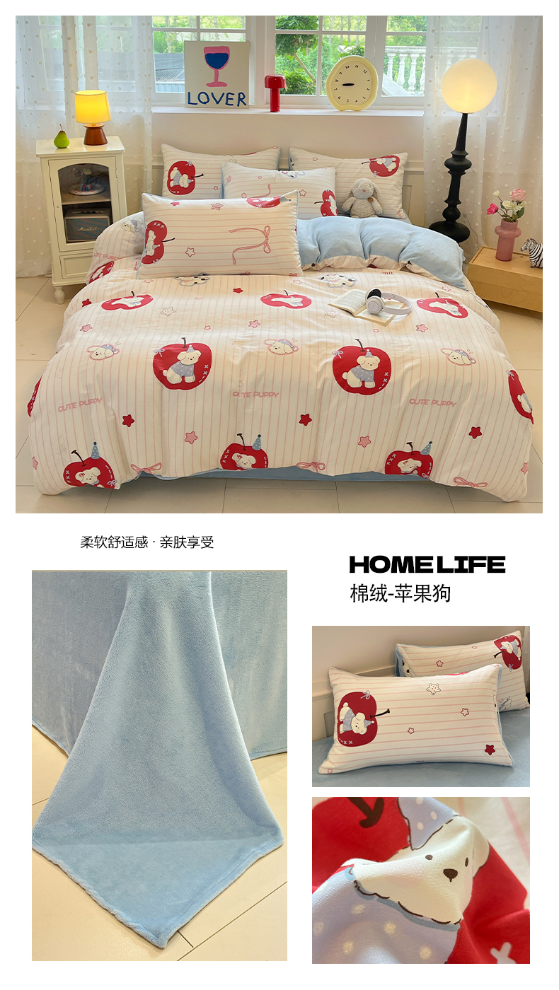 吉象家纺 2025新款全棉牛奶绒印花四件套 棉绒-苹果狗