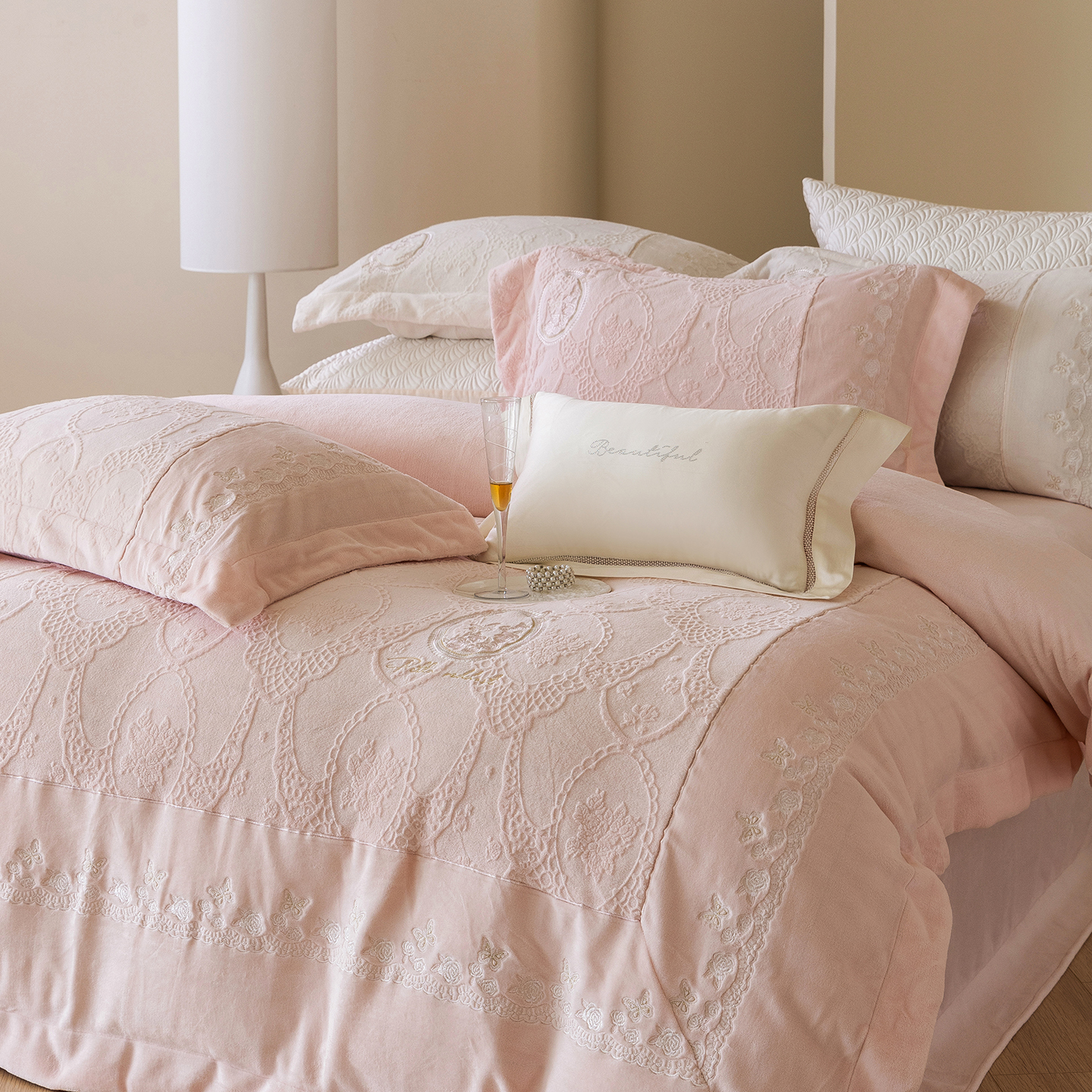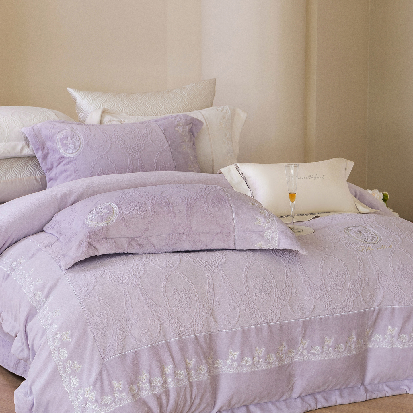 佳汐蓝家纺 2025新款双色拼接刺绣全消光牛奶绒四件套-翩然入梦 控价:券后不低于398 翩然入梦-米白色