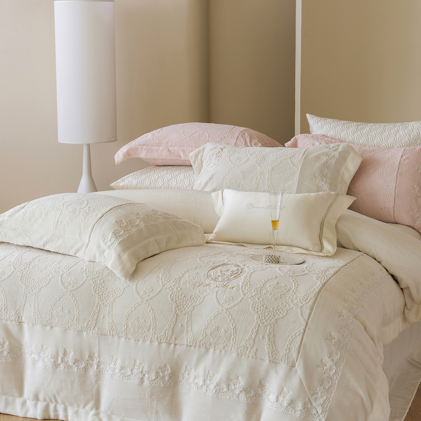 (总)佳汐蓝 2025春夏新品双层皱皱纱刺绣+织带+荷叶边四件套--白茶花,奶白,曲奇