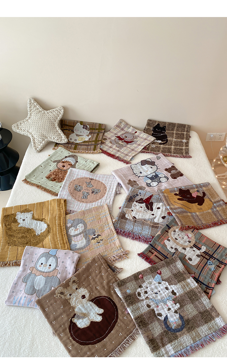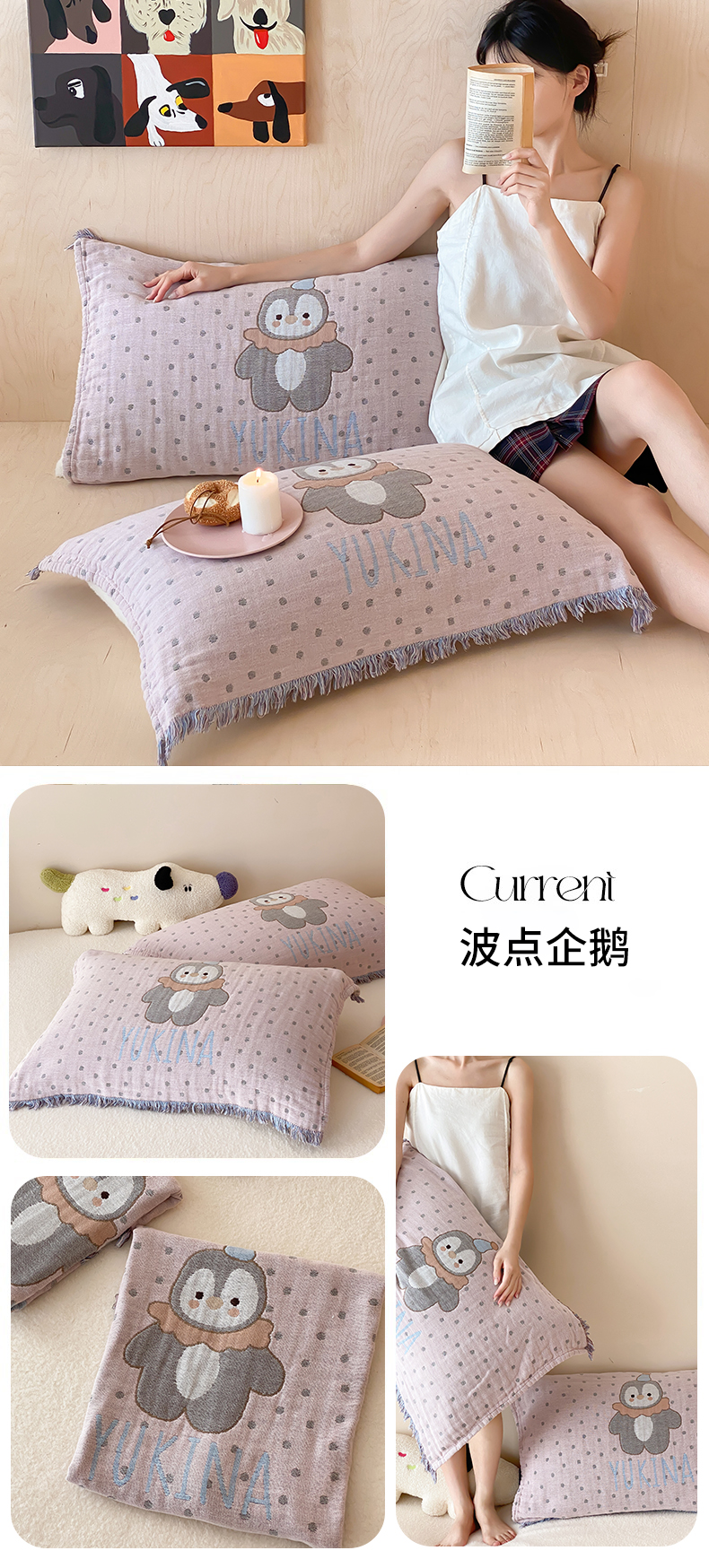 (总)麻依 2025新款全棉四层纱布软萌流苏枕巾,波点企鹅,蛋糕企鹅,蛋糕小咪,调皮小猫,乖乖狗,锣鼓小熊,帽子小象,沙发小狗,鲨鱼小狗,玩偶熊KT,线团小咪,香蕉小猫,鸭鸭小猫,杂技小狗,组合图