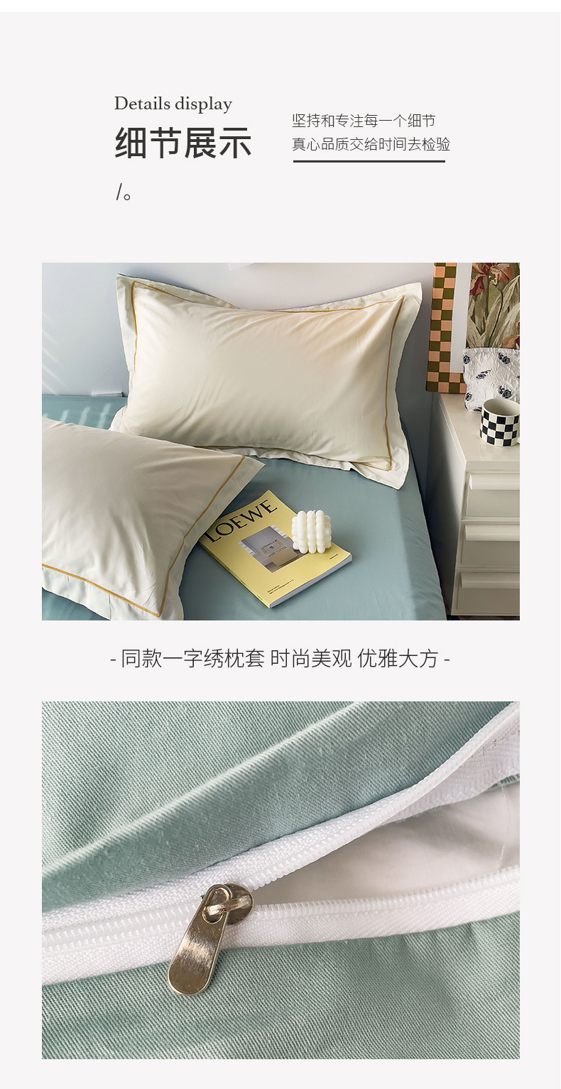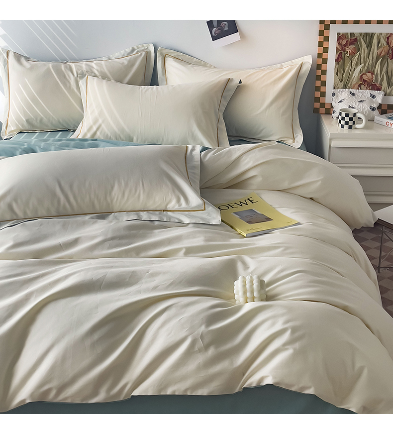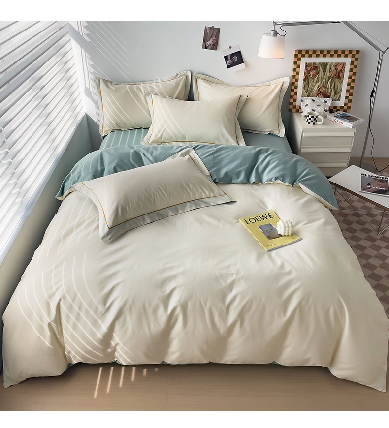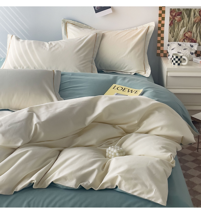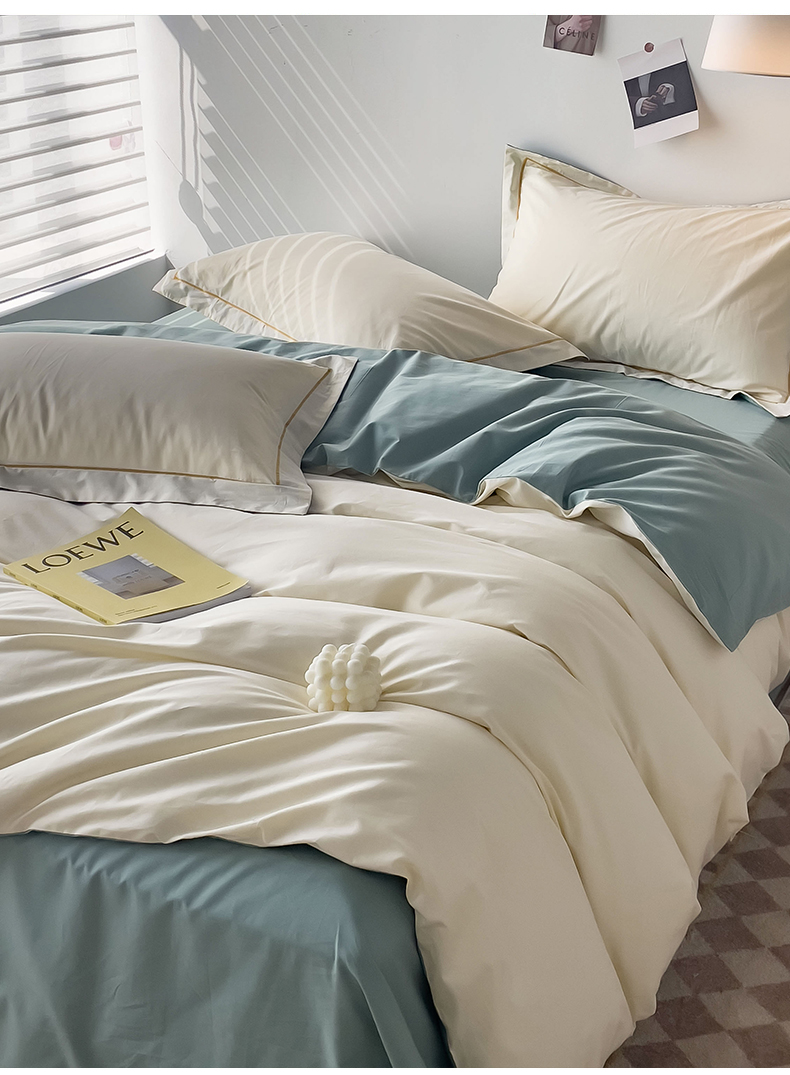 当前位置: 91家纺网 > 商品网购 > 床品套件 > 四件套 > 全棉普通四件套 > 锦彩家居 2026新款40支正宗13372双拼纯色全棉四件套酒店宾馆民宿学生三件套(可定制)标准号的床单是圆角吊边;小号和加大的床单都是直角 奶昔白-豆绿