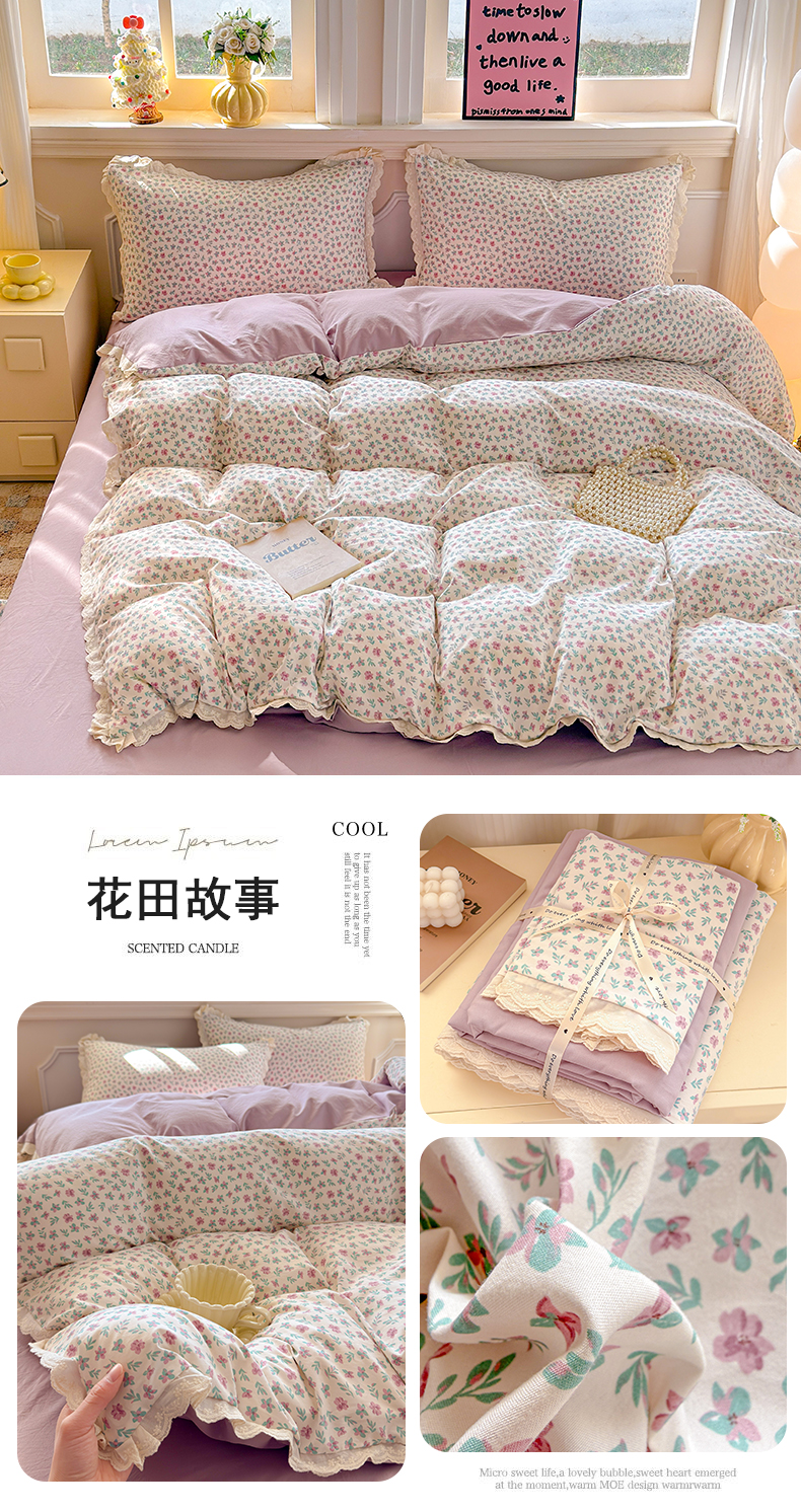 商品名称:芯贝儿 2026新款古法小清新全棉花边仿棉水洗棉法式四件套件被套床单 夏日初恋