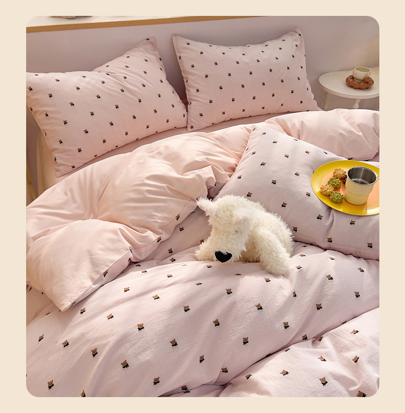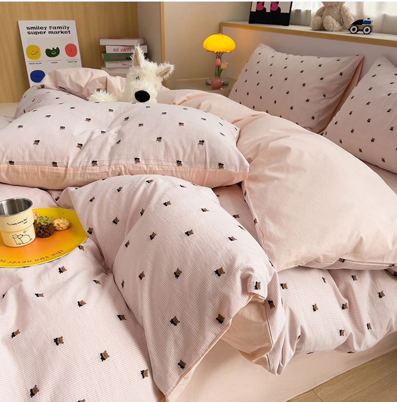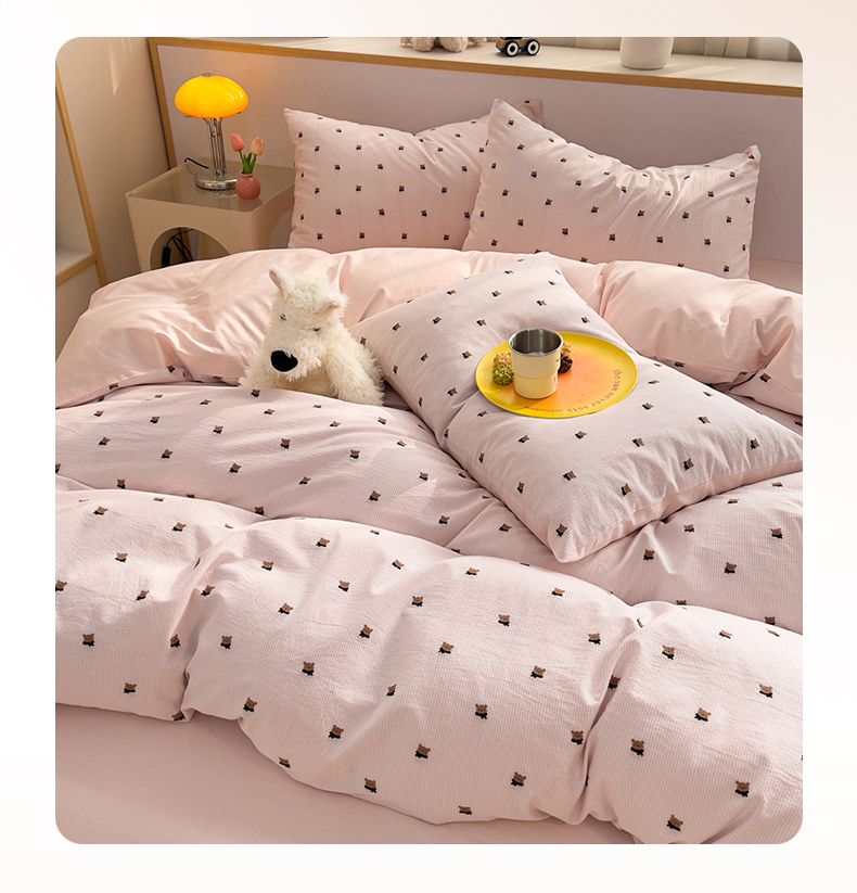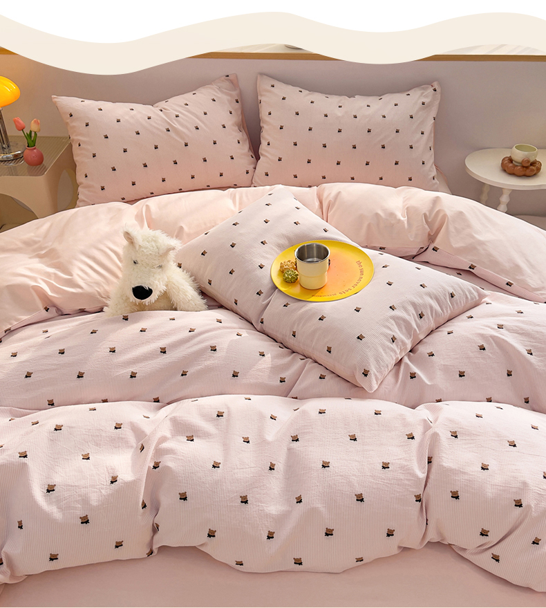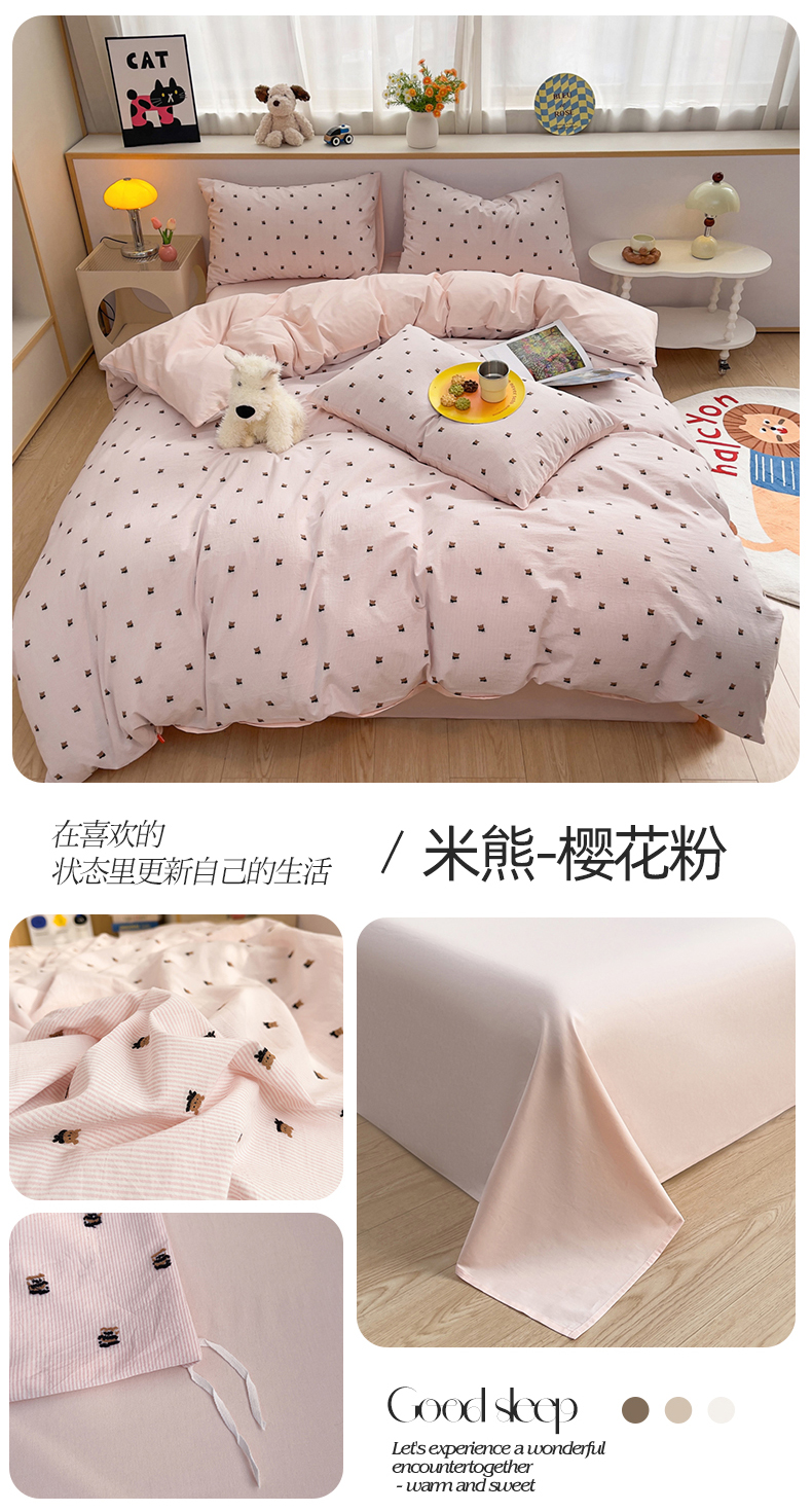 商品名称:炫拼家纺 2026新款A类全棉60支色织提花剪花B版40支水洗棉四件套-米熊系列 米熊-樱花粉