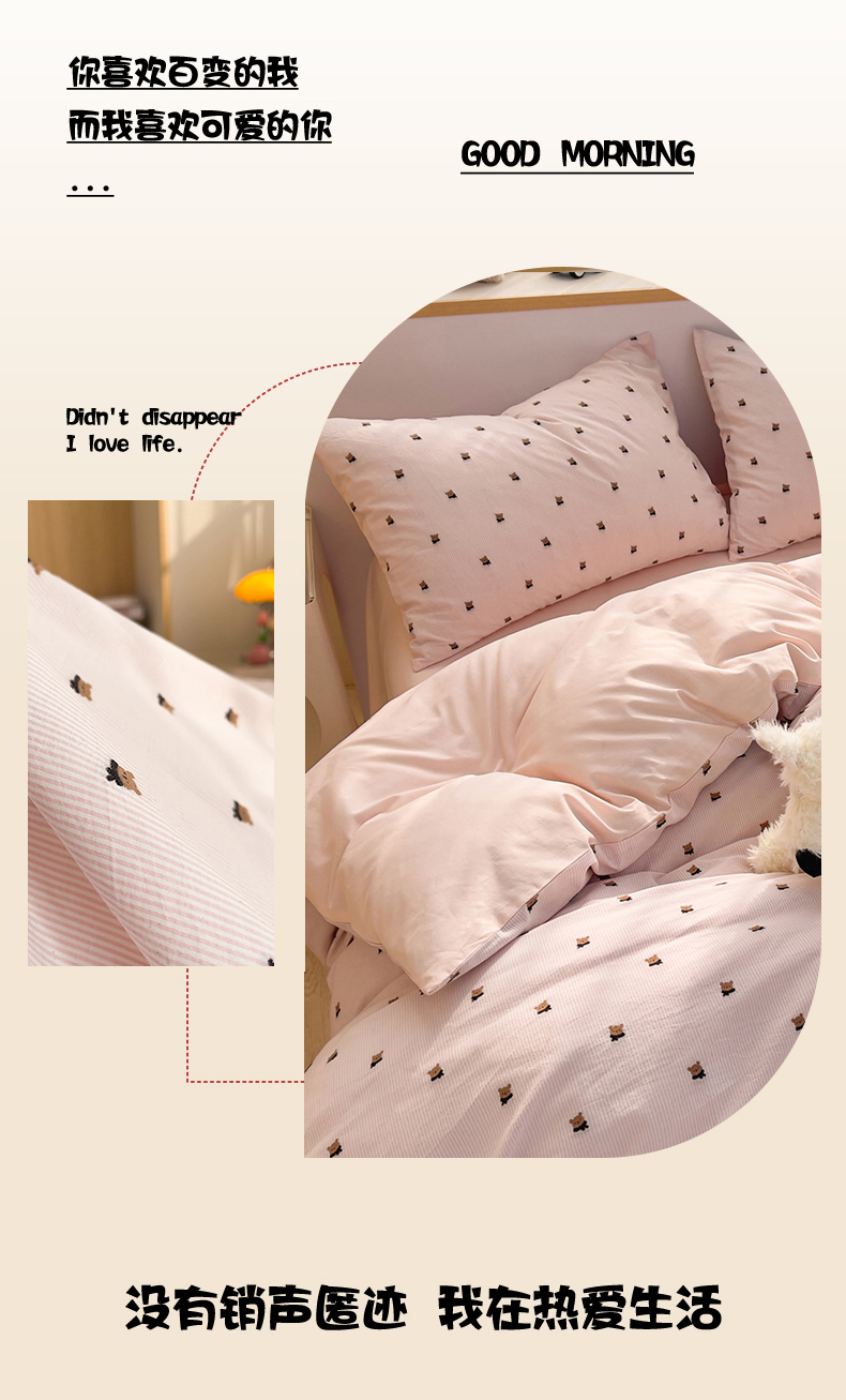 炫拼家纺 2026新款A类全棉60支色织提花剪花B版40支水洗棉四件套-米熊系列 米熊-樱花粉
