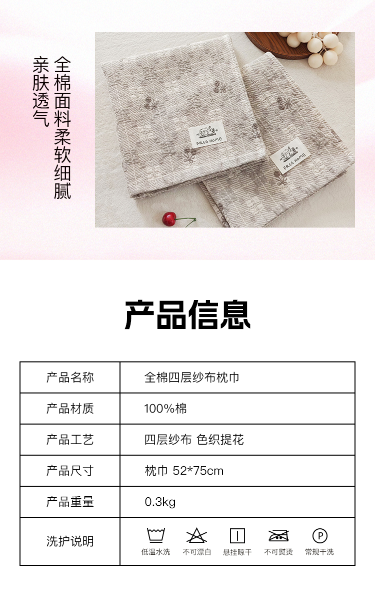 商品名称:沐瑟家纺 2026新款安心棉纯棉纱布枕巾 草莓
