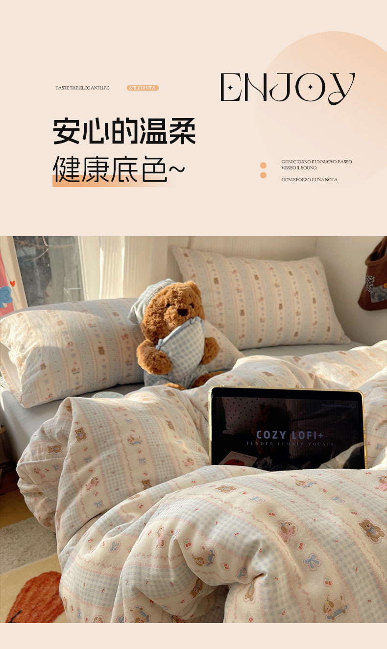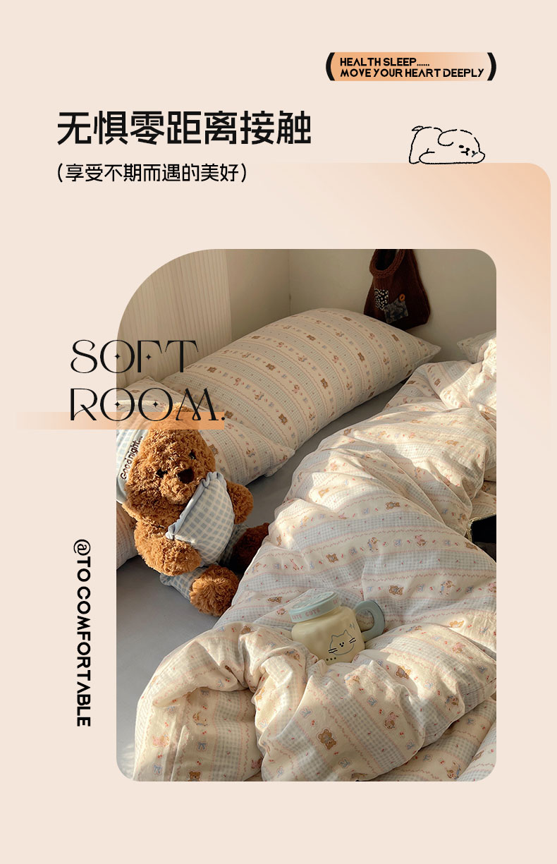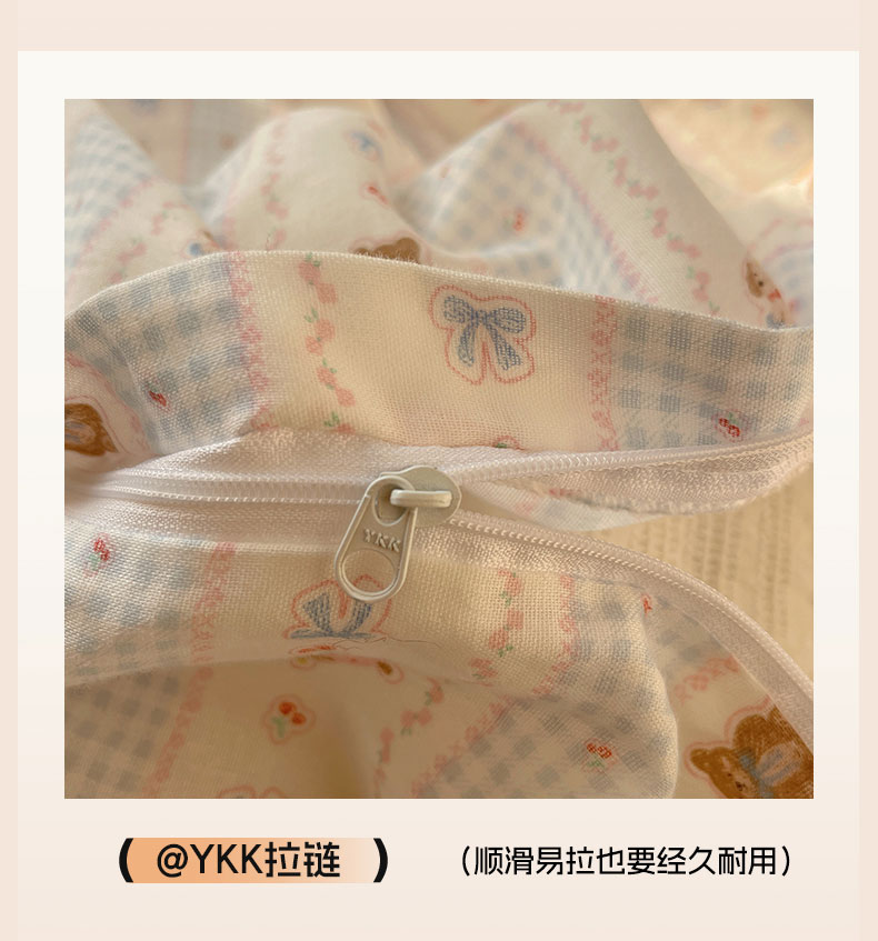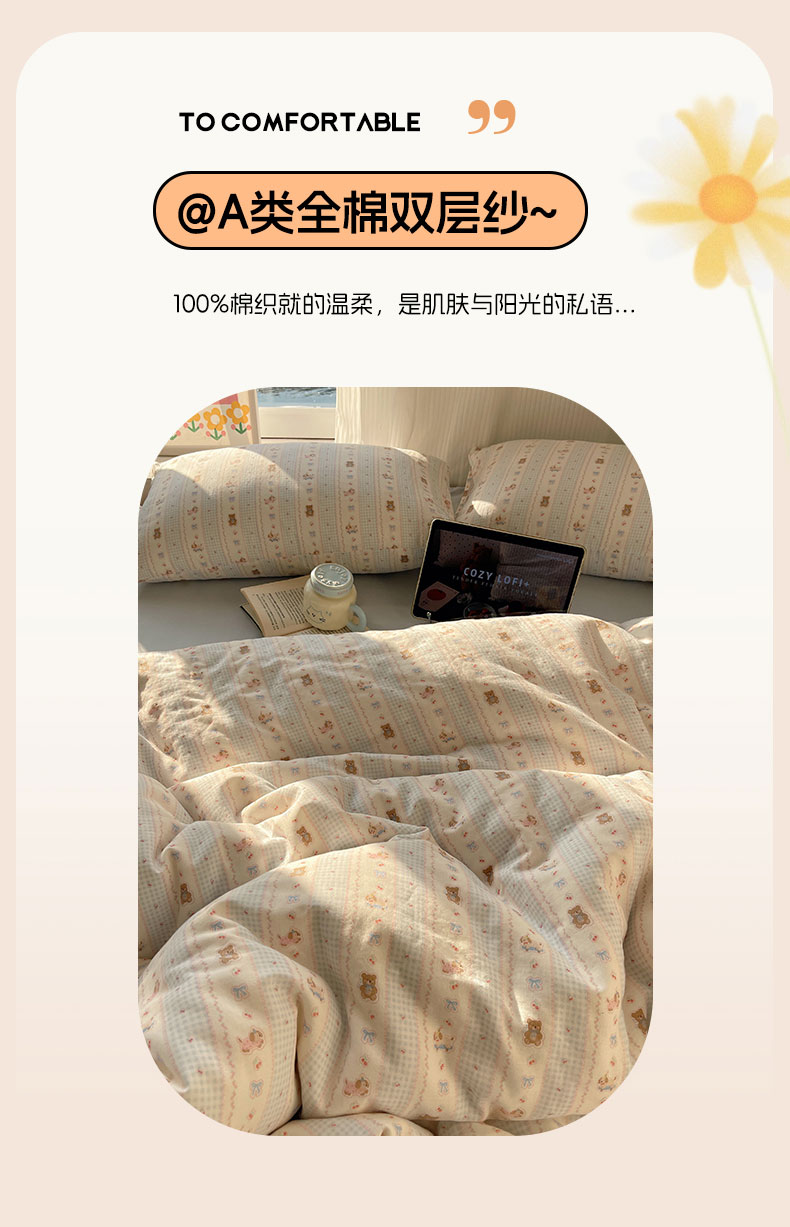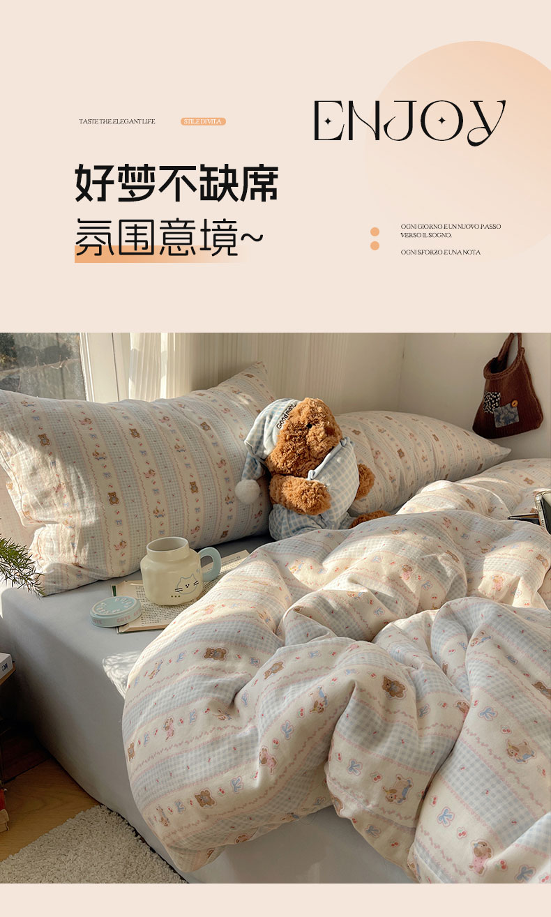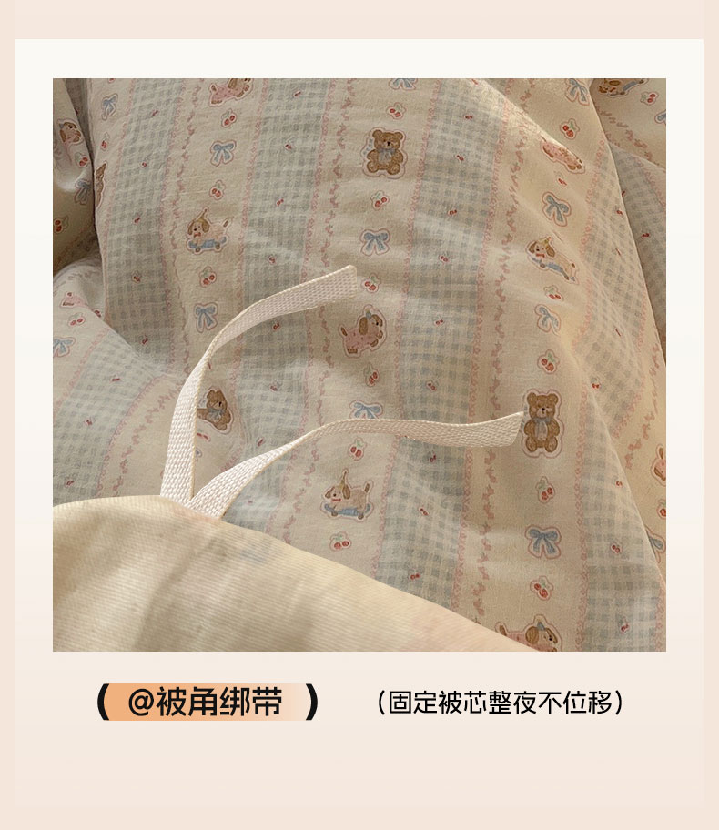 当前位置: 91家纺网 > 商品网购 > 床品套件 > 四件套 > 全棉普通四件套 > 六巷胡同 2026新款INS博主风卡通A类全棉双层纱四件套 双层纱-海盐樱桃熊