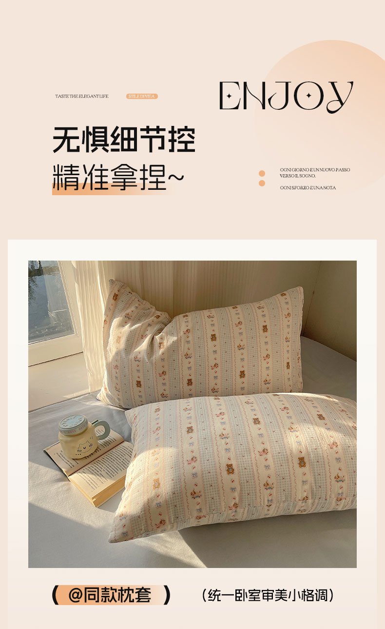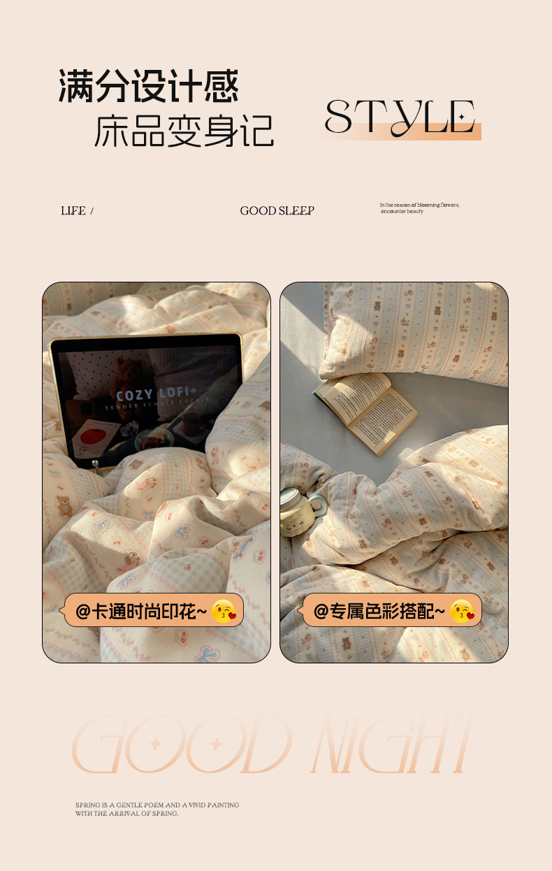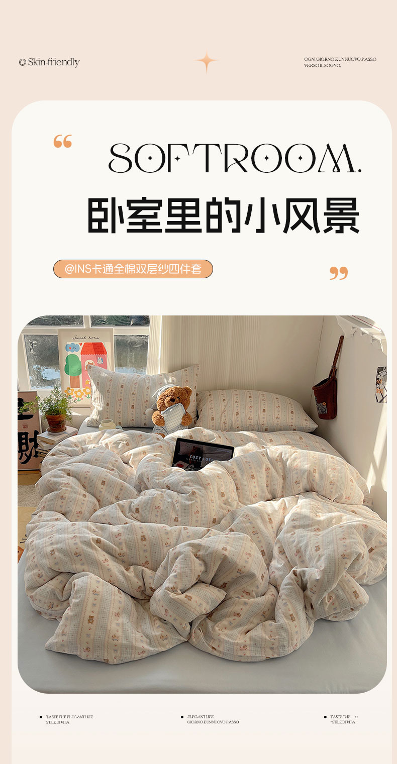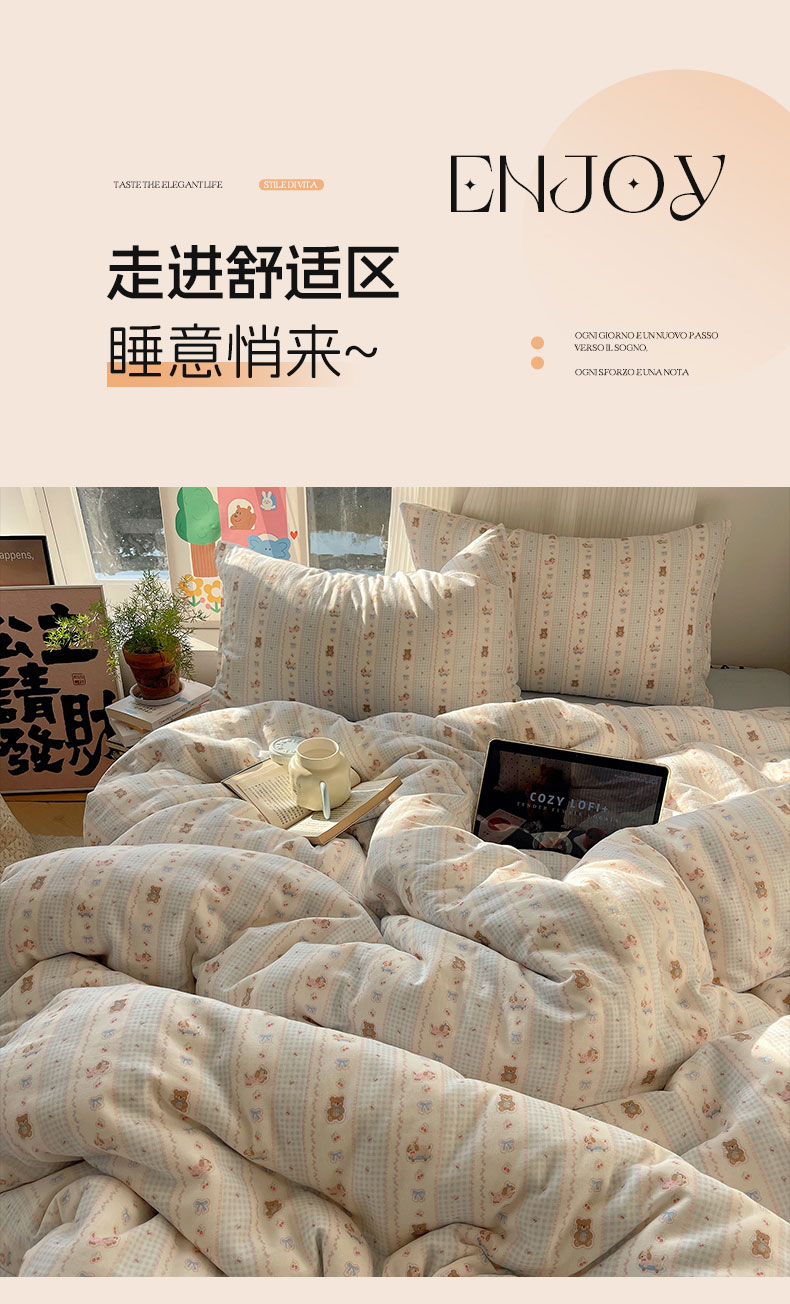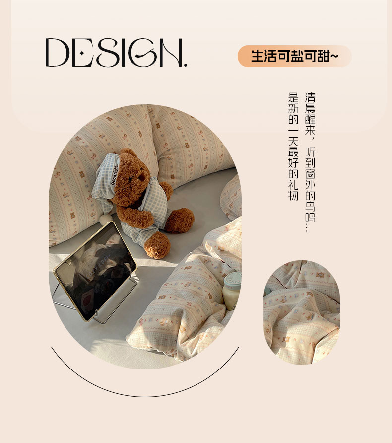 当前位置: 91家纺网 > 商品网购 > 床品套件 > 四件套 > 全棉普通四件套 > 六巷胡同 2026新款INS博主风卡通A类全棉双层纱四件套 双层纱-海盐樱桃熊