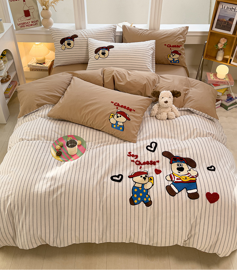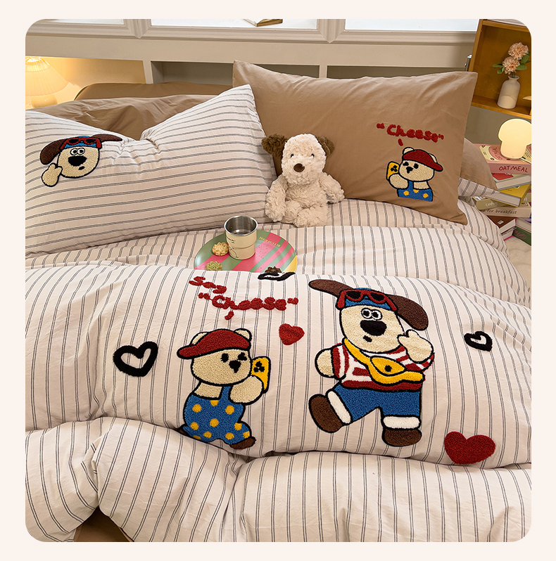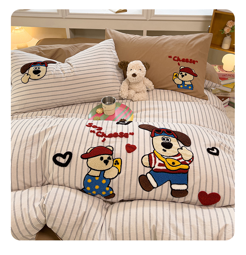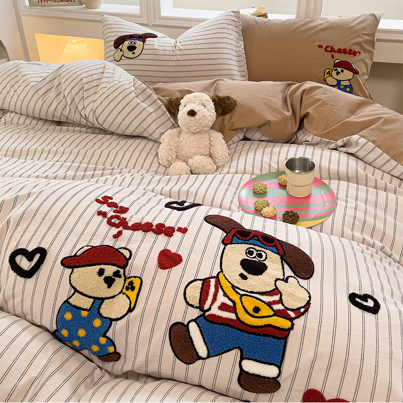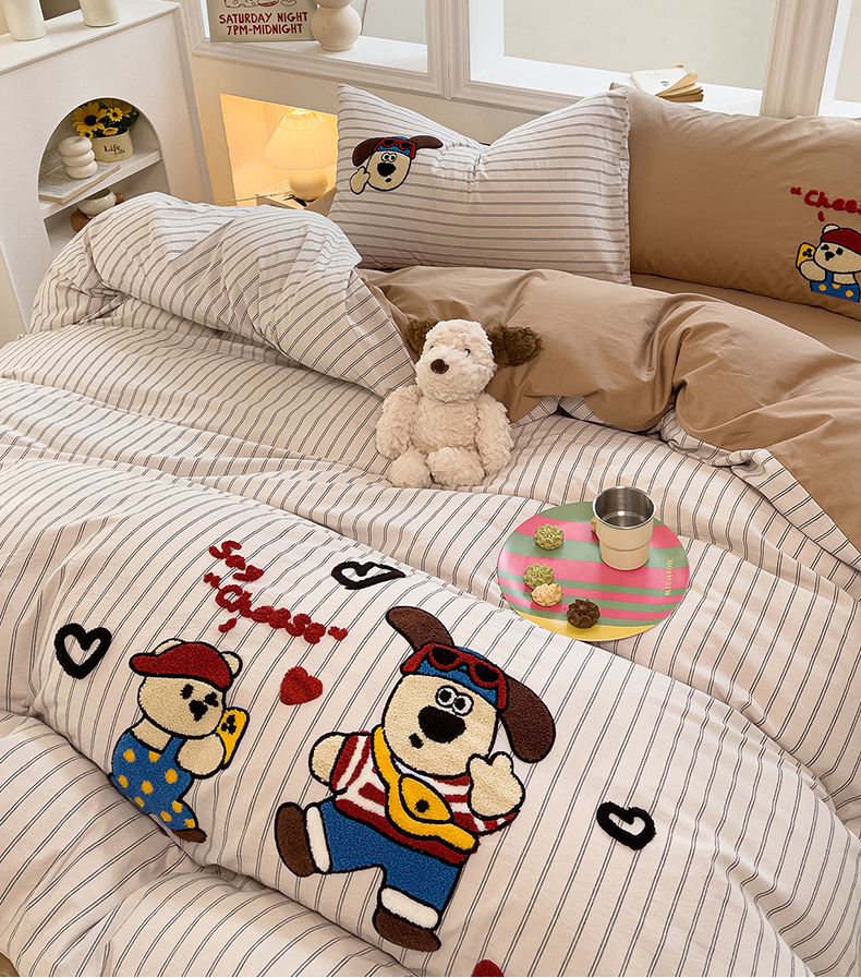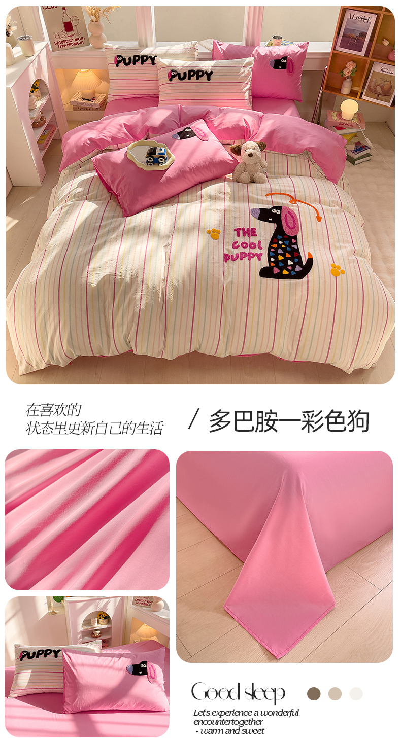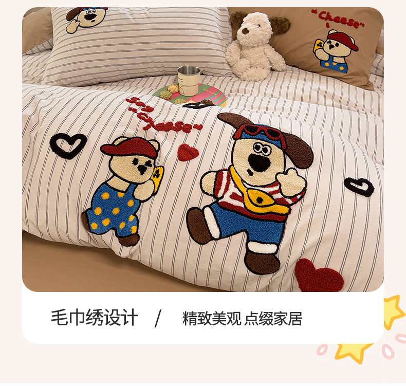 当前位置: 91家纺网 > 商品网购 > 床品套件 > 四件套 > 全棉普通四件套 > 炫拼家纺 2026新款多巴胺系列A类全棉40支水洗棉卡通毛巾绣四件套 多巴胺一小熊与狗