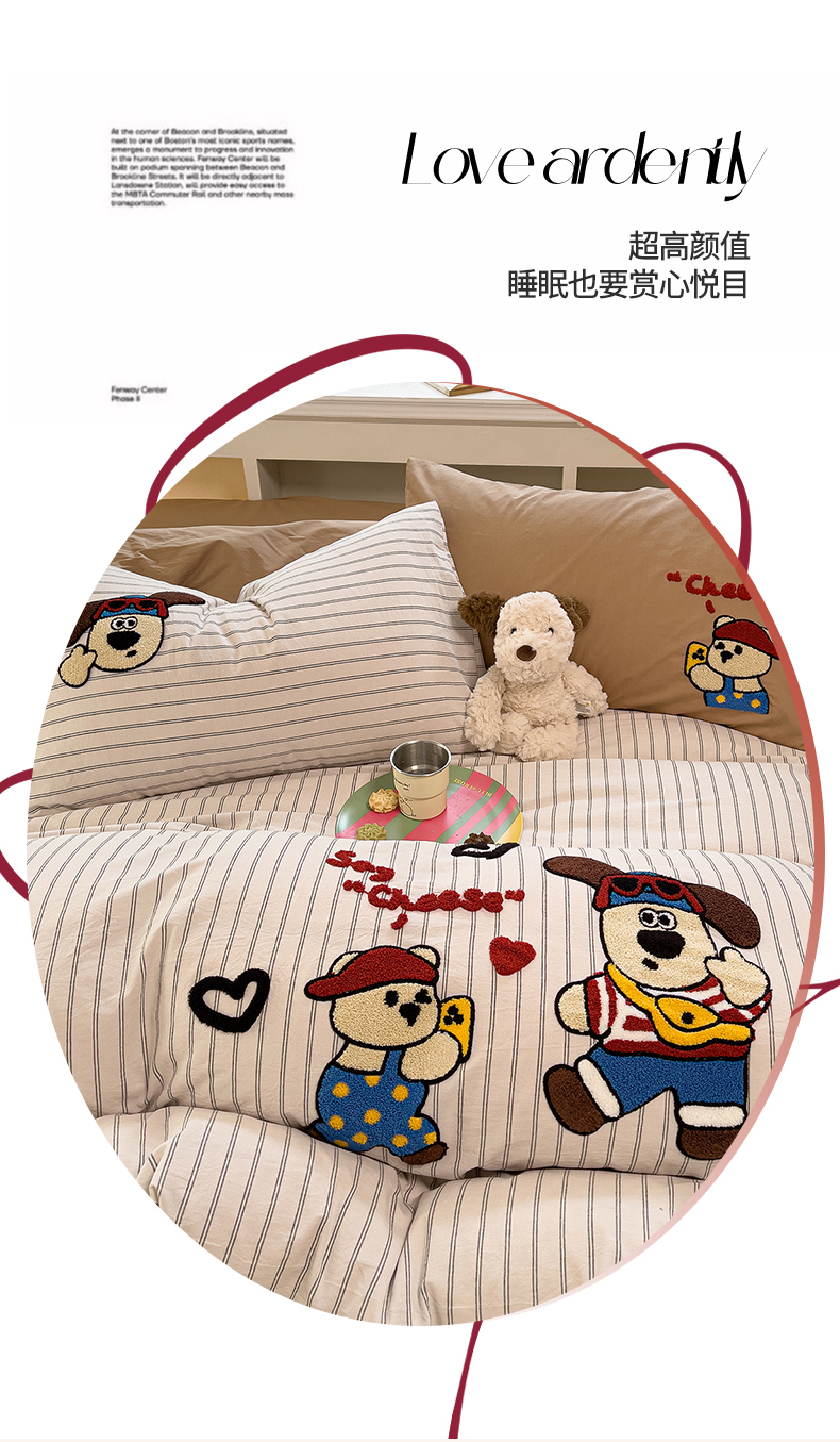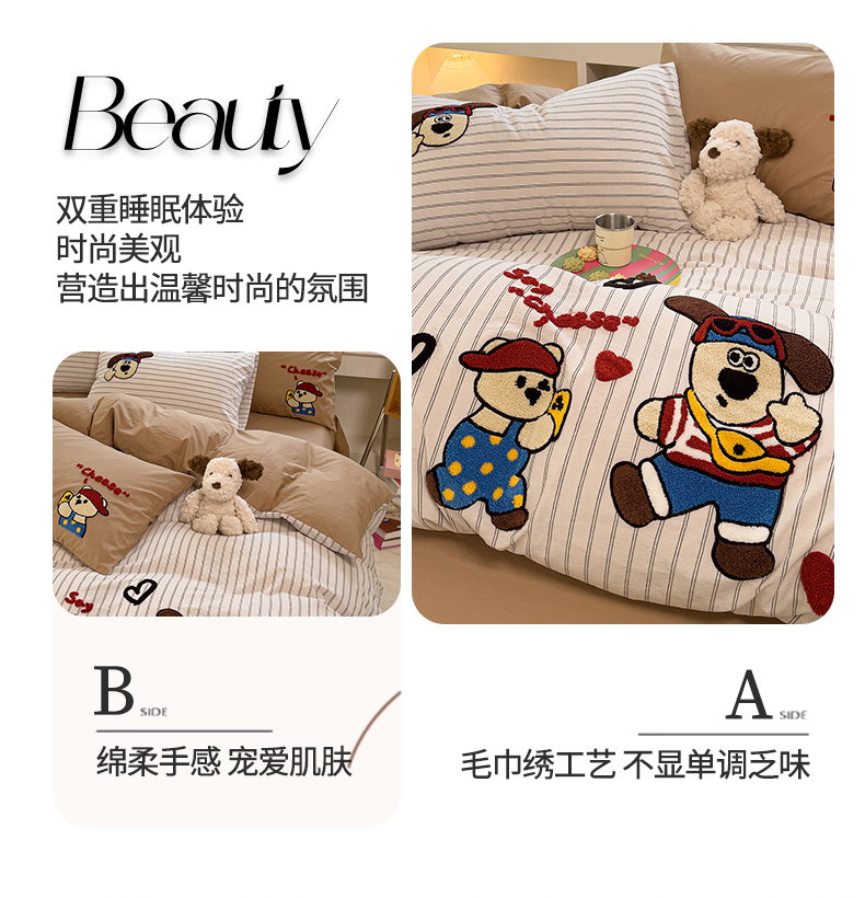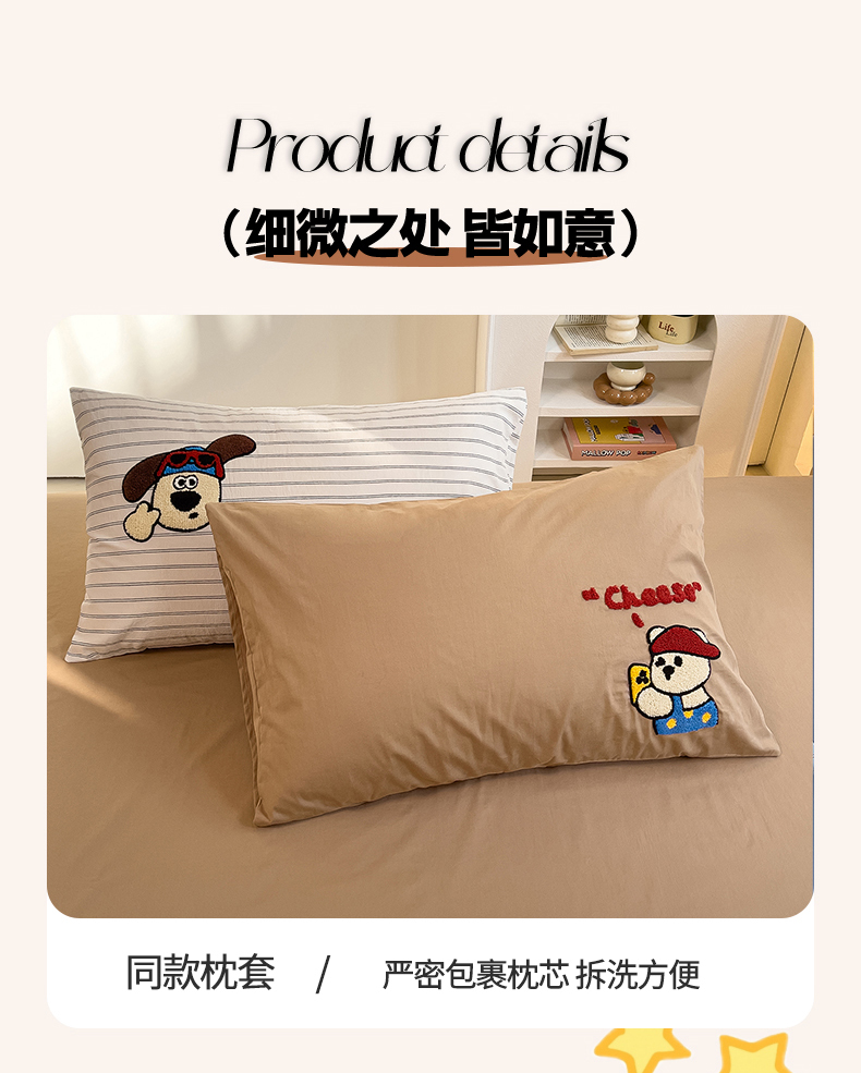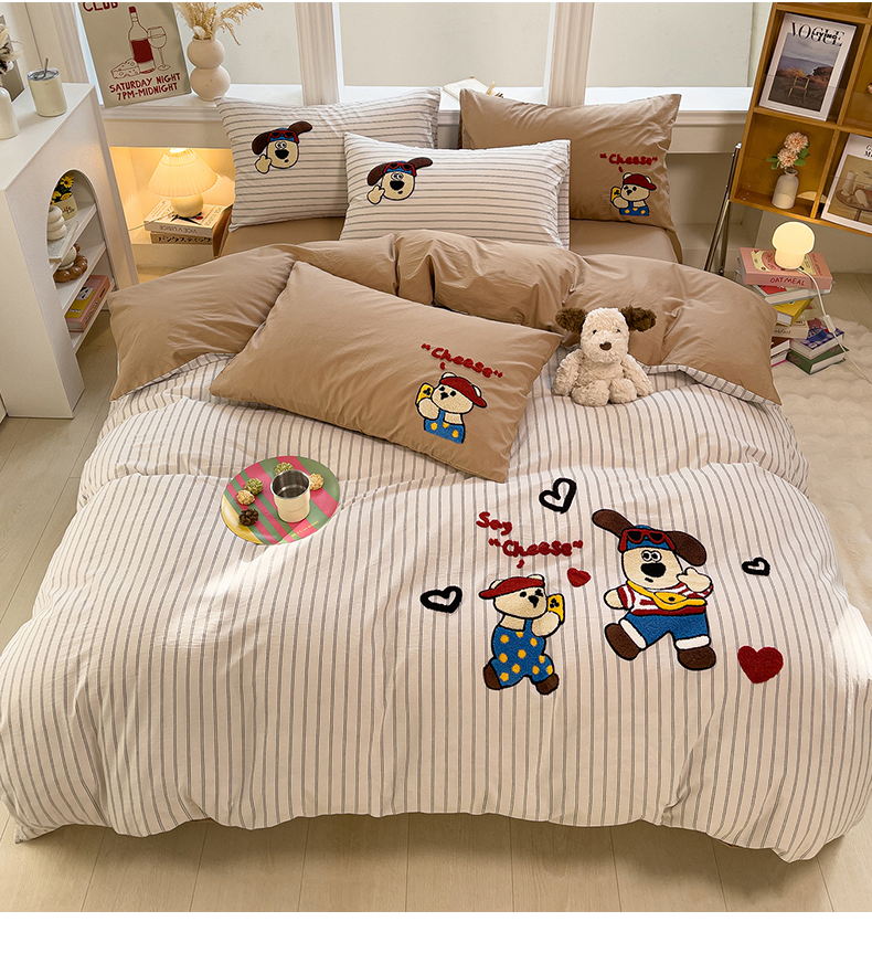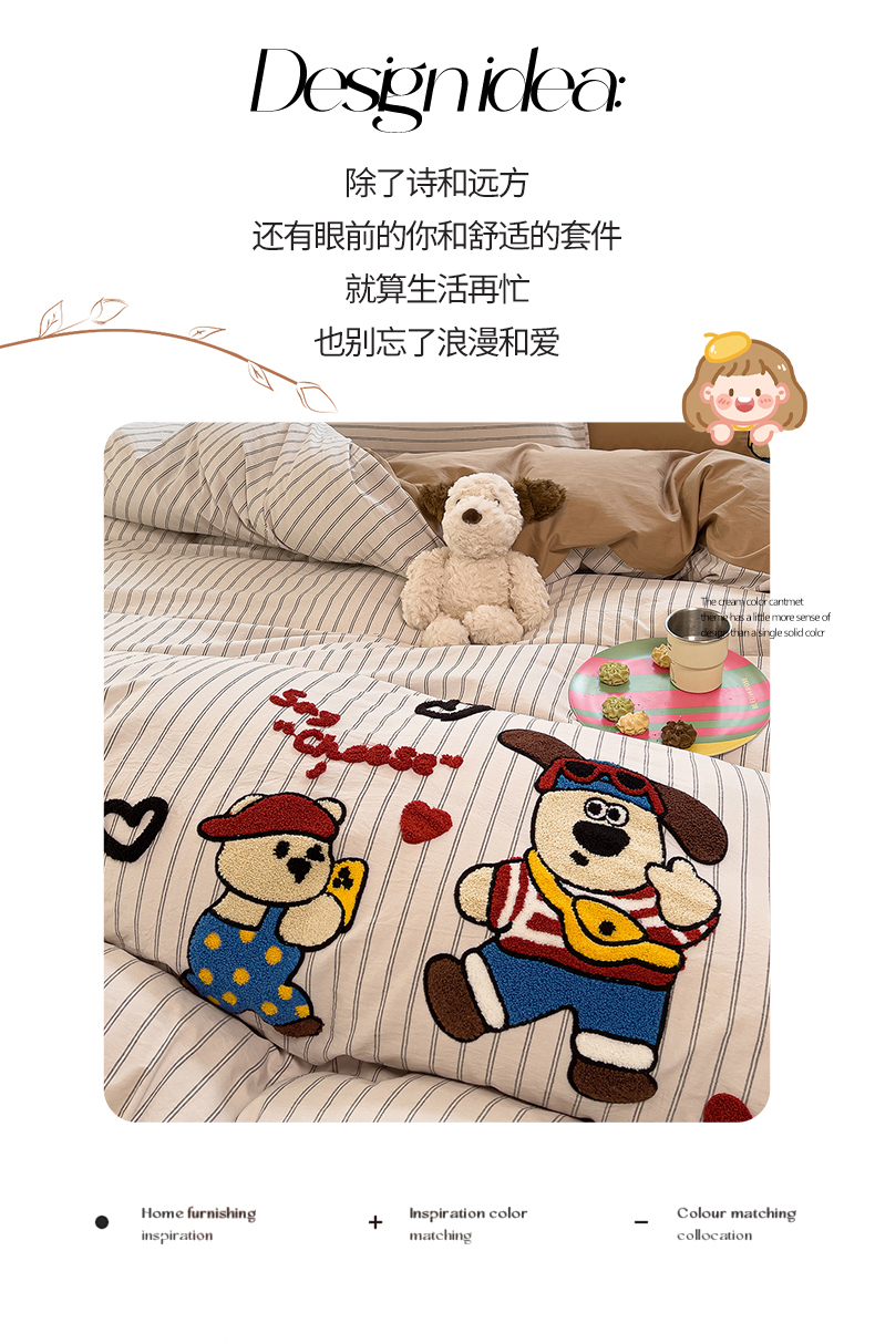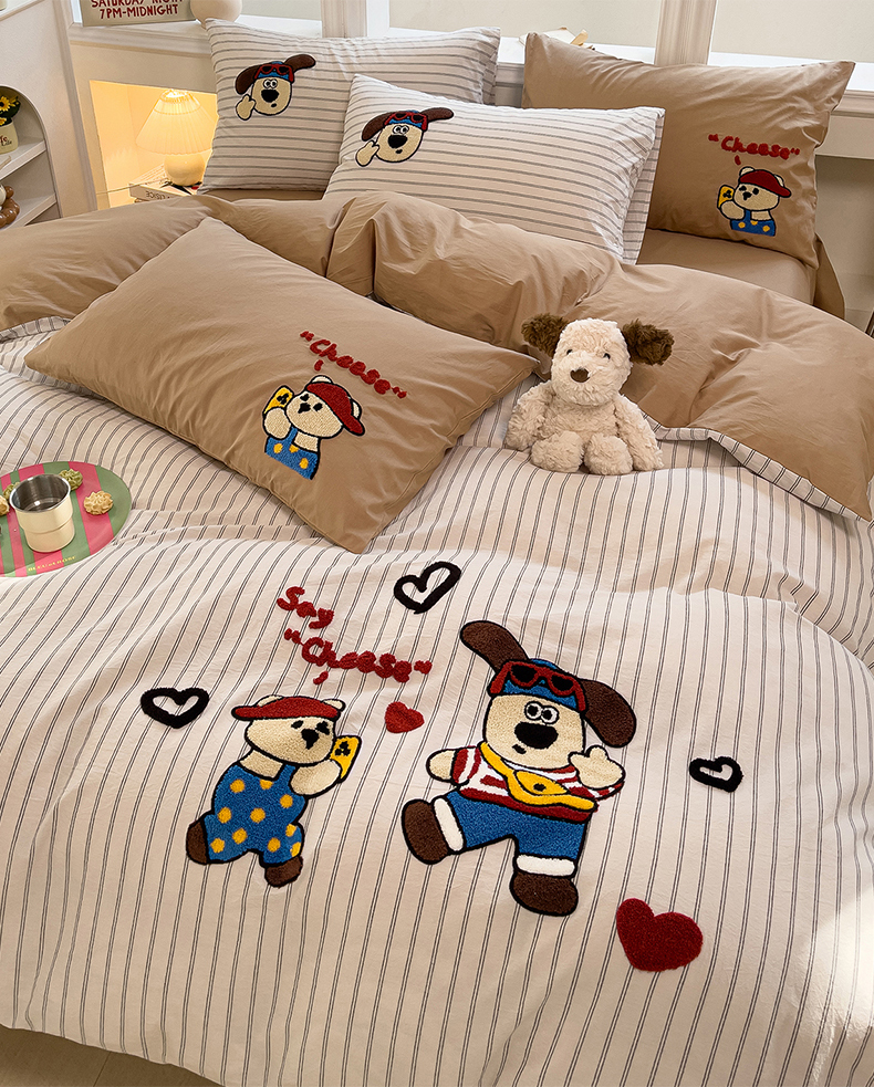 当前位置: 91家纺网 > 商品网购 > 床品套件 > 四件套 > 全棉普通四件套 > 炫拼家纺 2026新款多巴胺系列A类全棉40支水洗棉卡通毛巾绣四件套 多巴胺一小熊与狗