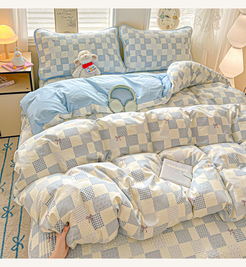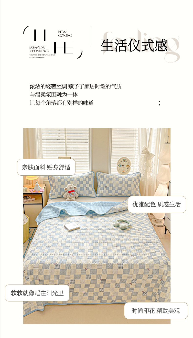 (总)岚吉家纺 2025新款全棉绗缝棉花床盖花边款三件套四件套,缤纷樱桃,草莓格子,花边兔,黄苏条,蓝美人,落落晨光,萌萌狮,蘑菇狗,秋日玫瑰,兔菲菲,向晚,小黑点点(米),游花间