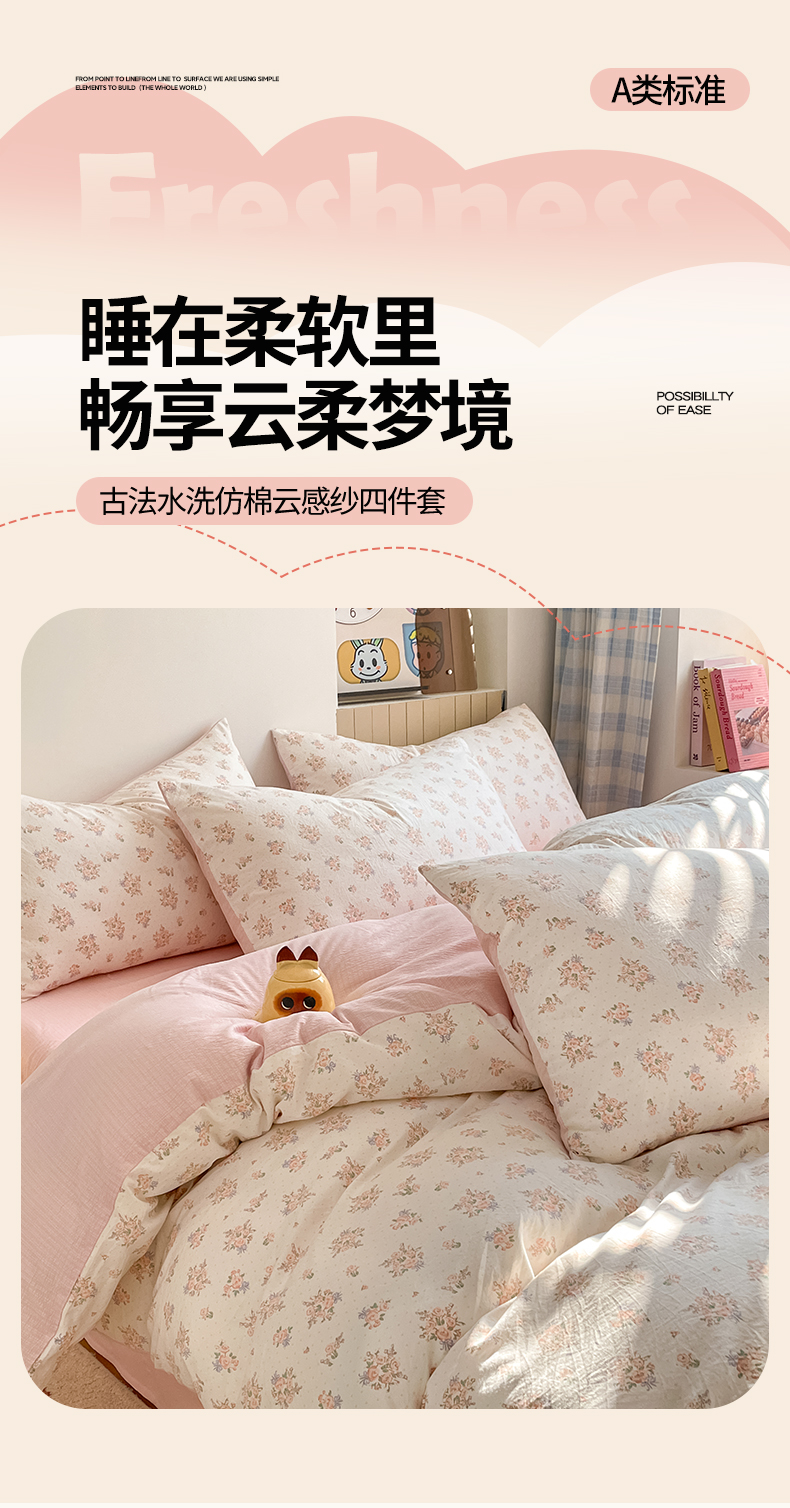 当前位置: 91家纺网 > 商品网购 > 床品套件 > 四件套 > 水洗棉四件套 > 云玲时尚 2026新款古法水洗仿棉云感纱四件套 可爱南瓜