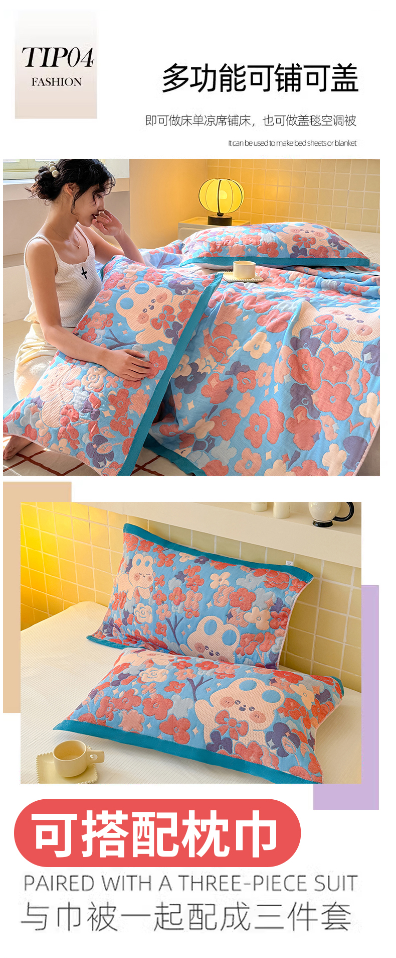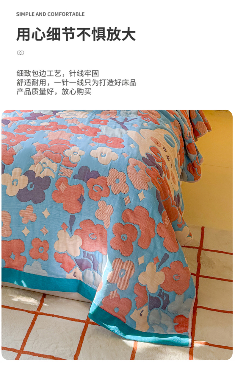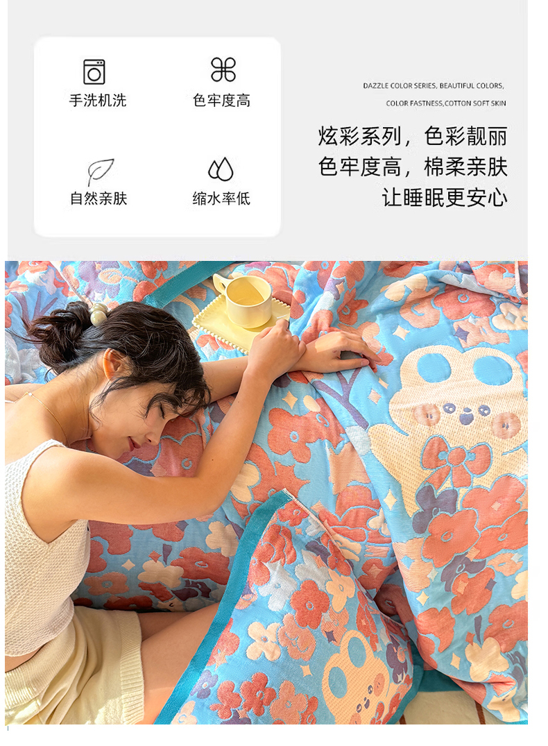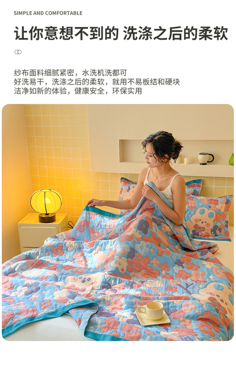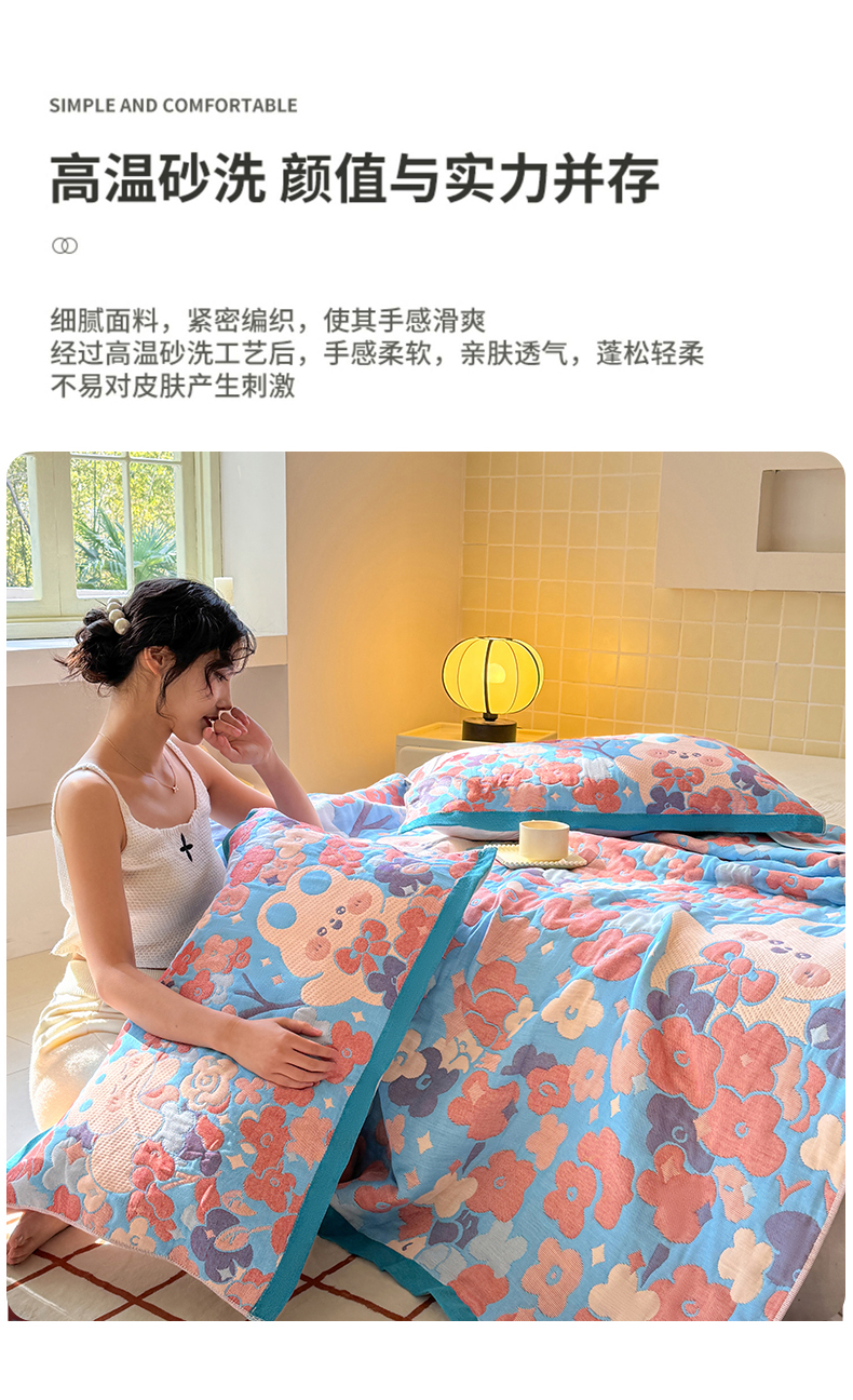 商品名称:朴尔家纺-毛巾被 2026新款彩棉云柔三层纱布毛巾被三件套盖毯 春樱