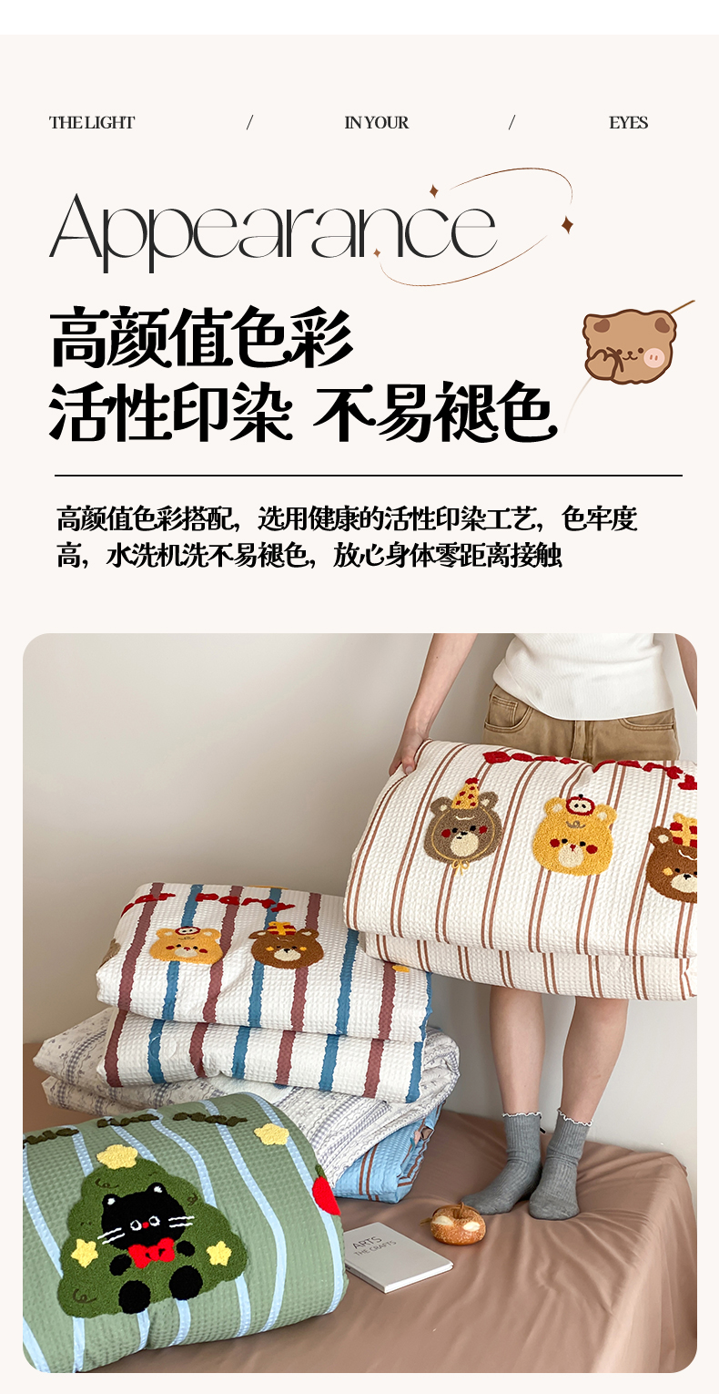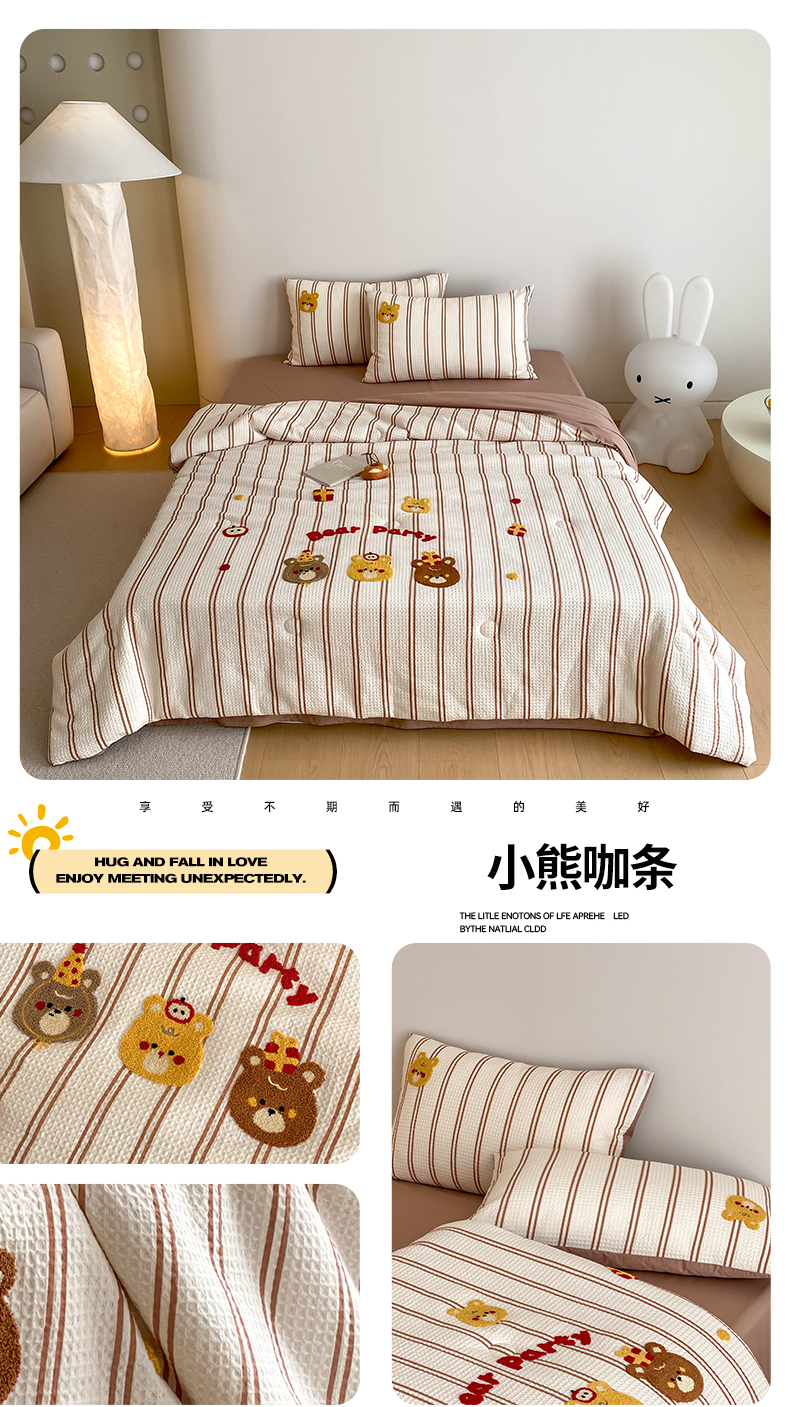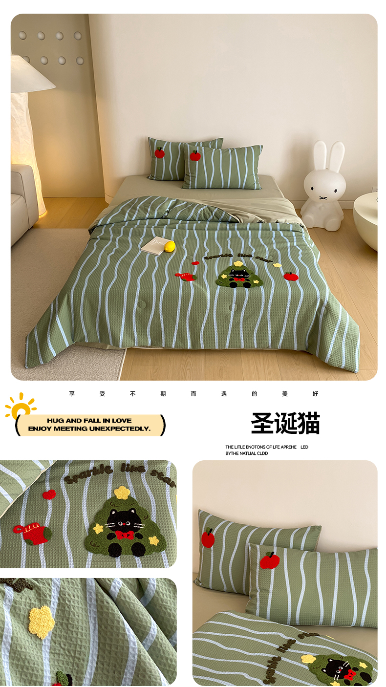 • 91家纺网 家纺一手货源 找家纺 (总)鸣升家纺 2026新款a类全棉华夫格贴布绣全棉夏被四件套空调被芯夏凉被棉花被,乐天雪人,平安兔,圣诞猫,小熊咖条,小熊蓝红条,组合图