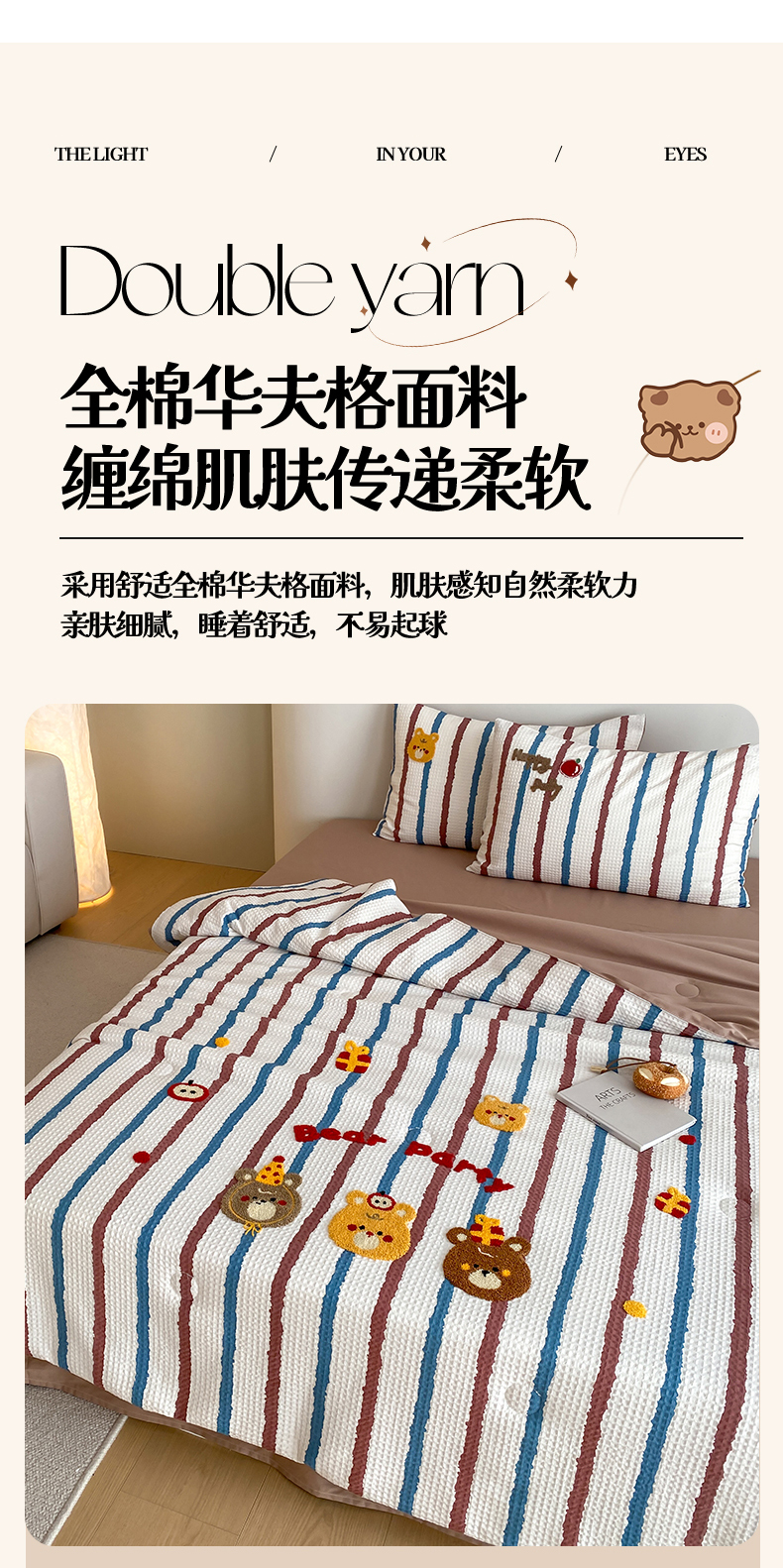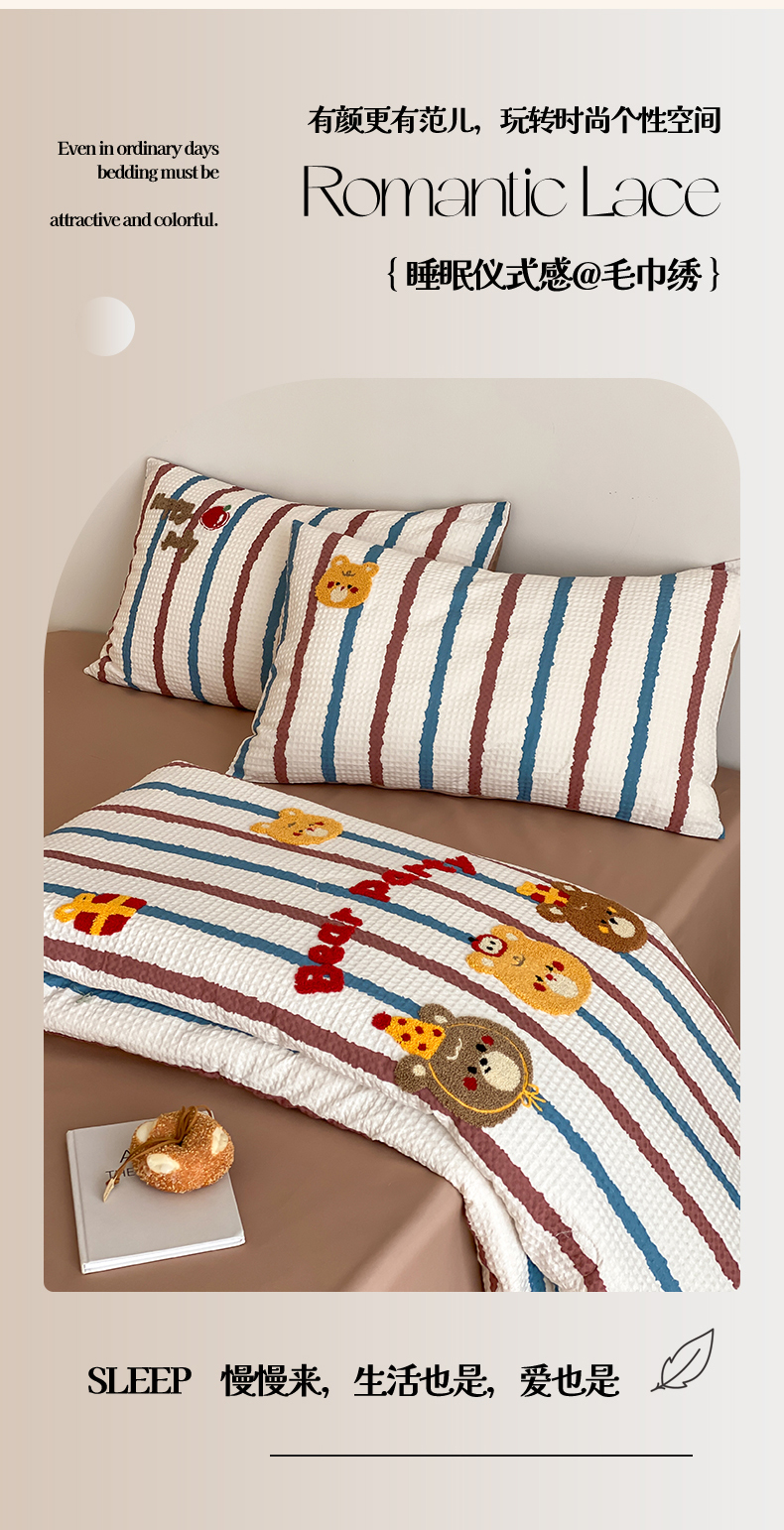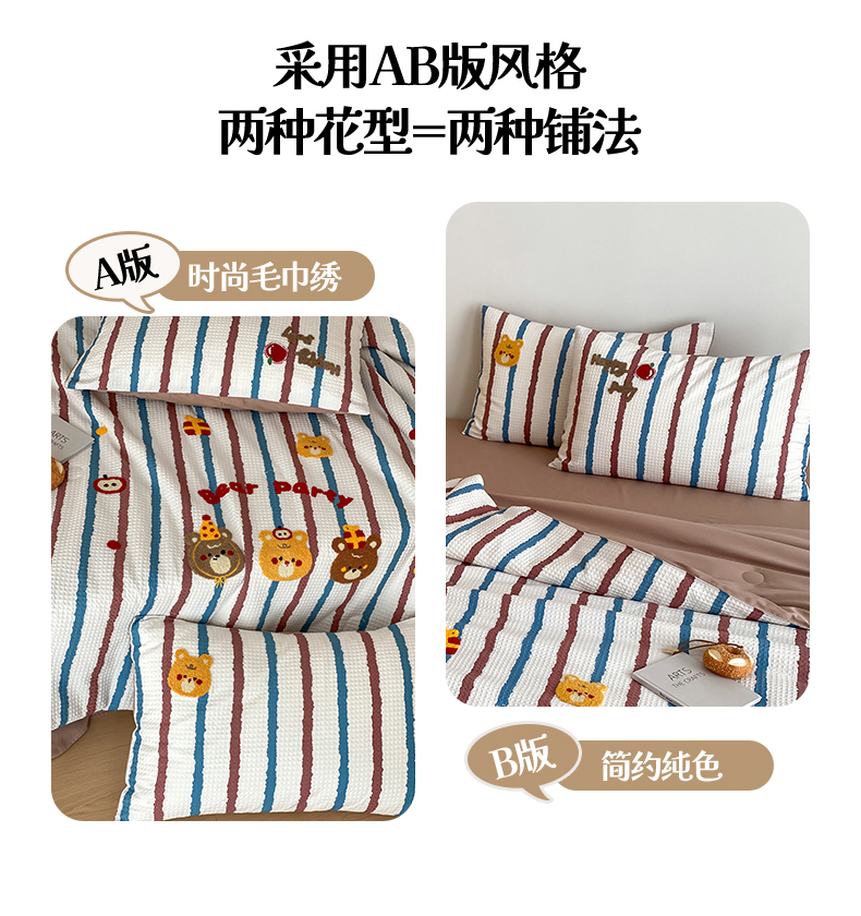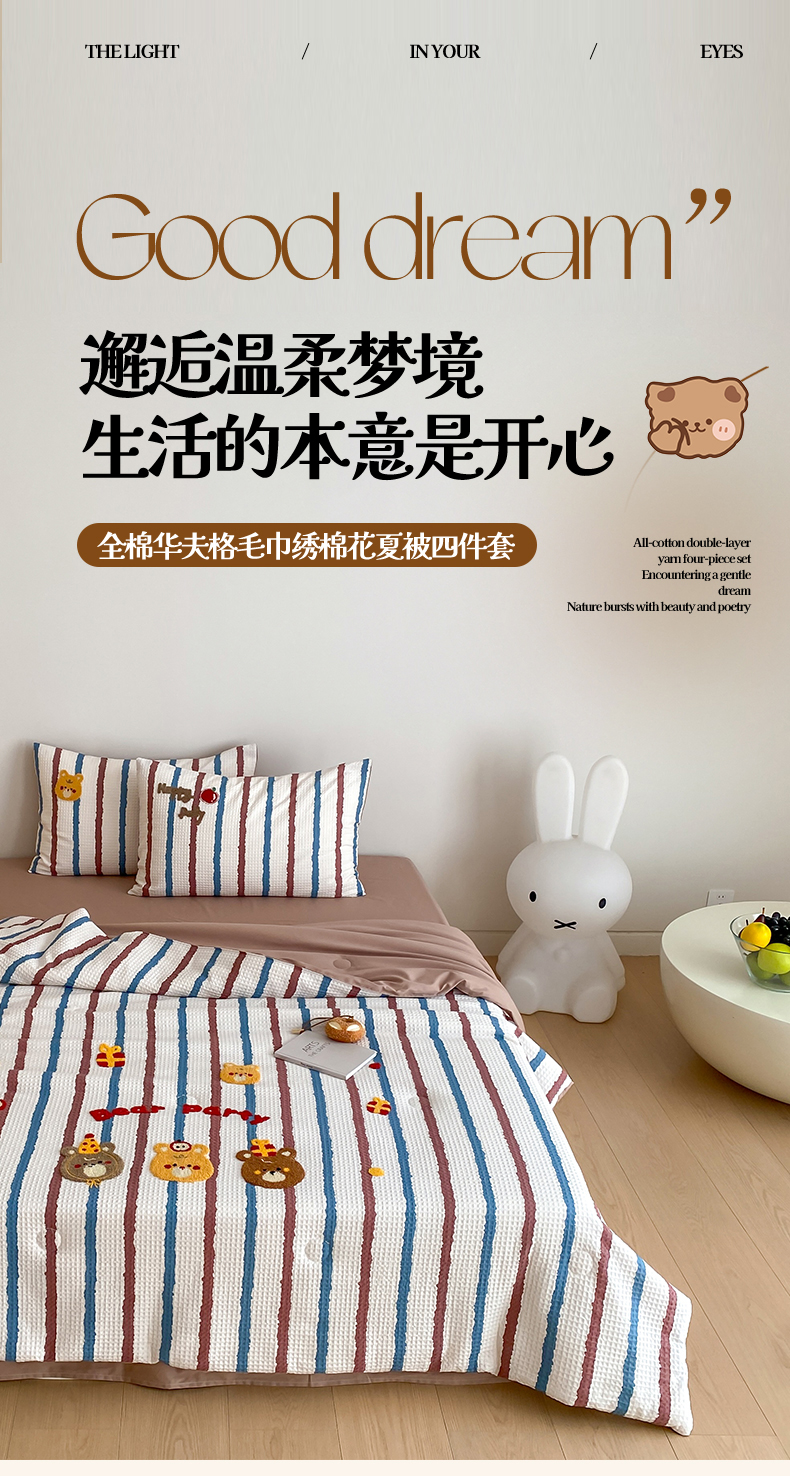 • 91家纺网 家纺一手货源 找家纺 (总)鸣升家纺 2026新款a类全棉华夫格贴布绣全棉夏被四件套空调被芯夏凉被棉花被,乐天雪人,平安兔,圣诞猫,小熊咖条,小熊蓝红条,组合图