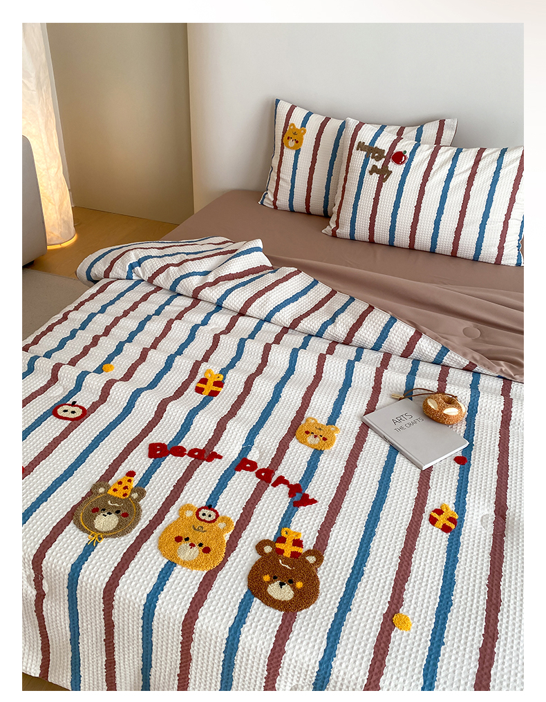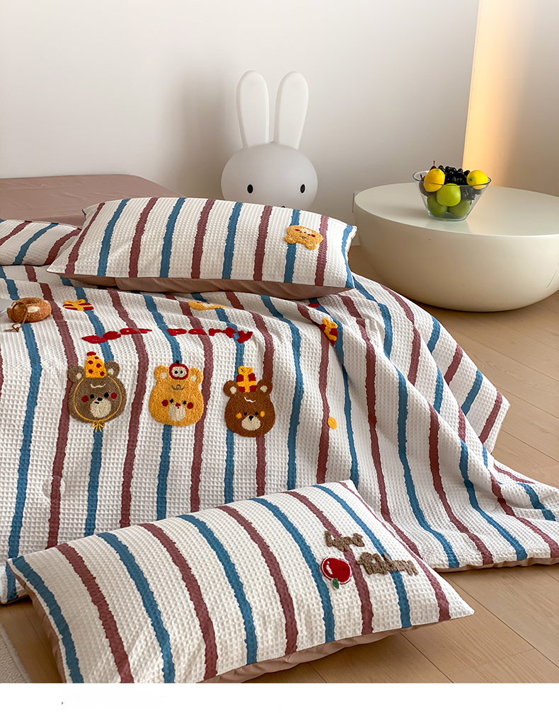鸣升家纺 2026新款a类全棉华夫格贴布绣全棉夏被四件套空调被芯夏凉被棉花被 小熊蓝红条