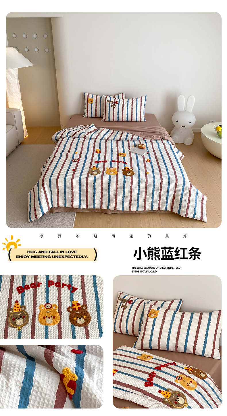 当前位置: 91家纺网 > 商品网购 > 被子 > 夏被 > 鸣升家纺 2026新款a类全棉华夫格贴布绣全棉夏被四件套空调被芯夏凉被棉花被 小熊蓝红条