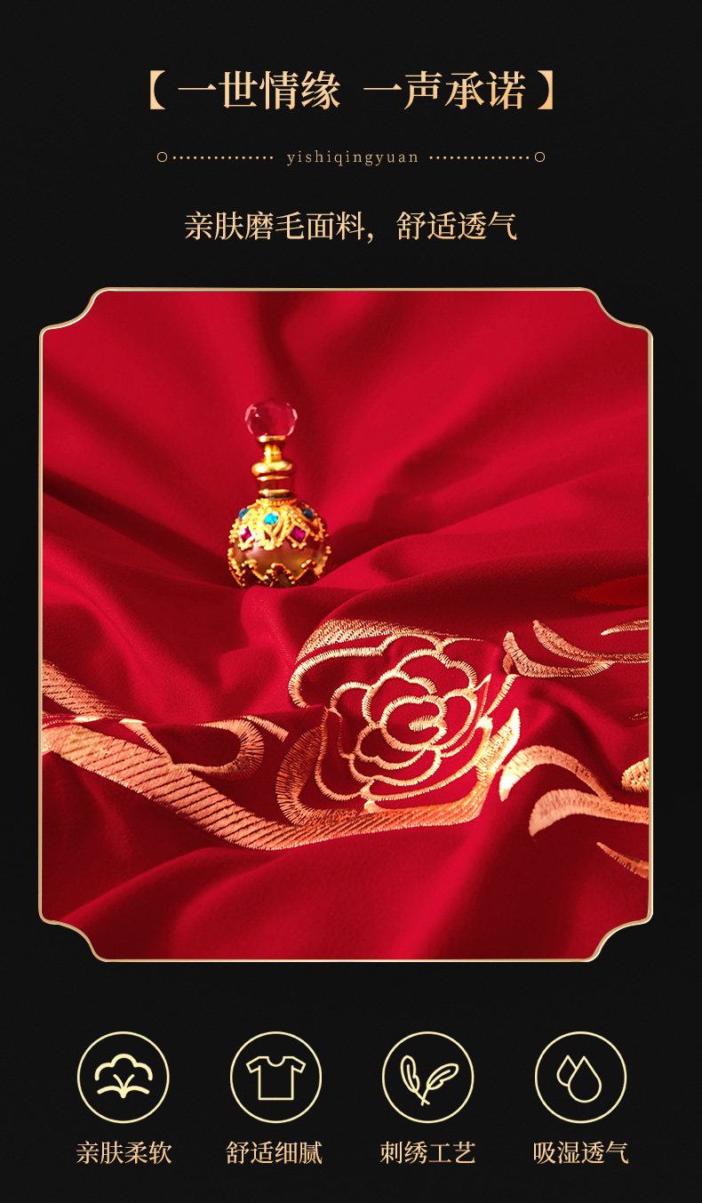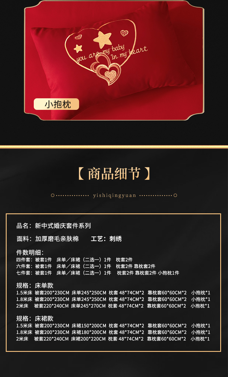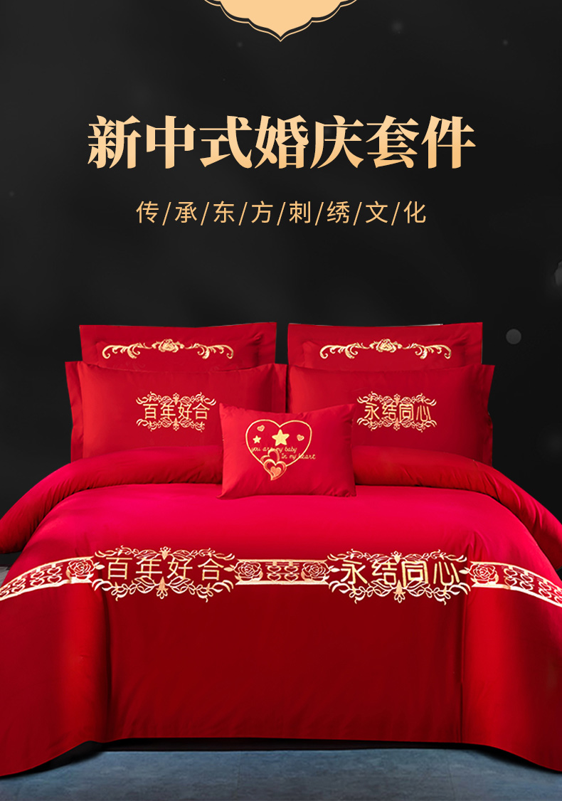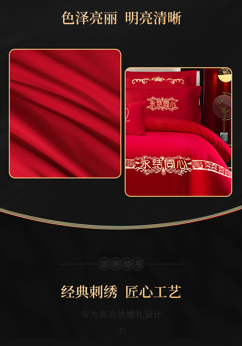 当前位置: 91家纺网 > 商品网购 > 床品套件 > 四件套 > 婚庆四件套 > 慕她家纺 2026年磨毛亲肤棉婚庆四件套大红色刺绣结床上用品 百年同心