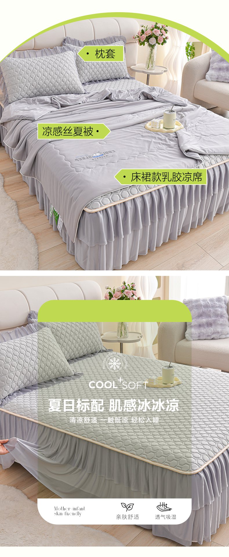 • 91家纺网 家纺一手货源 找家纺 (总)畅畅家纺 2026春夏新款聚乙烯中分子双面提花高克重凉感冰感凉豆豆床裙三件套-经典玫瑰,经典玫瑰-粉,经典玫瑰-灰,经典玫瑰-蓝,经典玫瑰-绿