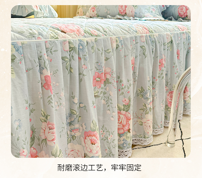商品名称:忘忧草 2026春夏新款全棉纯棉夹棉印花床裙床裙单件 华庭庄园-蓝