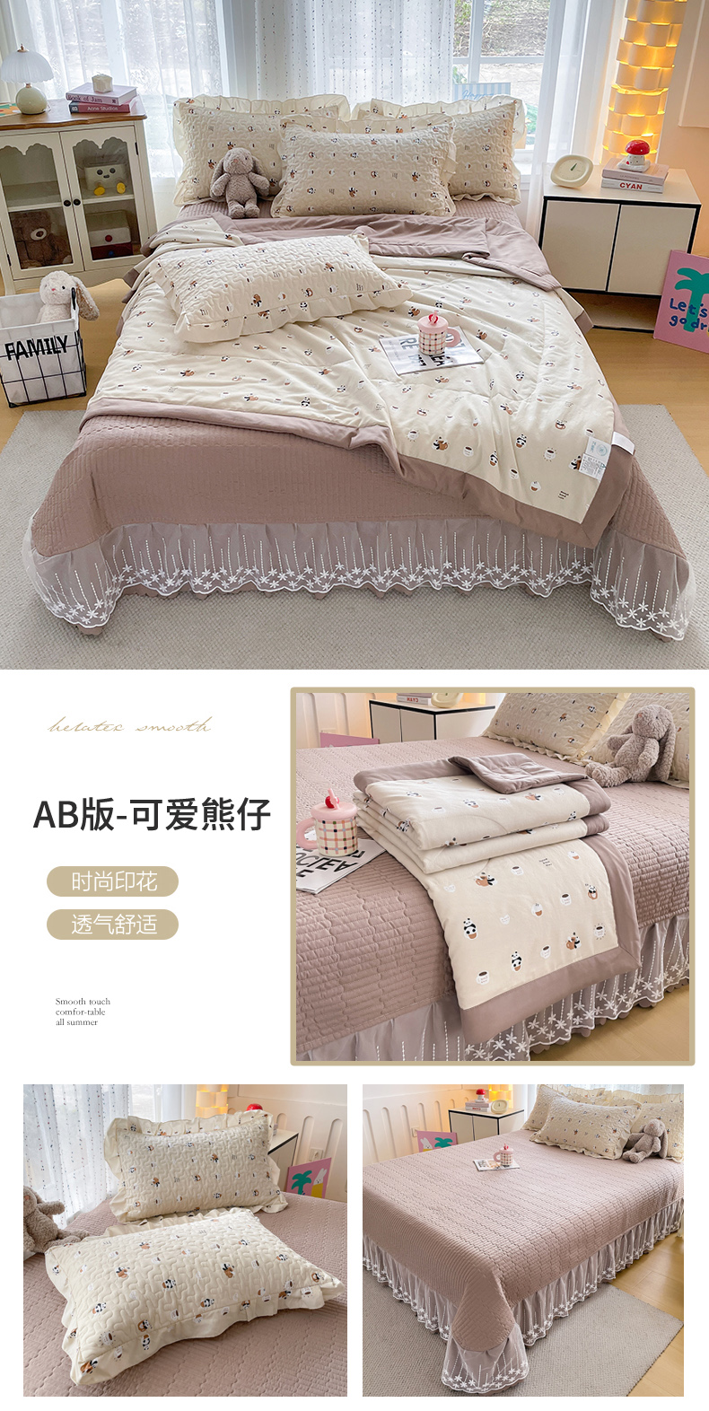 当前位置: 91家纺网 > 商品网购 > 床品套件 > 四件套 > 其它四件套 > 艺慕家纺 2026新款直播热款古法仿棉AB版水洗棉印花双层蕾丝花边夏被床盖四件套 AB版-可爱熊仔