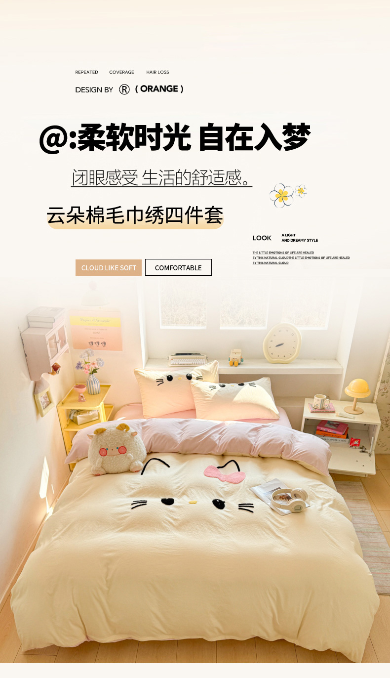(总)雨帆家纺 2026新款云朵棉卡通毛巾绣四件套,草莓熊,奶油甜美猫,奶油尼尼,少女甜美猫,奶黄尼尼